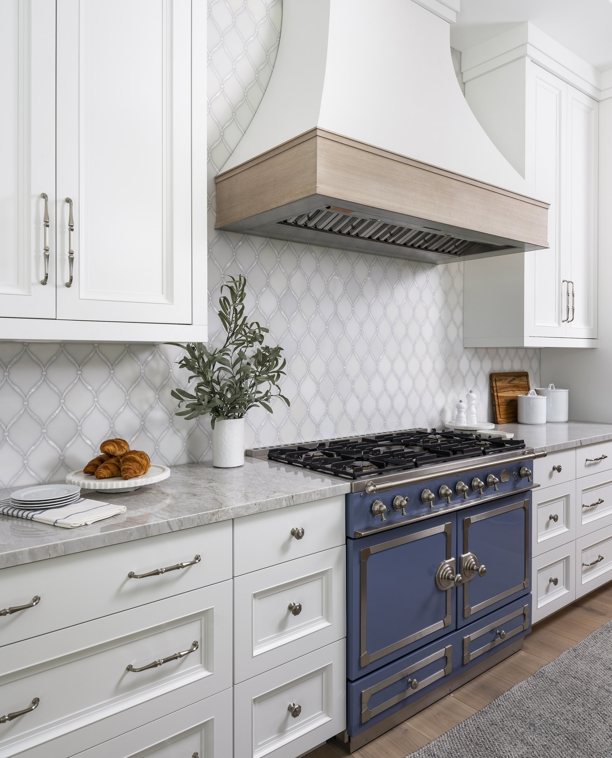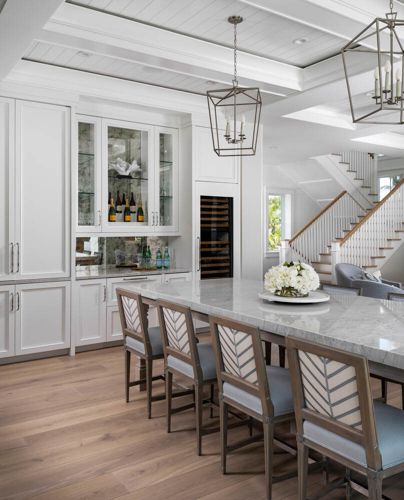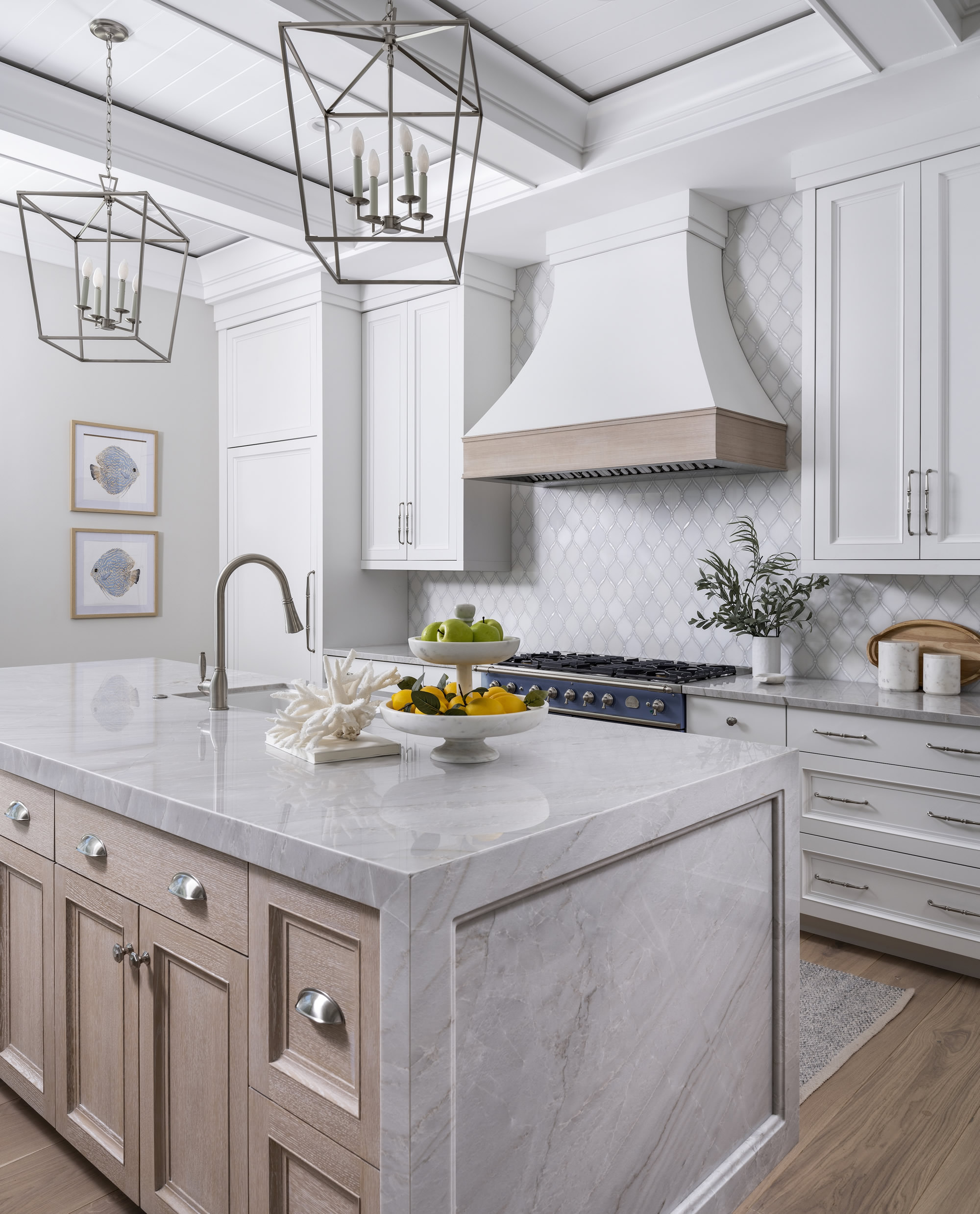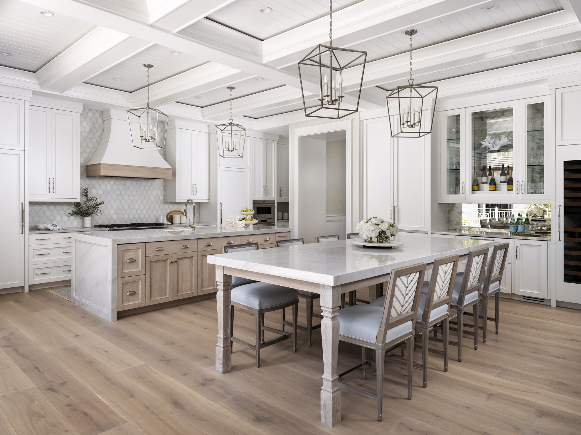 This kitchen blends timeless craftsmanship with modern performance. At its heart are dual islands, the second designed as a fully functional dining table alternative. The main island features Taj Mahal stone surfaces with waterfall sides and a traditional ogee edge, bridging transitional design with modern form. Custom whitewashed white oak fronts and one-inch-thick drawer faces sit atop plywood cabinet boxes for durability. Elsewhere, cabinetry is painted with oil-based finishes. The La Cornue CornuFé range in Provence Blue (43″, with satin nickel and chrome accents) anchors the working side, flanked by a Sub-Zero fridge and freezer. A custom appliance garage features pocketing doors that disappear into the cabinet wall, enabling a clean look despite limited space. A full wet bar with glass-front wine cooler, ice maker, and floating shelves is fully LED backlit for evening ambiance. Ceilings rise to 12.5 feet, finished in tongue-and-groove paneling with exposed 12×12 white oak beams, dropped strategically to conceal HVAC runs. Visual Comfort pendant lights (17w” x 24h”) in satin nickel complement the millwork and provide task lighting. All surfaces — including backsplashes — are Taj Mahal quartzite, with the standout detail being a waterjet-cut shell mosaic: Thassos marble with mother-of-pearl accents in a scalloped pattern that spans more than 35 linear feet. The Rohl fireclay sink (34″ x 20″ x 10″) and Rohl satin nickel faucet complete the material palette with elegance and function. Flooring is Legno Bastone 10″ European white oak plank, tying the kitchen to the rest of the open living space with seamless flow.