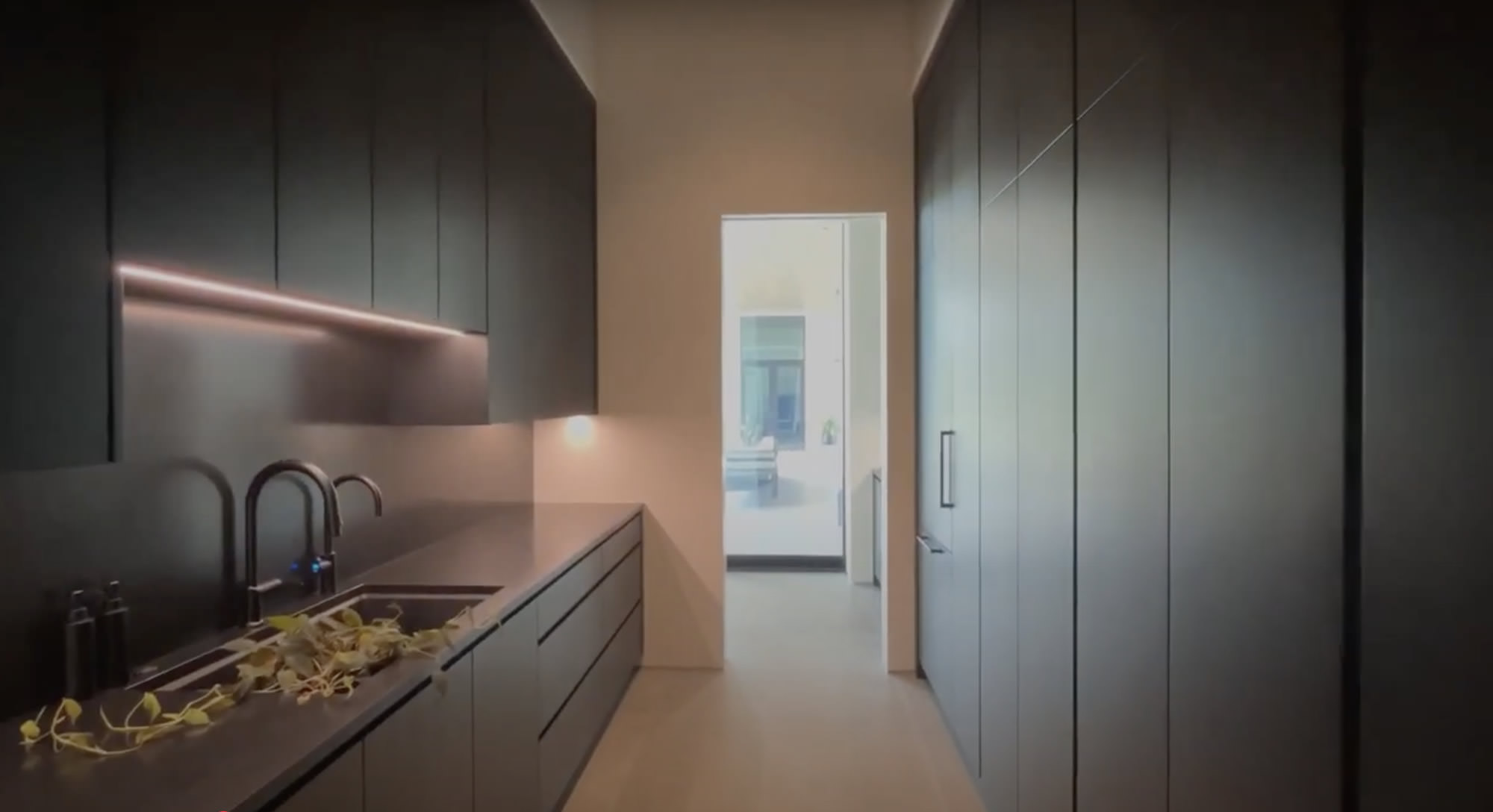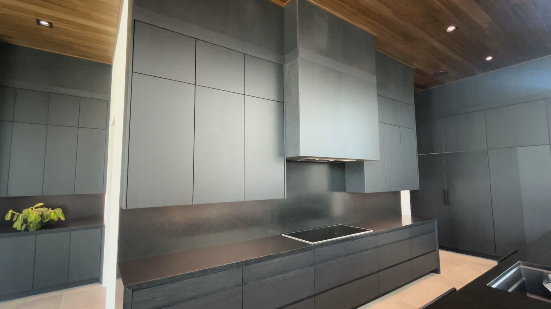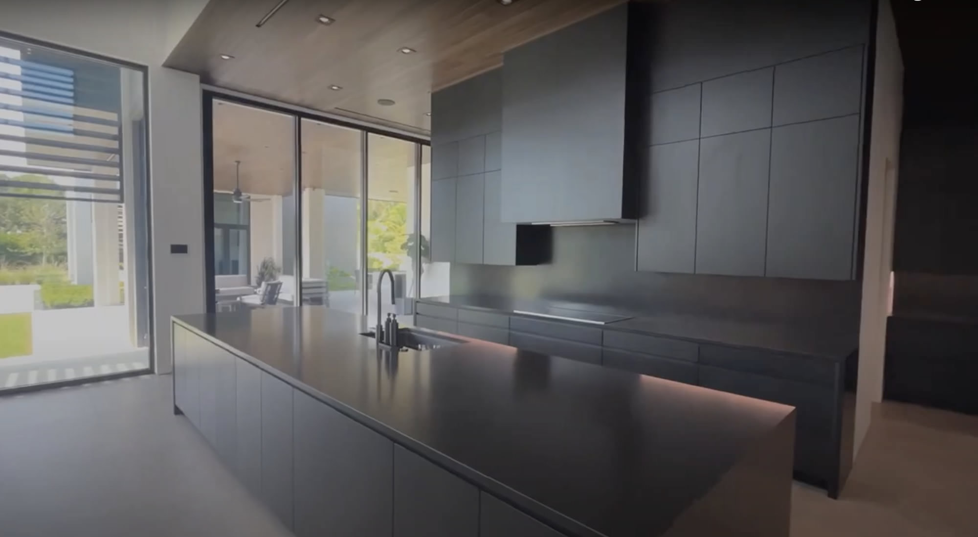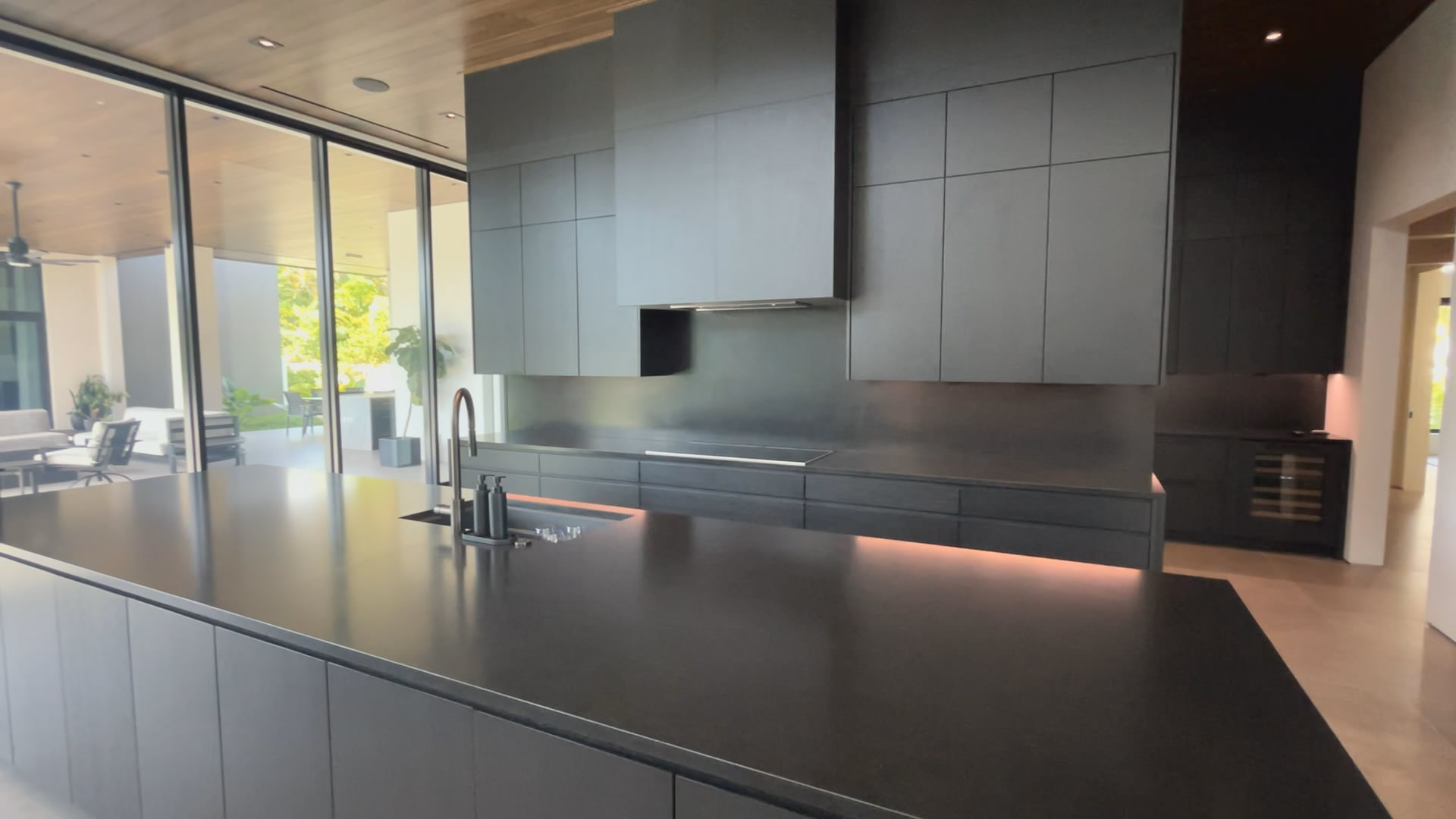 Modern artistry meets functionality in this beautiful kitchen that is framed by the adjoining great room’s 25-foot ceilings and fuses contemporary minimalism with rich, tactile materials. Featuring flat panel rift cut white oak cabinets in black satin that climb to the ceiling, they were specially treated to bring out the wood’s grain, creating visual depth and warmth. The space includes two monumental 15-foot islands wrapped in enhanced granite — one for prep, the other for seating. To accommodate the islands expanse and keep the requested clean look (per the client’s directive), a welder created a solid steel frame that was receded under the 1.25 inch surface. Miele appliances throughout embrace the graphite minimalism while a large hidden pantry makes entertaining effortless. The backsplash is also an enhanced black granite, while the flooring is a rectified large-format Italian porcelain. The ceiling is mahogany that went through a 6-stage bleaching process before it could be stained to the client’s desired hue. The kitchen’s clean lines perfectly match this home’s minimalist ethos while enhancing everyday usability. It’s not just a kitchen — it’s a statement of modern intent.