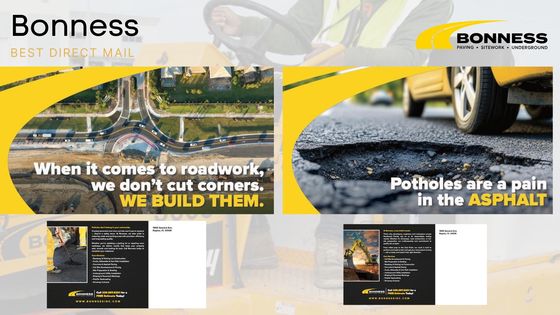 Bonness hired B-Squared Advertising to create a direct mail campaign consisting of 2 specific pieces. The first targeted developers while highlighting the roadwork services Bonness offers. With playful language like “we don’t cut corners, we build them” the reader quickly learns what Bonness offers, while adding credibility to their detailed services.