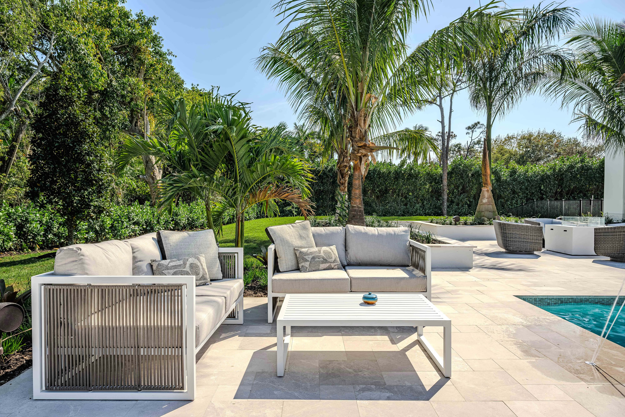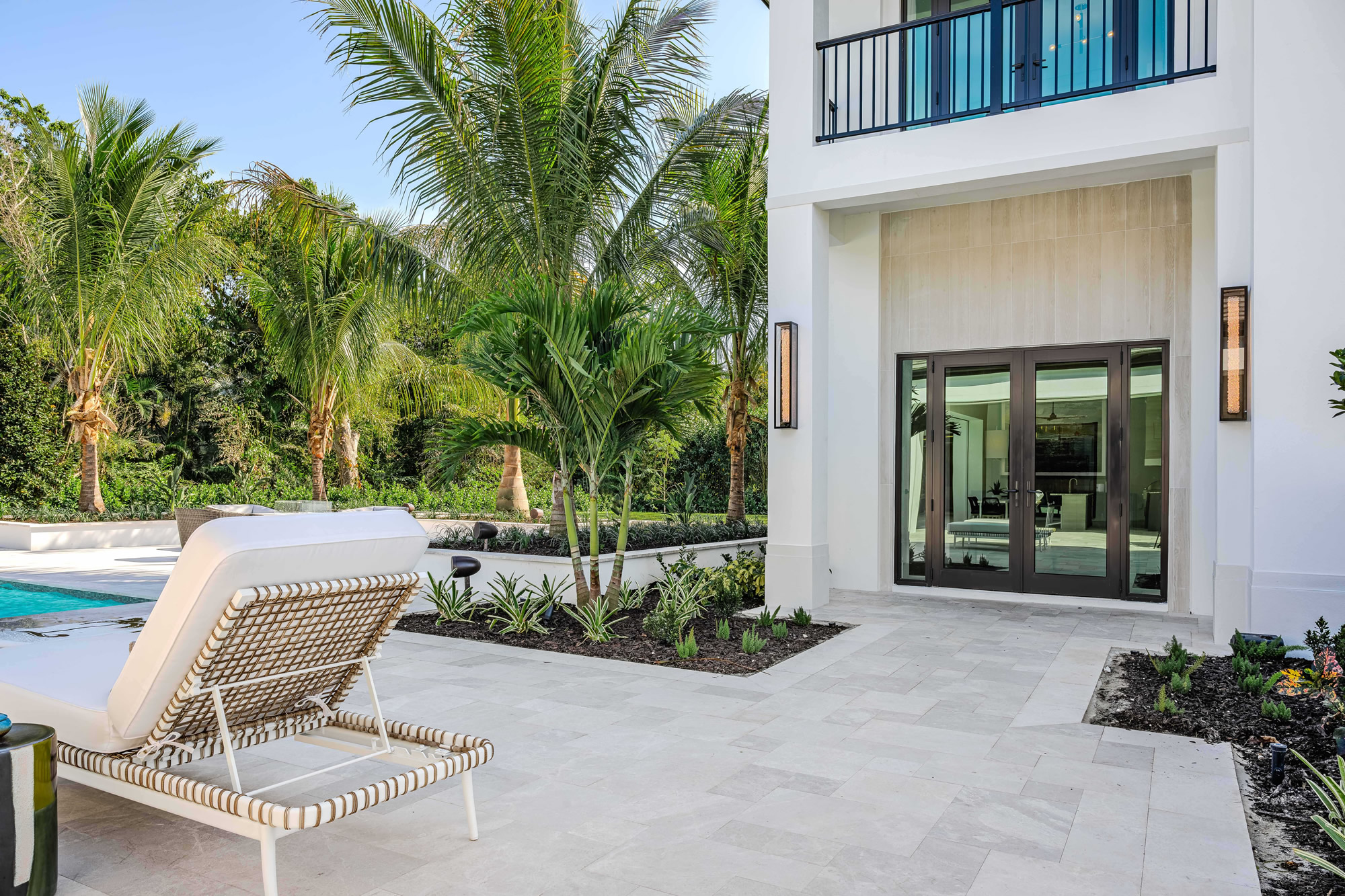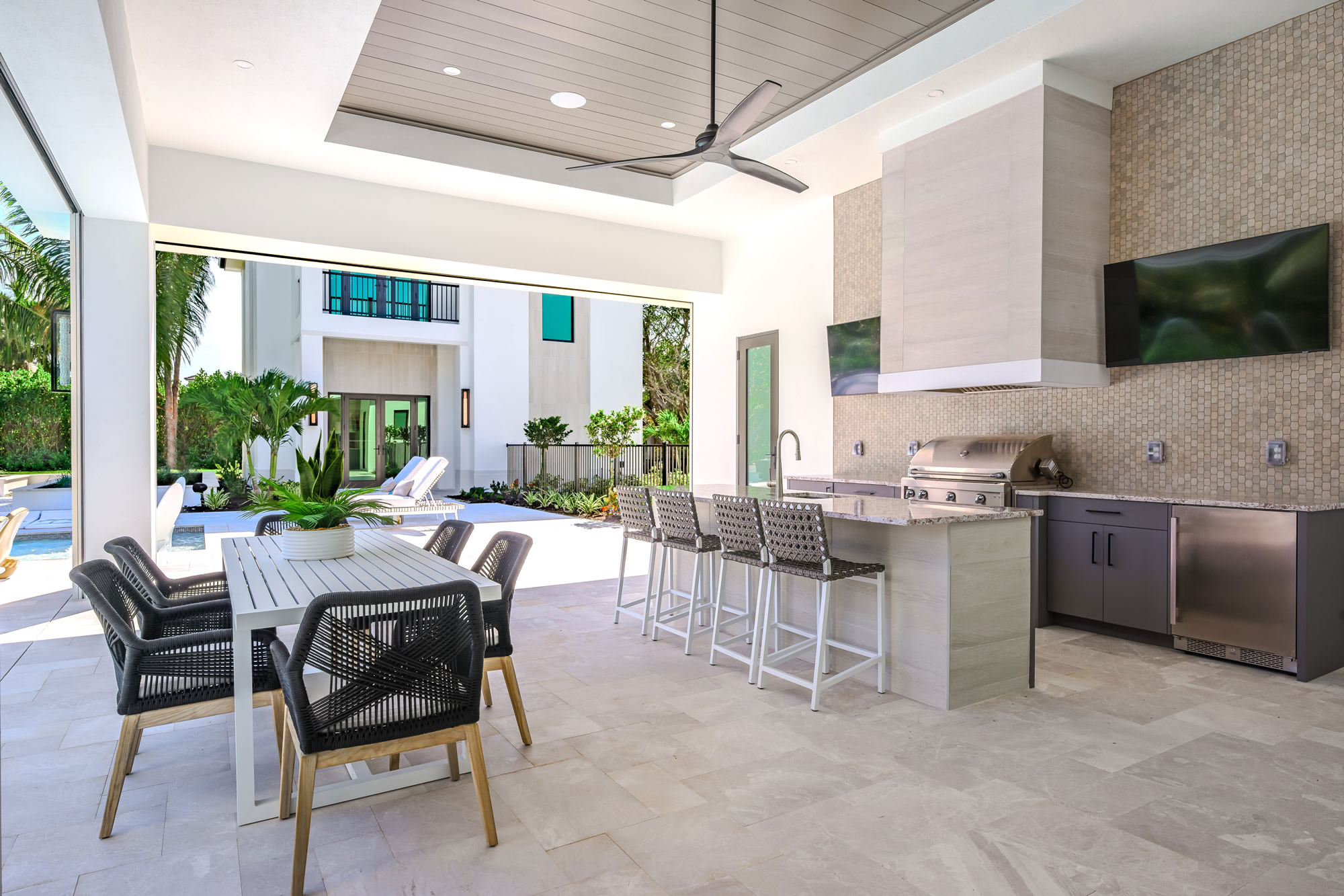 This exceptional outdoor living environment was crafted for luxury homeowners seeking comfort, elegance, and seamless indoor/outdoor integration on a premier corner homesite. Designed for high-end buyers who prioritize elevated outdoor living, the space delivers refined functionality, generous lounging areas, and all-weather durability in line with the estate’s scale and price point. A fully equipped outdoor kitchen with a high-performance Alfresco grill supports full-scale entertaining. Ten dedicated sun loungers invite relaxation, while a built-in firepit adds a social focal point. The 1,600 sq ft covered lanai provides year-round comfort with a built-in fireplace, motorized screens, and hurricane shutters. A private outdoor shower offers added luxury and convenience for poolside living. The layout allows for seamless transitions between indoor and outdoor spaces through expansive sliding glass doors. Zoned seating and activity areas promote effortless flow for entertaining and private retreats alike. Durable materials, energy-efficient motorized screens, and hurricane-rated shutters help regulate temperature and protect furnishings. The nearby saltwater pool contributes to an eco-conscious lifestyle. Every feature—appliances, finishes, and layout—was selected to enhance lifestyle and maximize value relative to the estate’s high-end market tier. The combination of a chef-grade kitchen, resort-style lounging, protective enclosures, fire elements, and a luxury outdoor shower results in a fully immersive alfresco experience. The space was designed not just to complement the home—but to elevate daily living.