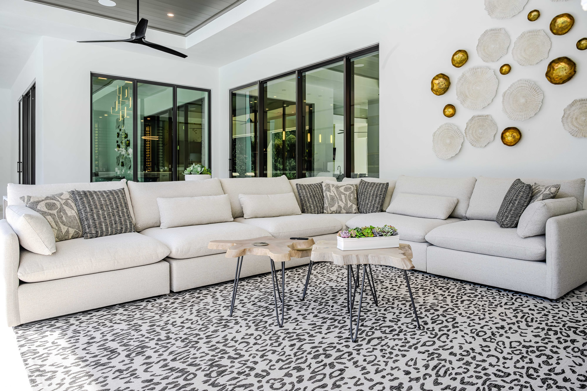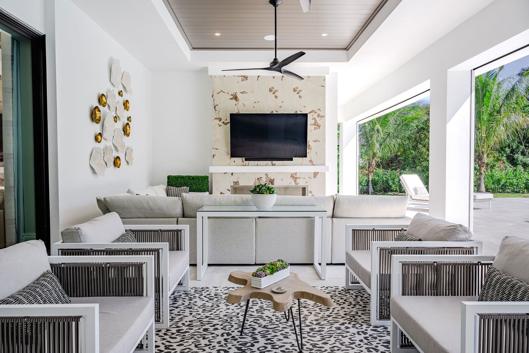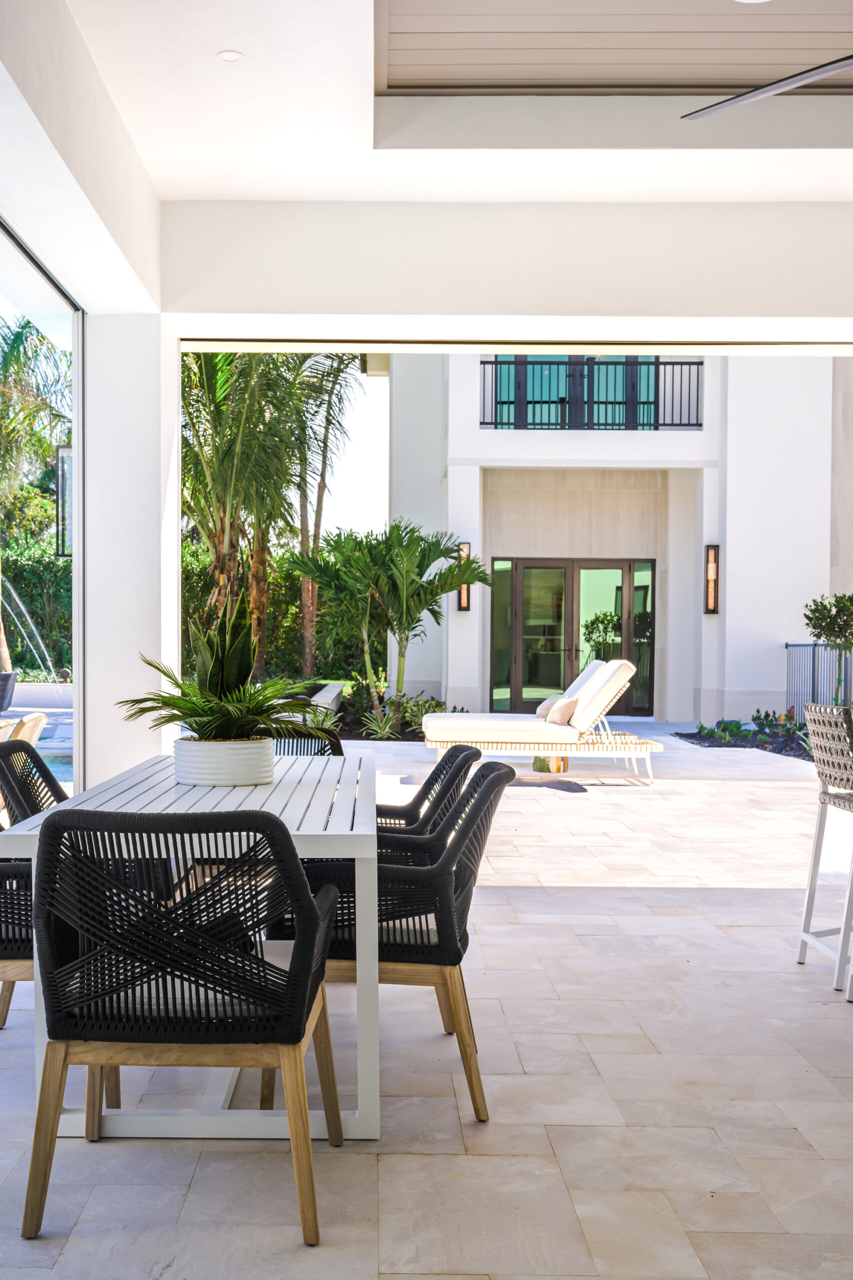 This exceptional outdoor living environment was crafted for luxury homeowners seeking comfort, elegance, and seamless indoor/outdoor integration on a premier corner homesite. Designed for high-end buyers who prioritize elevated outdoor living, the space delivers refined functionality, generous lounging areas, and all-weather durability in line with the estate’s scale and price point. A fully equipped outdoor kitchen with a high-performance Alfresco grill supports full-scale entertaining. Ten dedicated sun loungers invite relaxation, while a built-in firepit adds a social focal point. The 1,600 sq ft covered lanai provides year-round comfort with a built-in fireplace, motorized screens, and hurricane shutters. A private outdoor shower offers added luxury and convenience for poolside living. The layout allows for seamless transitions between indoor and outdoor spaces through expansive sliding glass doors. Zoned seating and activity areas promote effortless flow for entertaining and private retreats alike. Durable materials, energy-efficient motorized screens, and hurricane-rated shutters help regulate temperature and protect furnishings. The nearby saltwater pool contributes to an eco-conscious lifestyle. Every feature—appliances, finishes, and layout—was selected to enhance lifestyle and maximize value relative to the estate’s high-end market tier. The combination of a chef-grade kitchen, resort-style lounging, protective enclosures, fire elements, and a luxury outdoor shower results in a fully immersive alfresco experience. The space was designed not just to complement the home—but to elevate daily living.