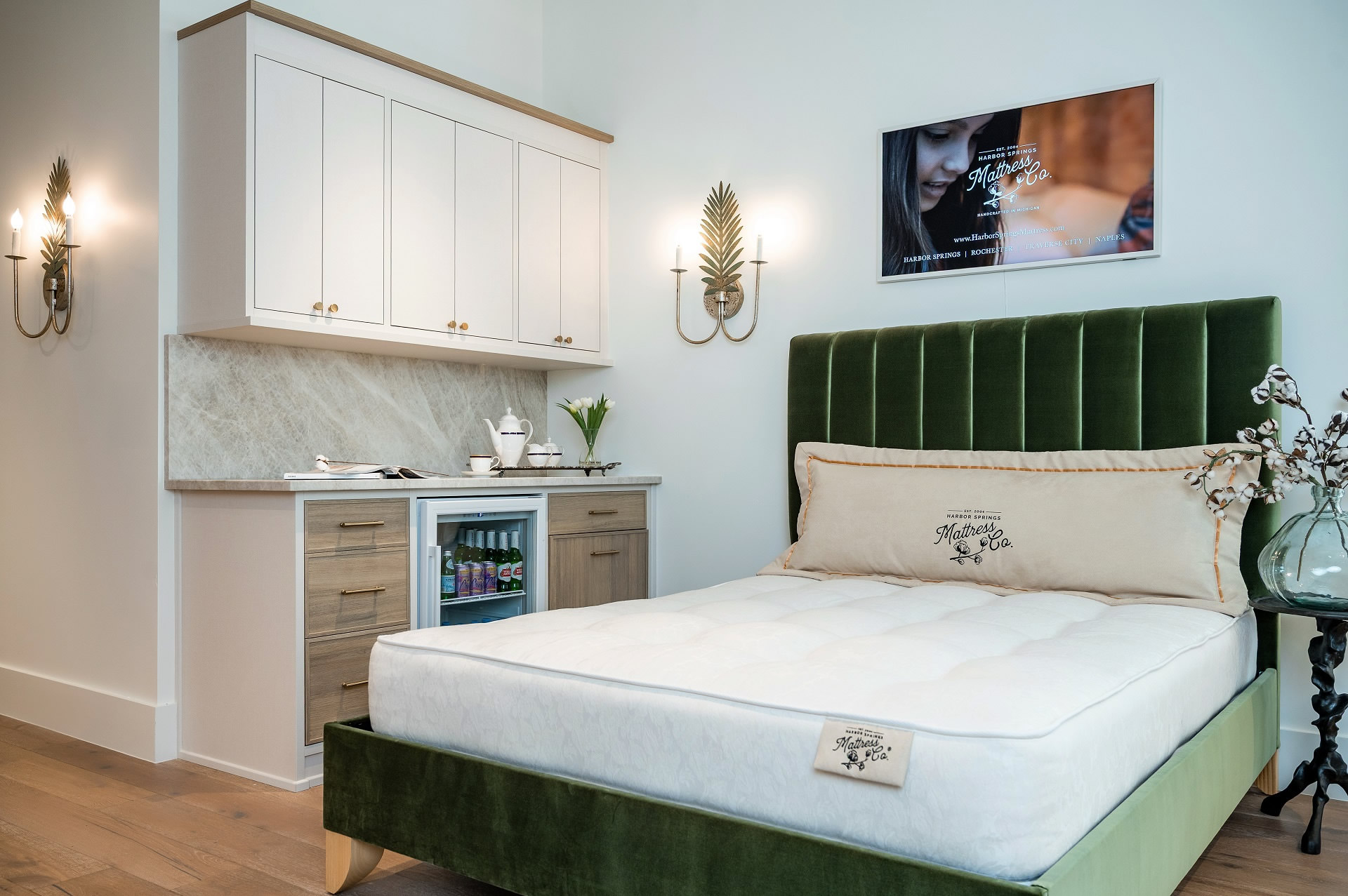 For the mattress vignette, the designer incorporated a dry bar and a functional yet attractive shelving system for sales and samples. This vignette, combined with the office space, made the retail center operational and inviting.
