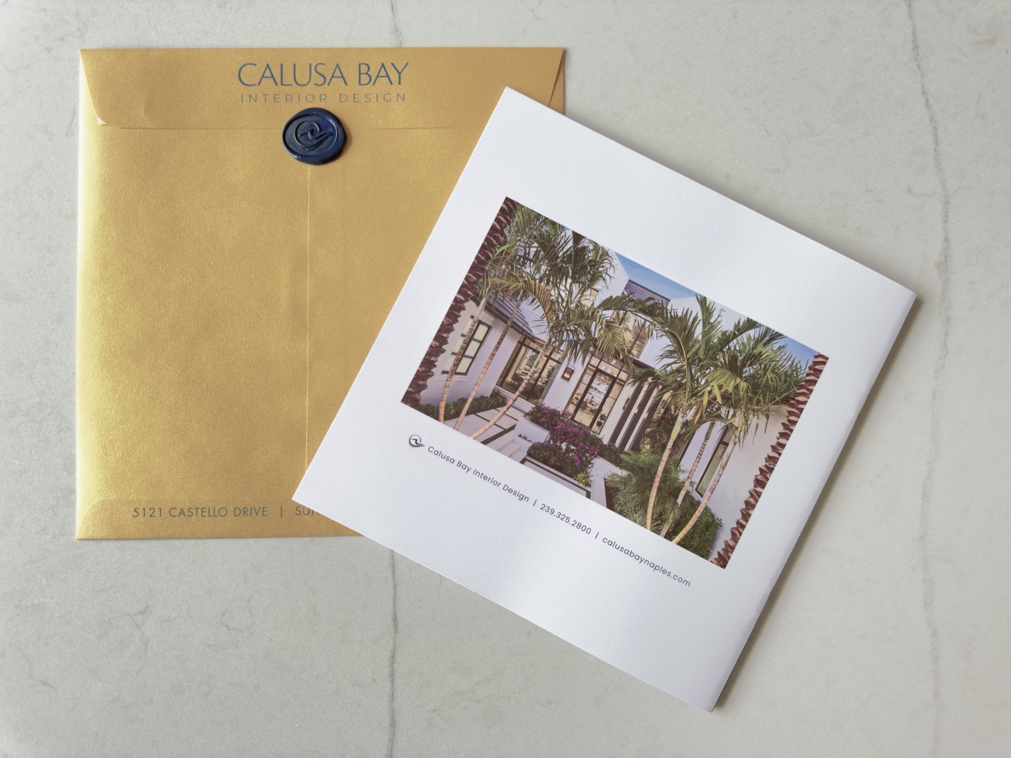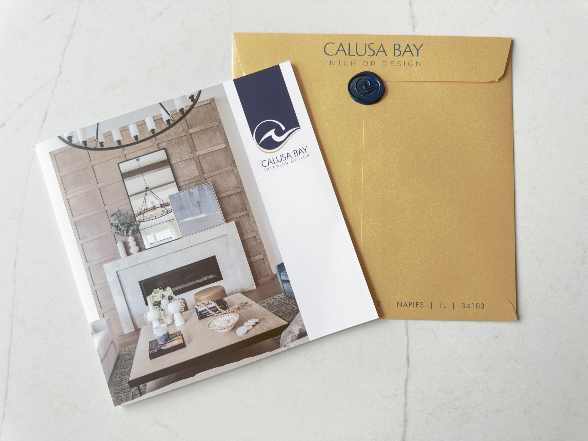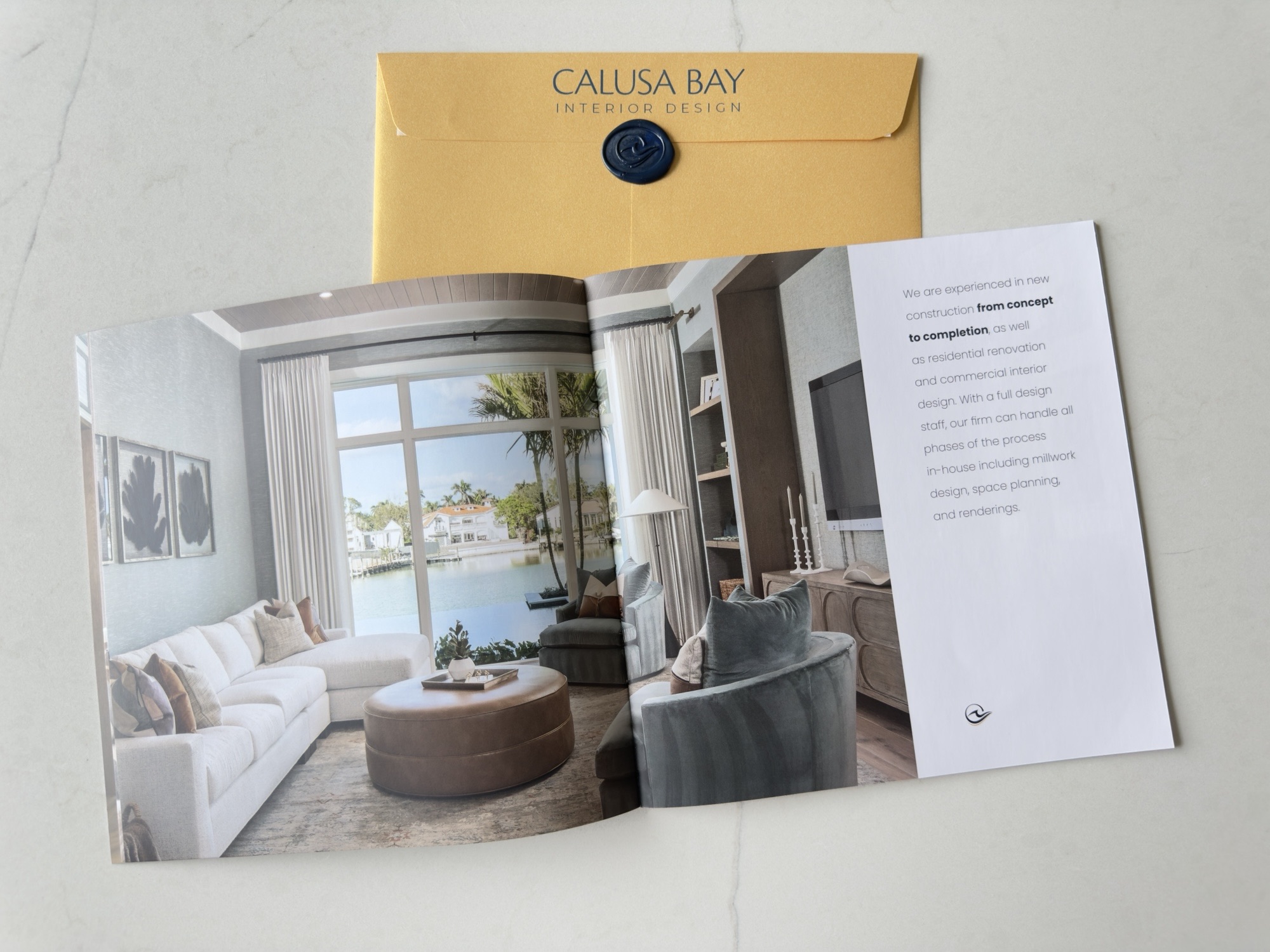 Our latest Calusa Bay Interior Design brochure isn’t just a collection of beautiful images. It’s a visual manifesto. We started with thousands of photographs from recent projects and chose only 29 that said exactly what we needed them to say: This is who we are. This is what we do. In the modern vision of our company’s style. Every image was selected not just for beauty, but for clarity. Each one reflects our ability to balance scale, light, texture, and tone while delivering livable, luxurious environments. From bold transformations to subtle refinements, these spaces demonstrate our signature approach to whole-home design and remodeling: tailored, thoughtful, approachable and seamless from start to finish. The brochure’s layout is just as intentional. Expect a rhythm of full-bleed moments, detail-rich vignettes, and smart collages that mirror the layering we bring to our interiors. Our brand voice is threaded throughout, along with testimonials that speak for themselves. And yes, we obsessed over the tactile side, too. The square format stands out. The mix of glossed finished photographs with a matte aqueous coating to give it a soft sued-like finish, creates the perfect touchable in-hand experience. The print feels as elevated as the work inside.