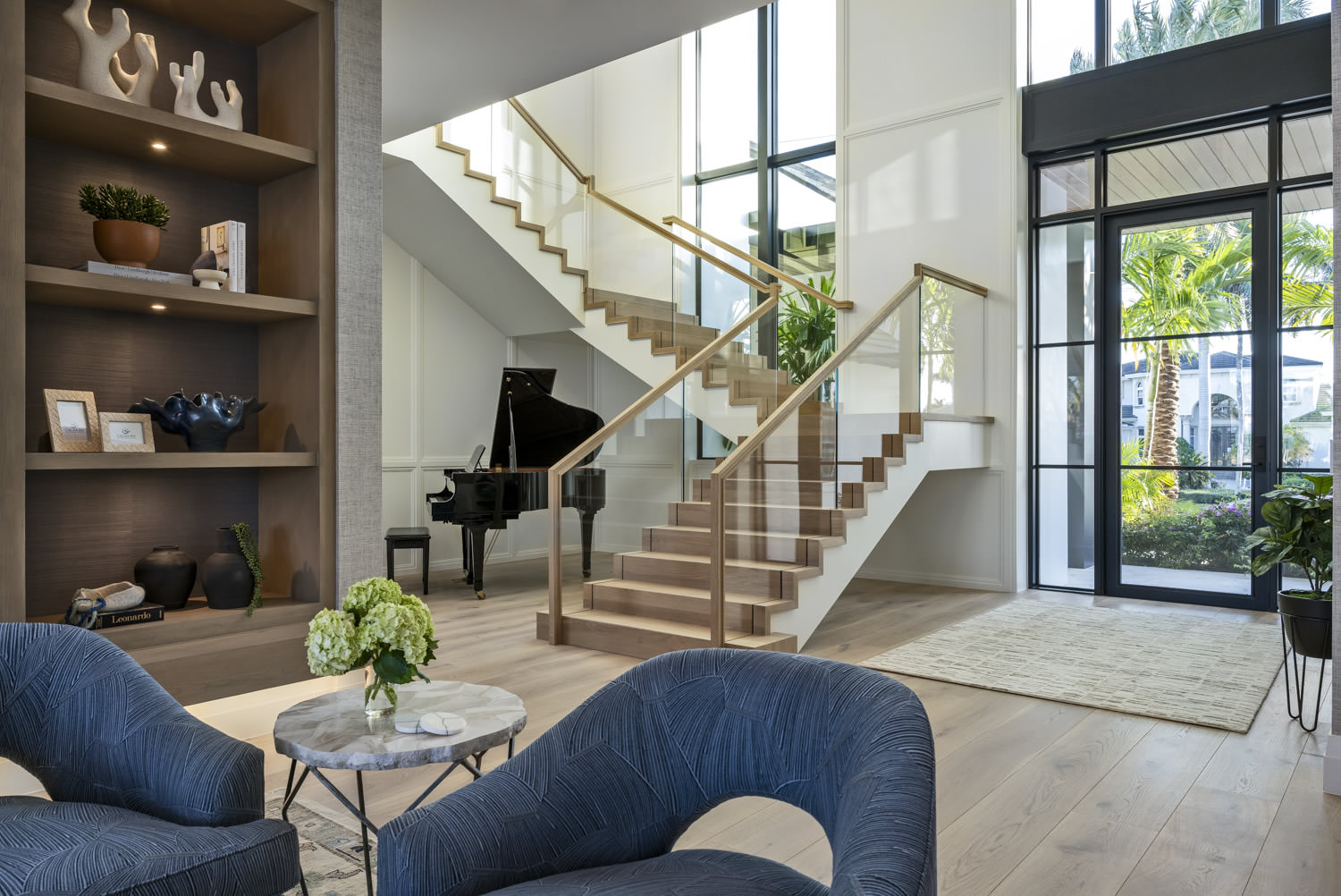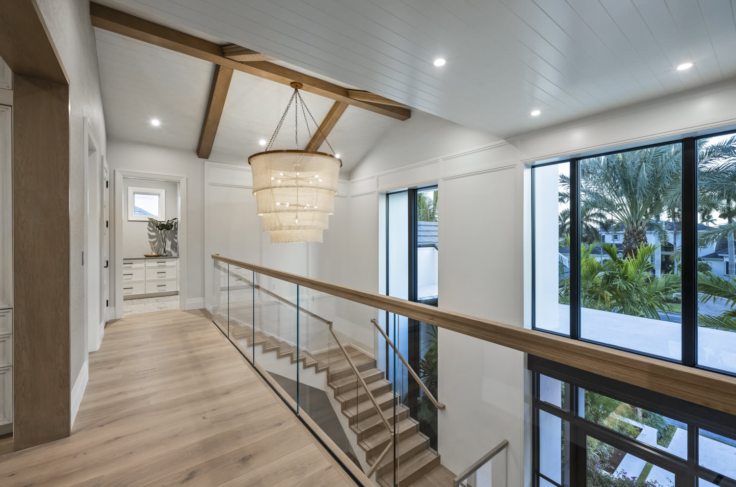 This staircase is truly a work of art. The floating appearance offers and airy weightlessness that this open space deserves. The stair treads and risers are white oak, and have been finished to match the wood floor throughout the home. The stair tread and riser detail has been carried to the edge of the stairs for a contemporary and clean look. The stair railing is a simple combination of glass panels and a white oak railing. The glass panels continue to give this massive staircase the open feel that we were going for. The underside of the floating staircase did not go untouched. We opted to panel the bottom in wood painted to match the trim. This offers a smooth and contemporary finish to the stairs. Situated behind the staircase, is a floor to ceiling window that extends clear up to the second floor of the home. This window, and its expansive height, add to the desired airy feel that we were going for in this staircase. The interior of this window was painted black to complement the black metal and glass front door that leads you into the home. The adjacent walls have been fully paneled in a contemporary layout that additionally accents the height of the space. The panels have a narrow stile, and a simple double step detail. A grand piano sits in the open space of the staircase on the ground floor. The perfect spot for acoustics. On the second floor an oversized chandelier hangs from the ceiling to give ambient light to this stairwell. The chandelier has a brass frame, and tiers of handwoven coco beads in an off-white coloring. The glass panel and wood railing continue along the open hallway that leads to the second floor bedrooms, and lounge area. This stairwell is such a focal point of the home, so we wanted to keep the details unique, but timeless nonetheless.