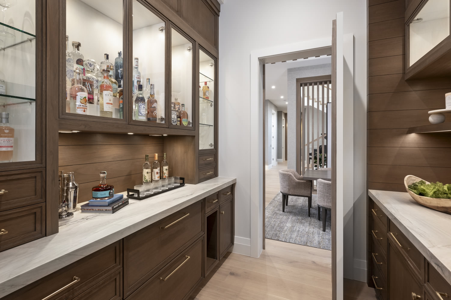 The custom cabinetry throughout the home was designed to stand out as a focal point, but not stray from appeal. The kitchen cabinetry has a rich paint and glaze finish which is wonderful upgrade from a flat white painted cabinet. It not only adds depth, but also a hint of formality. The base cabinets at the range wall, as well as the double islands, are fabricated in walnut, and stained in a rich warm finish. The tone is slightly darker than the other wood elements in the home for that added warmth. These finish combinations can be found throughout the rest of the homes’ custom cabinetry for that attention to detail and harmony.