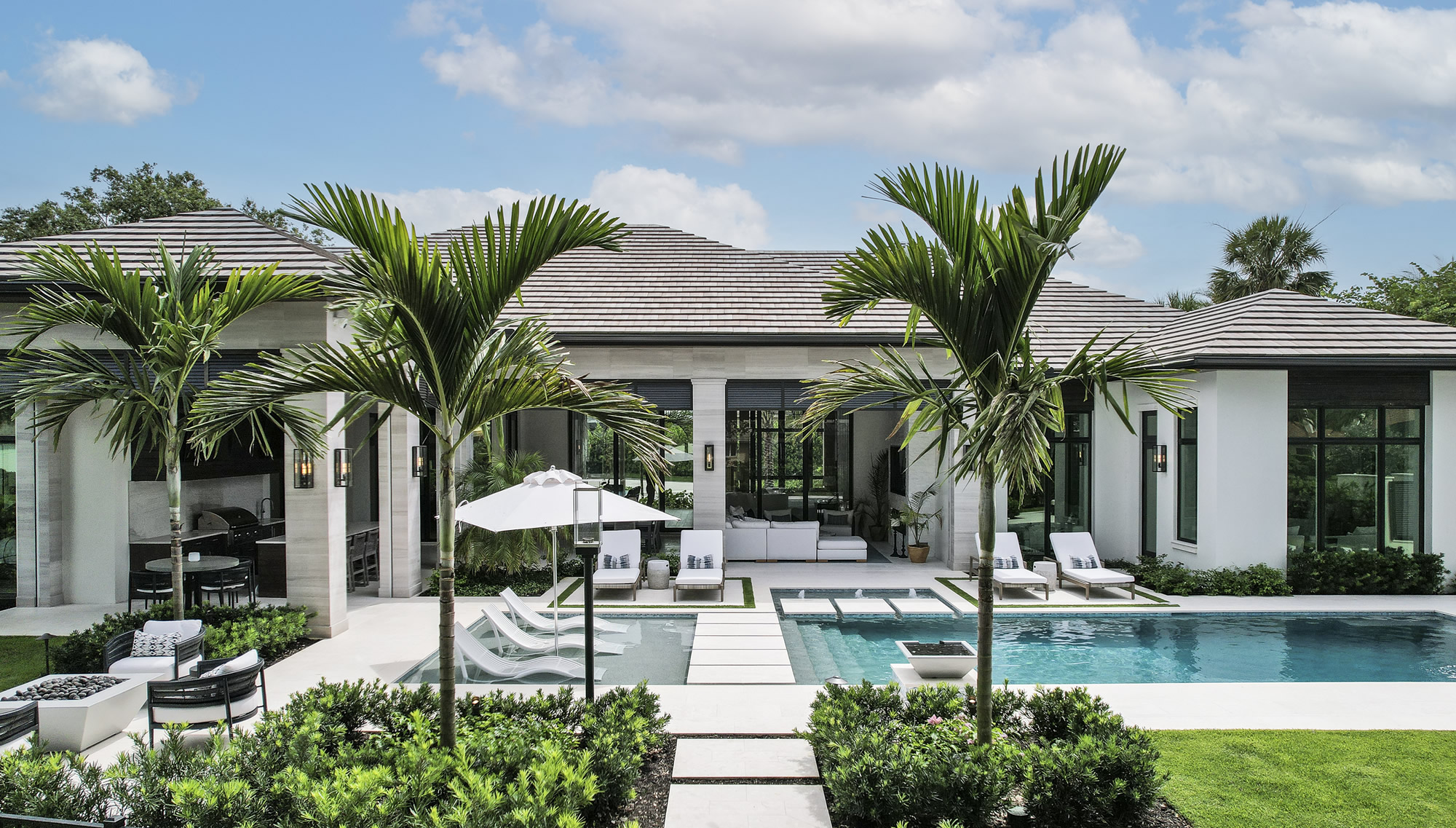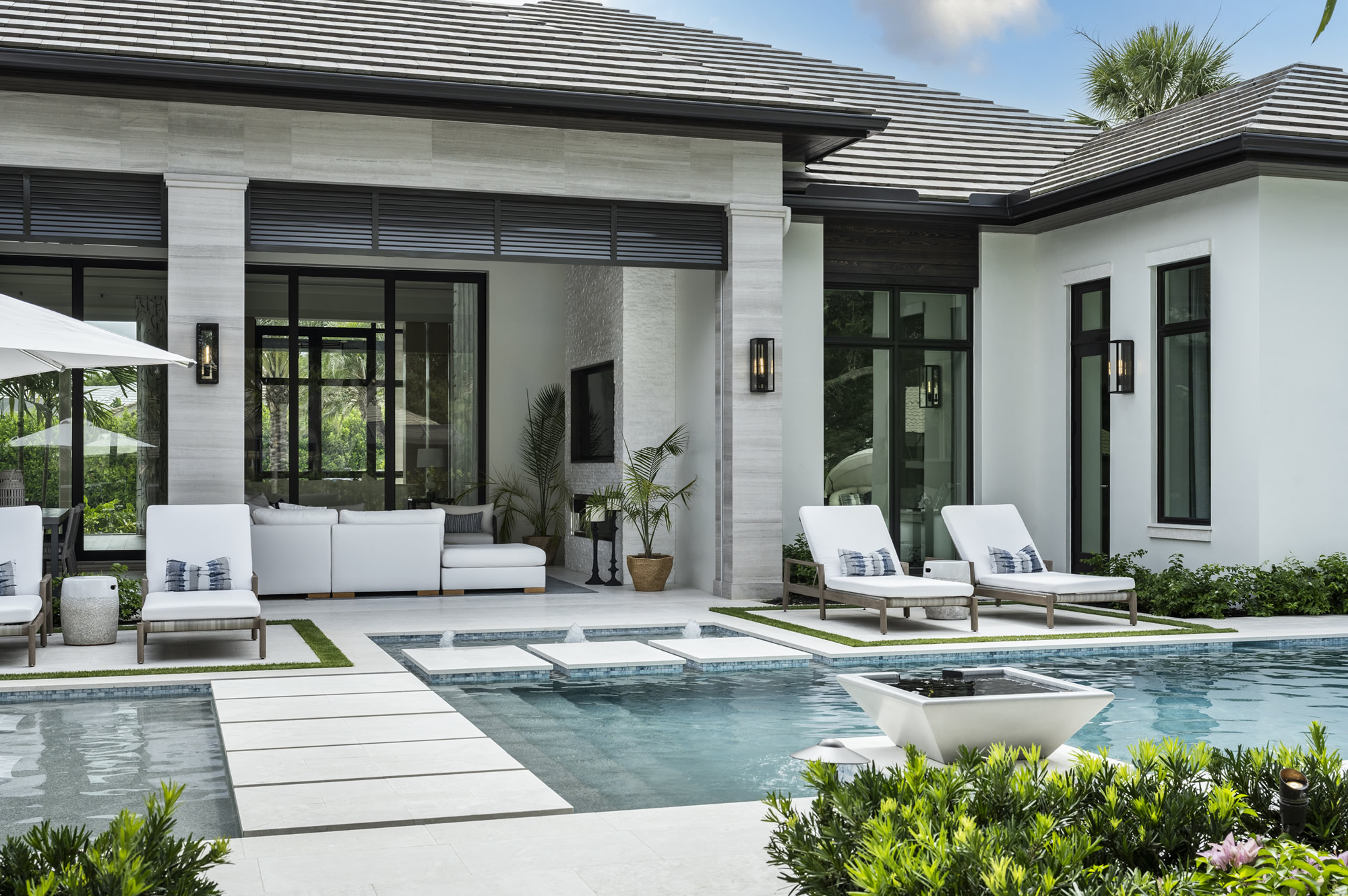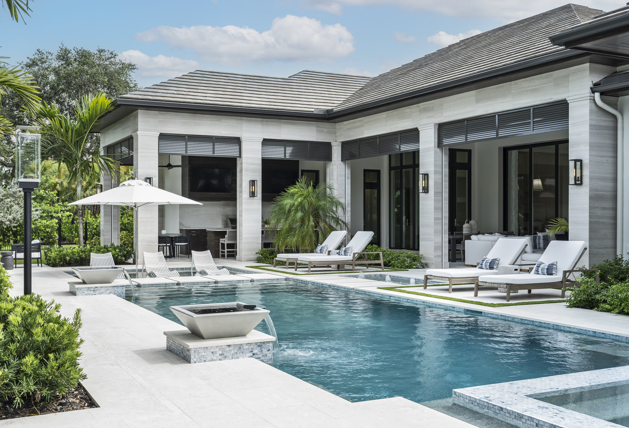 This resort-style outdoor oasis effortlessly transports you into vacation mode right in your own backyard, where the pool deck finished in casual shell stone pavers, frames a stunning medium-blue pebble pool. Iridescent glass waterline tile shimmers above the water’s edge and wrap around the infinity-edge spa. Design elements such as bubblers, fire-and-water bowls, steppingstones with turf inlayed, and a sun shelf create a sense of luxury and serenity. Sleek white chaise lounges sit partially submerged at the sun shelf overlooking the pool. The pool deck was designed to offer a variety of seating settings for relaxation and socializing. You can enjoy the fire table on cold nights or leisurely lounge in the daybed while reading a book.