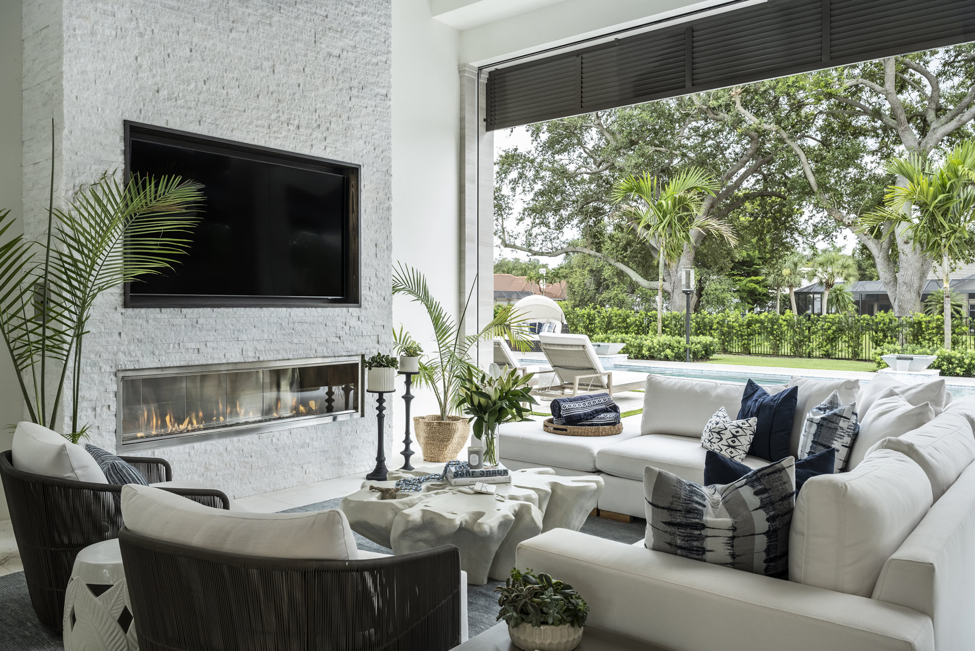 Anchoring the far end of the covered lanai, an electric fireplace is the focal point on the ledgestone wall. A framed flat screen TV sits recessed in matching cypress trim on the natural stone. Dark toned cypress v-groove tongue and groove are clad onto the pitched ceiling and stained to match the cypress at the summer kitchen. The outdoor sectional and swivel lounge chair make for a cozy lounge area from the sun on summer days. The homeowners love enjoying the serene atmosphere of this outdoor retreat.