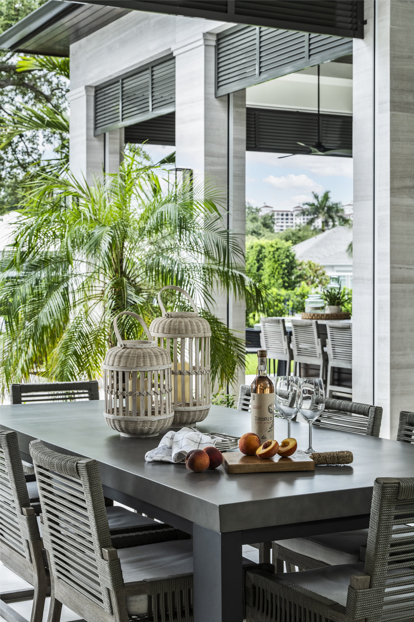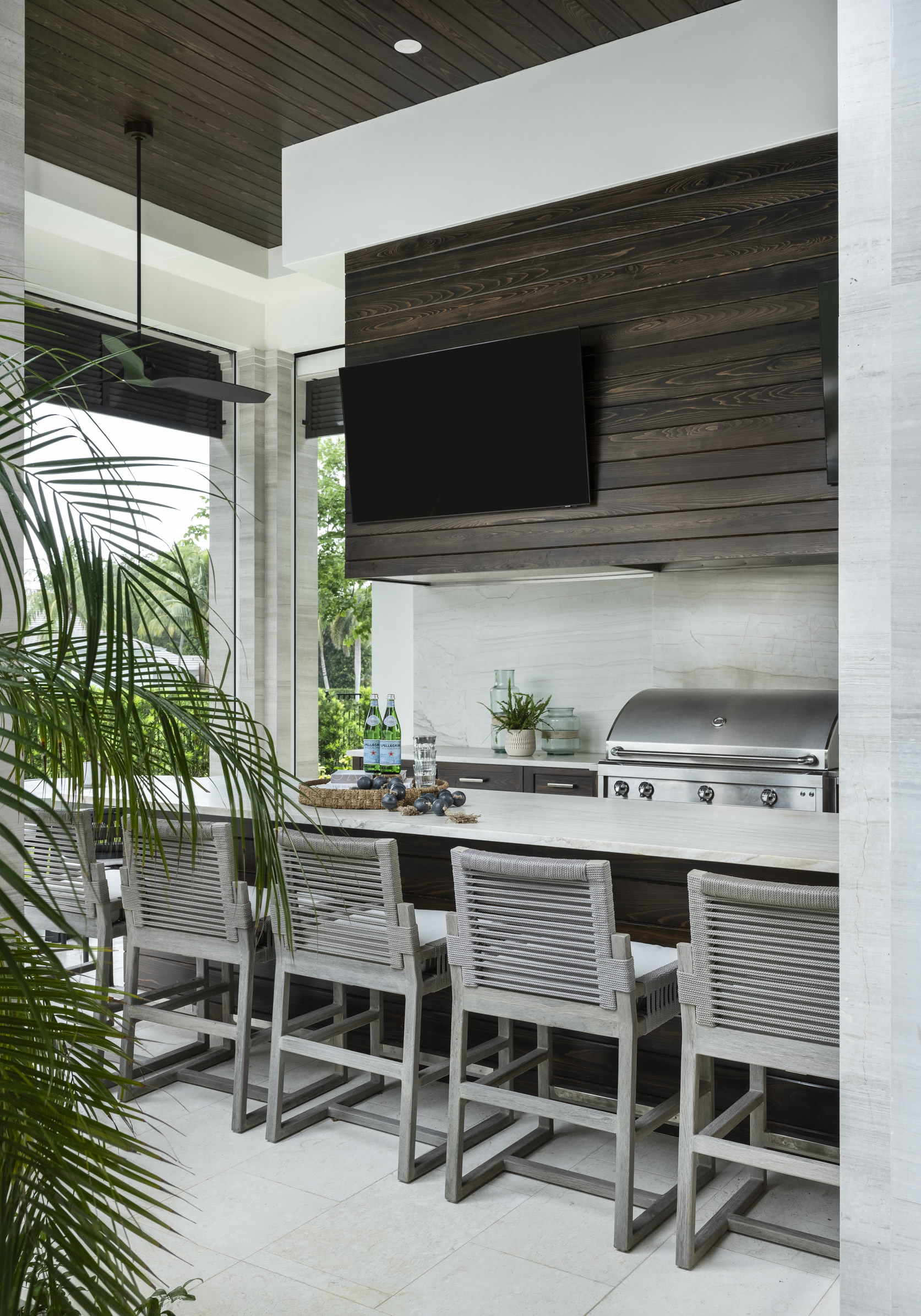 Under cover, the outdoor summer kitchen has a large hood wall in a stained cypress to match the dark stain and material overhead. Two large TV’s sit recessed in the overhead hood soffit for viewing from a counter stool at the large island. The island is fully functional with storage on the working side and stained cypress on the front. Stunning White Luxe quartzite runs up from the counter onto the back wall in a leathered finish. For larger parties, the outdoor dining table comfortably seats eight.