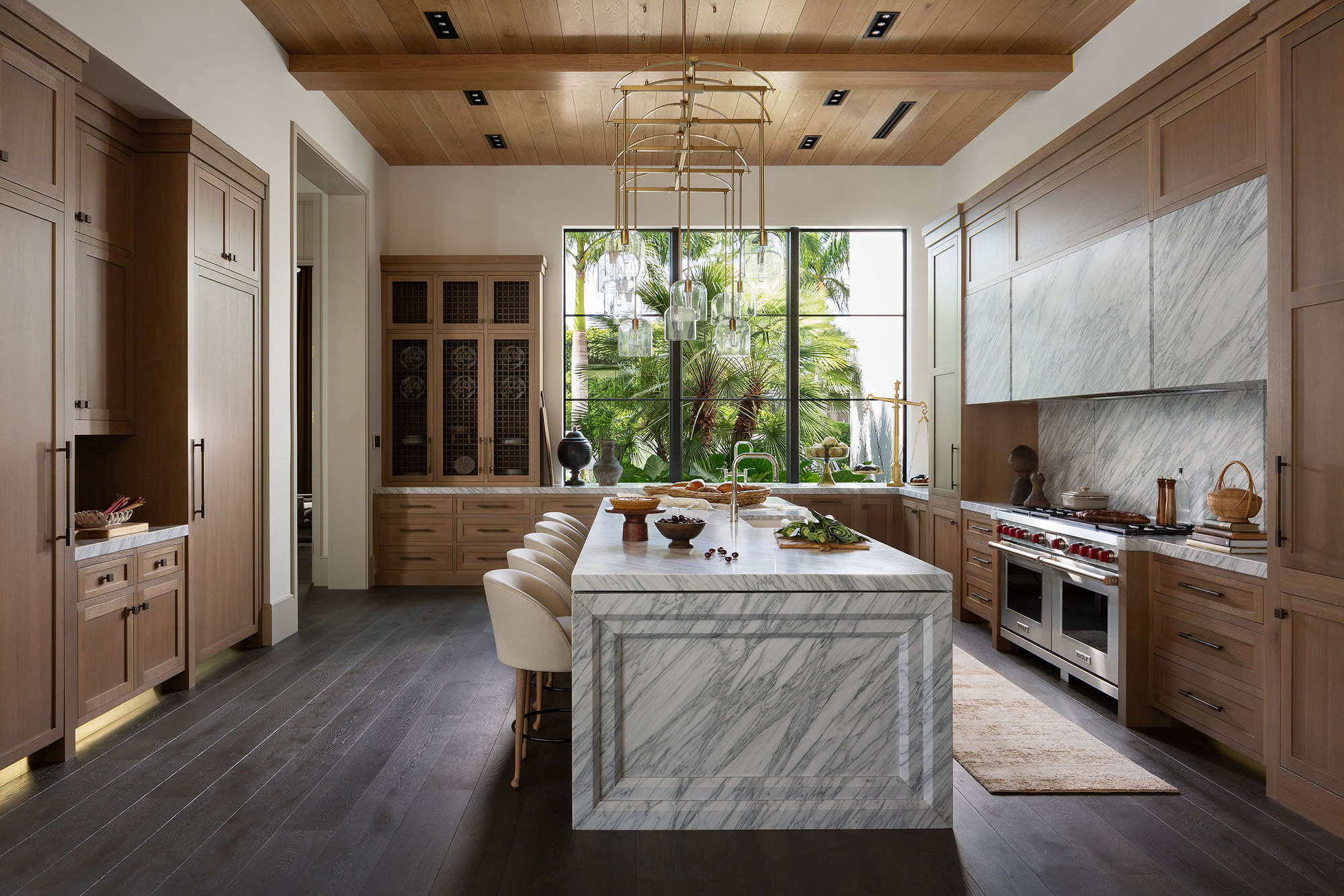 Gold marble throughout the kitchen and bar exudes elegance and refinement. Armac Martin