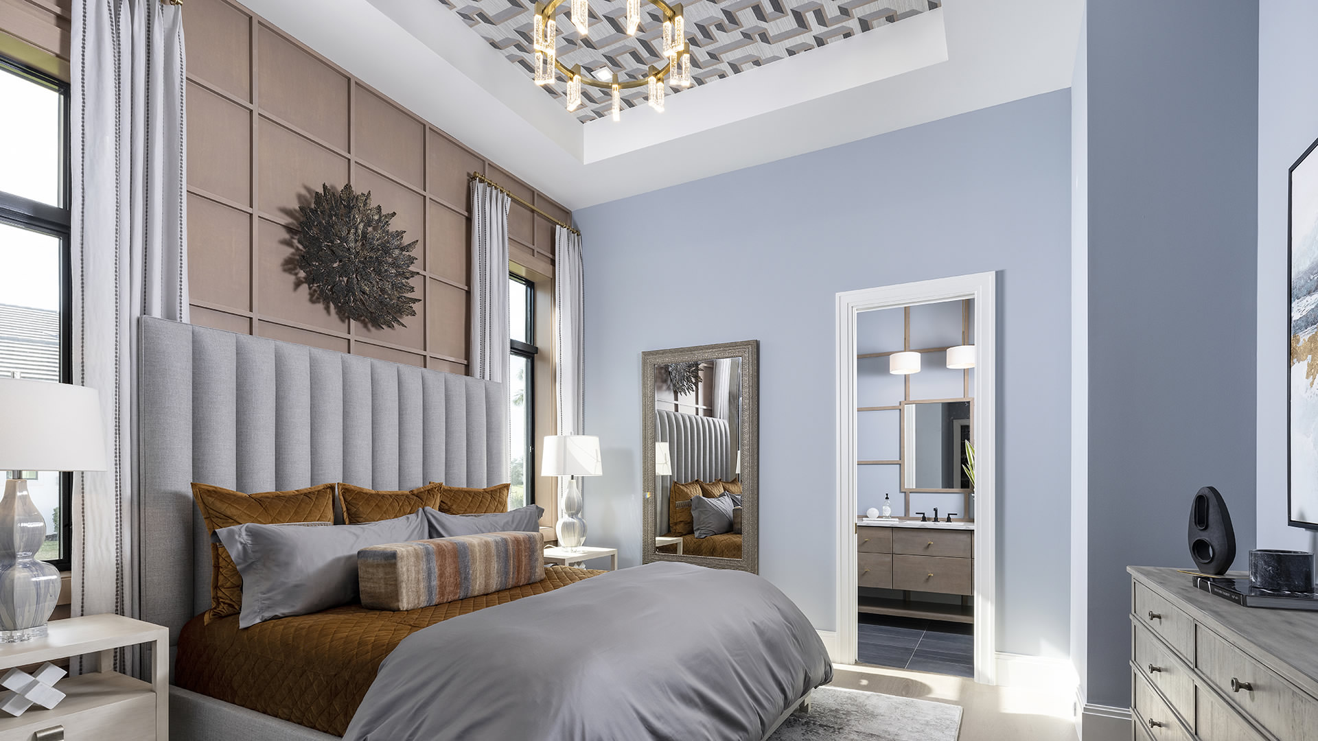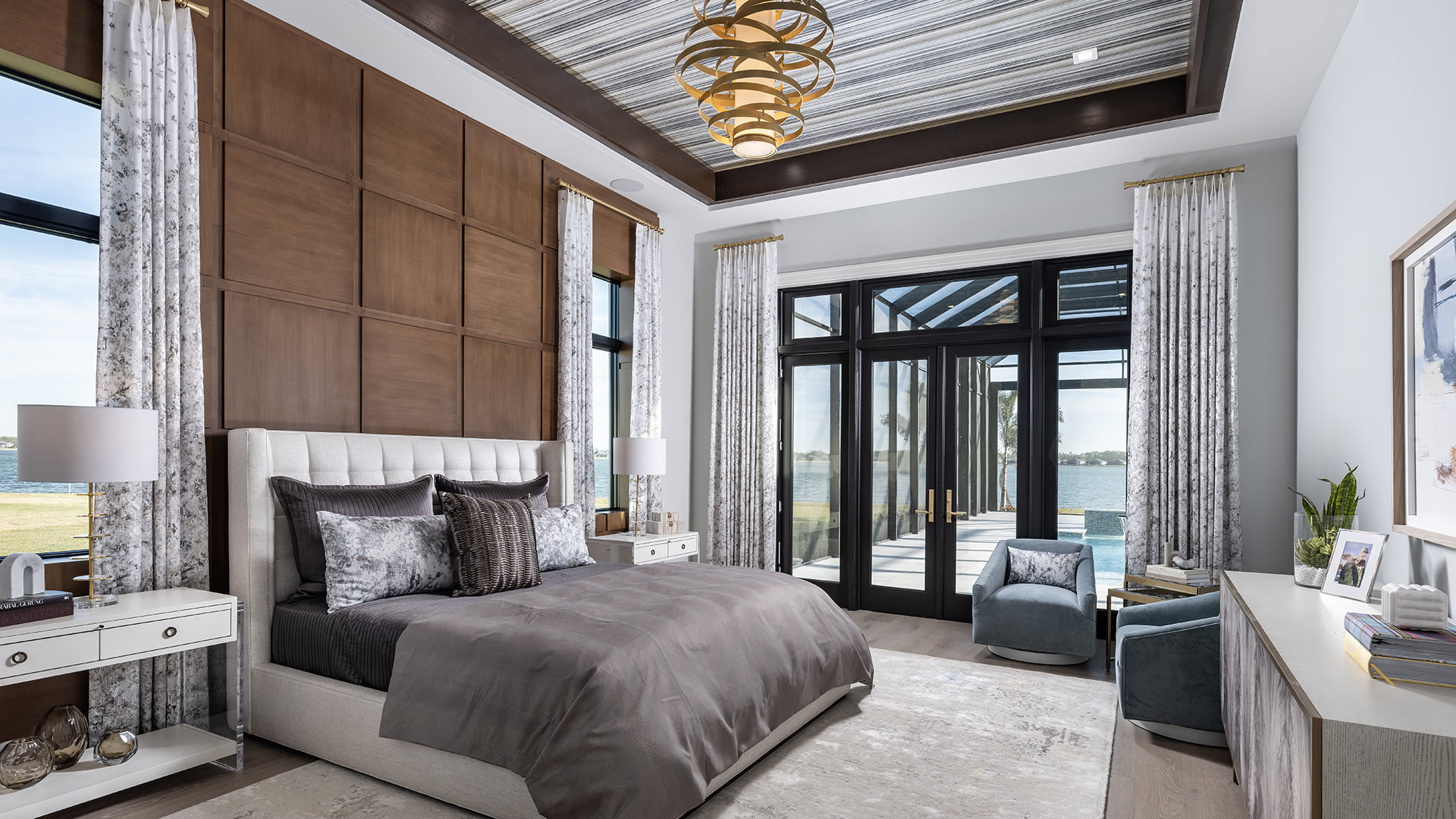 The master bedroom exudes modern luxury, featuring a statement wood wall with vertical panels, moody lighting, and a
