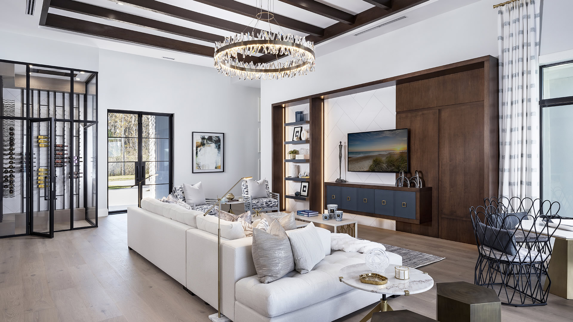 The living room is a masterpiece, where floating wood beams and dramatic recessed lighting add depth and dimension,