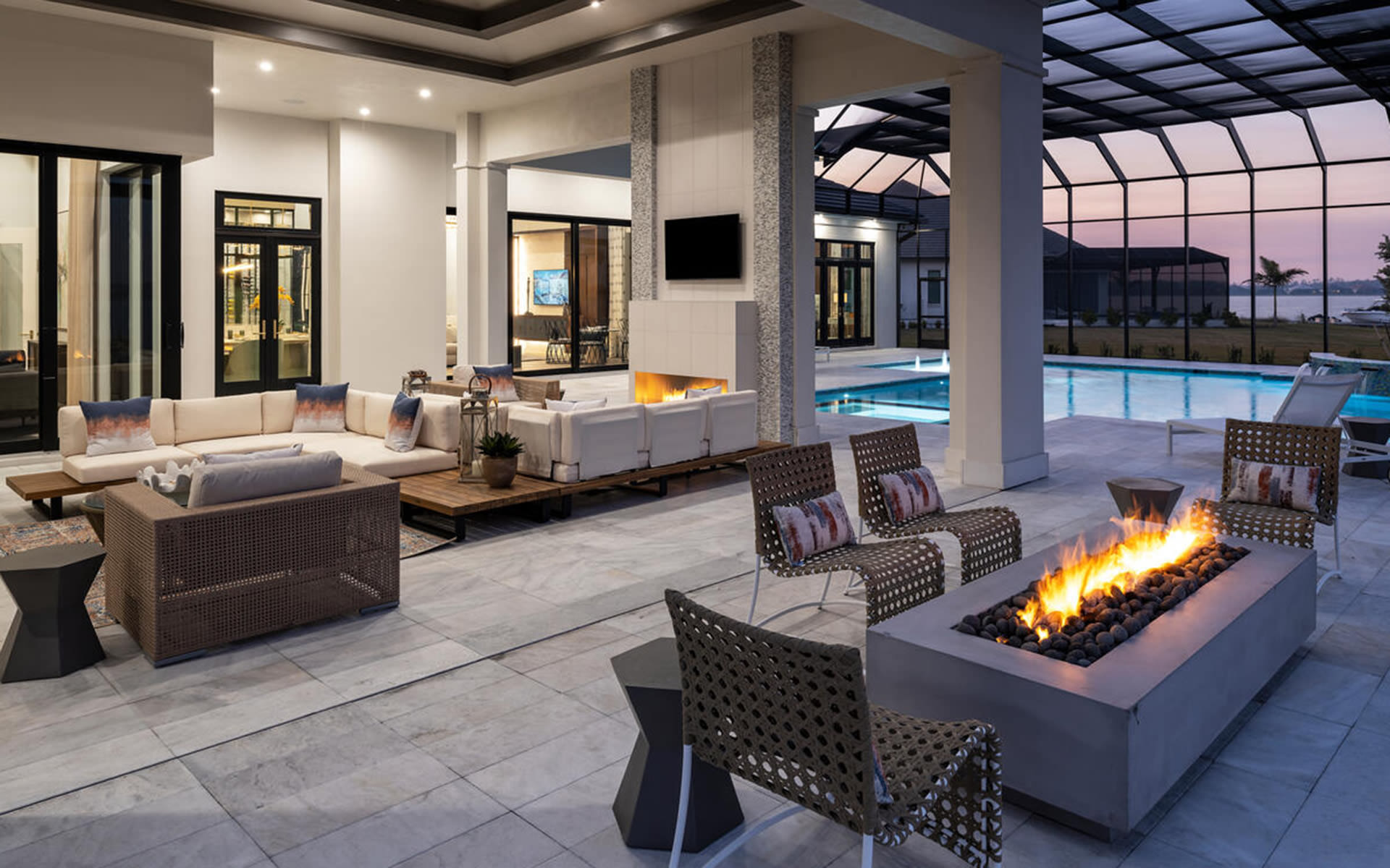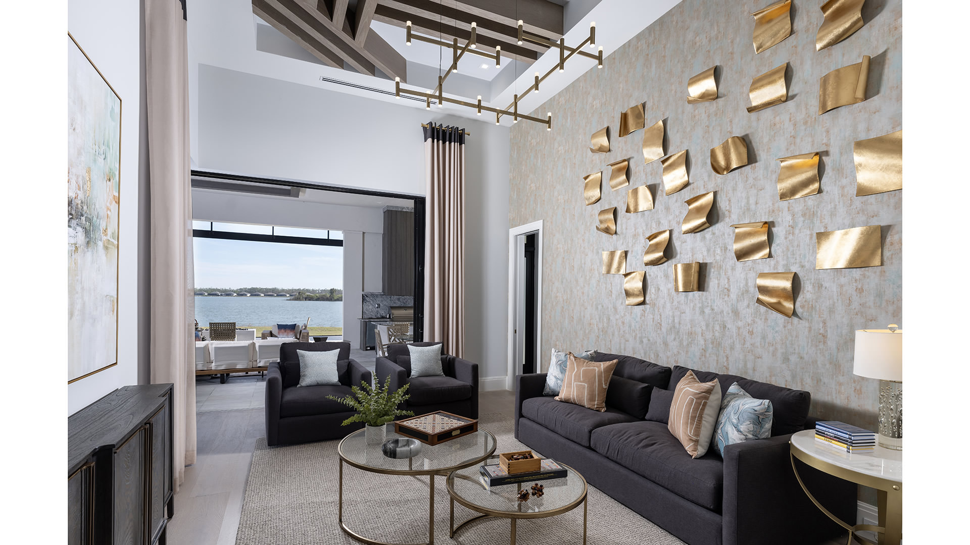 high-contrast palette softened by warm walnut flooring. Outside, the lifestyle extends to a resort-style pool and expansive