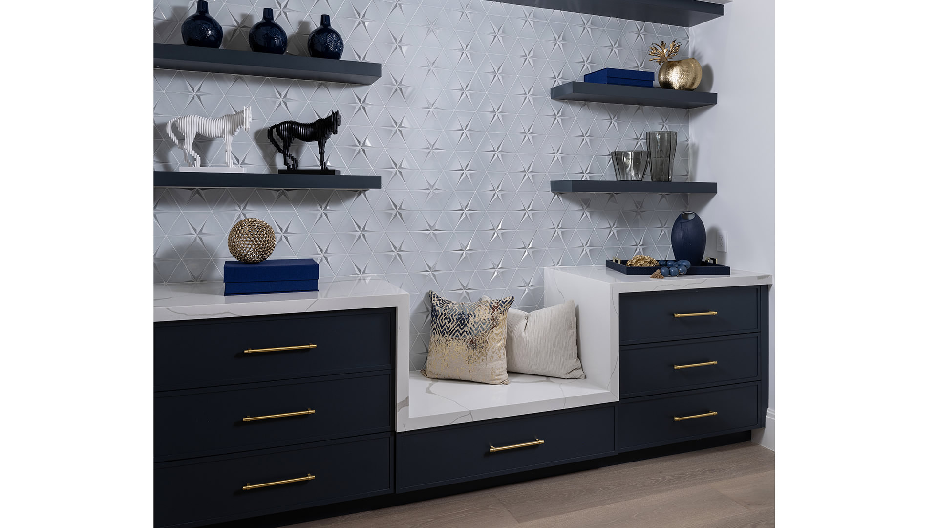 amplifying the home’s sophisticated appeal. A textured feature wall with custom shelving enhances the aesthetic, balancing