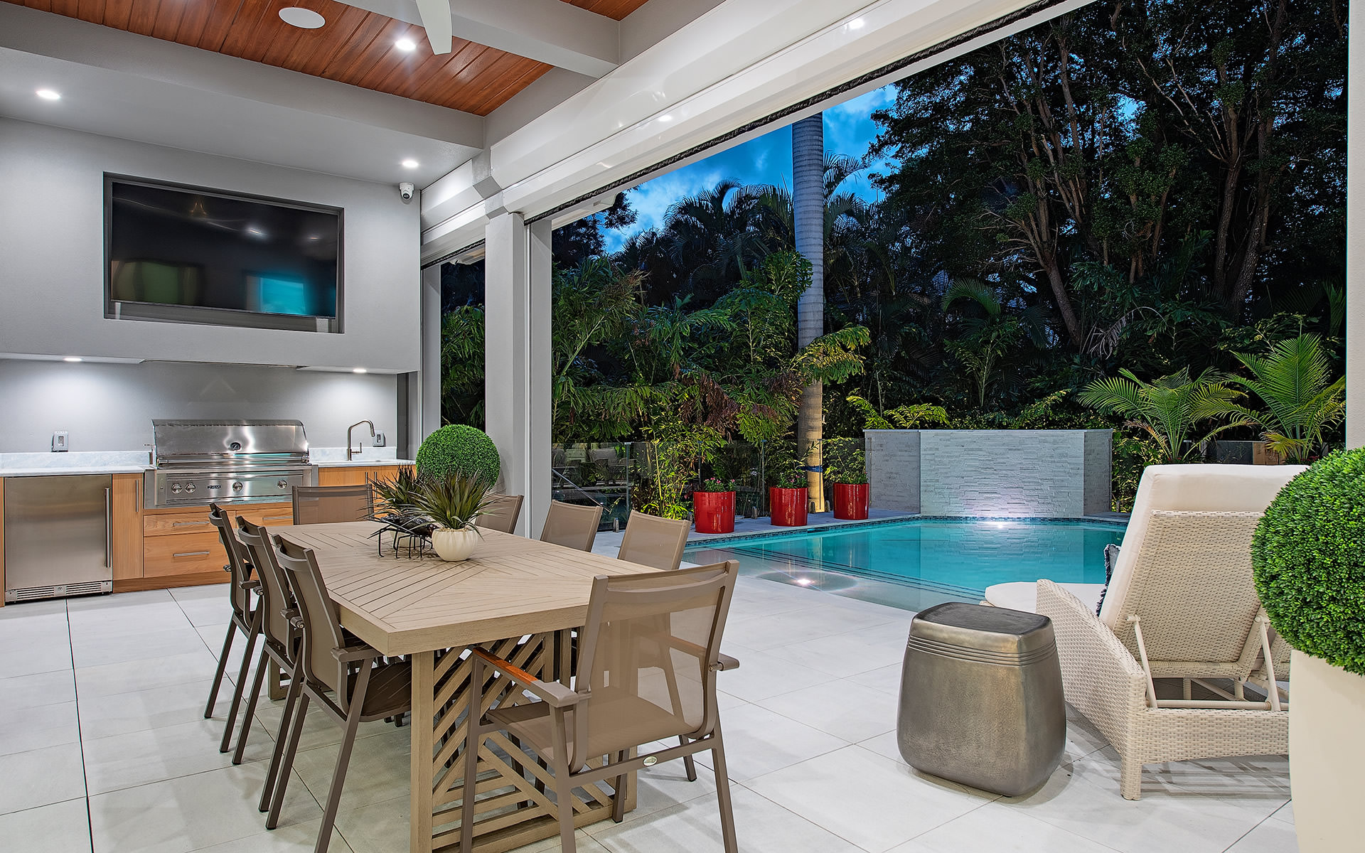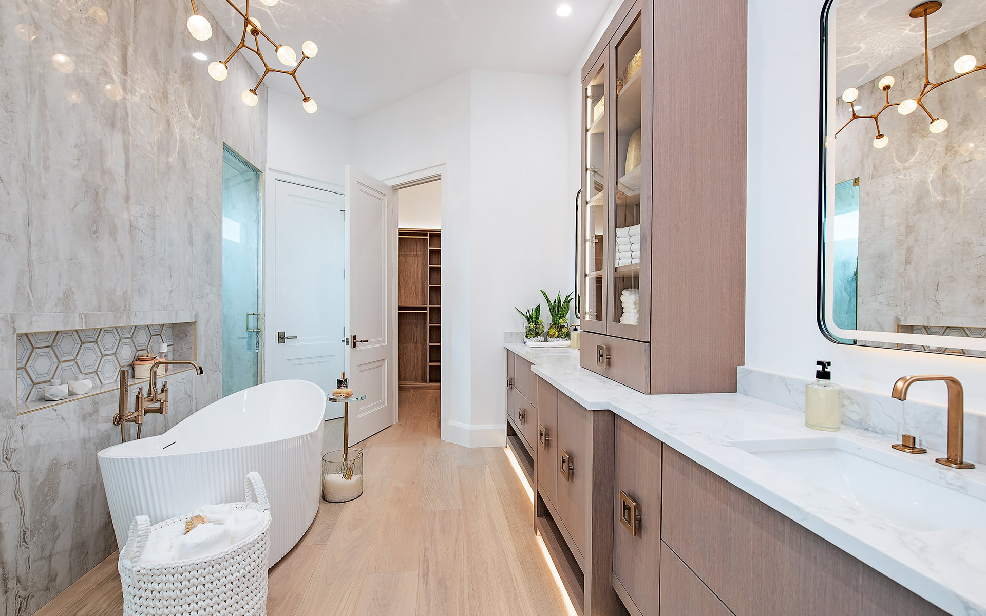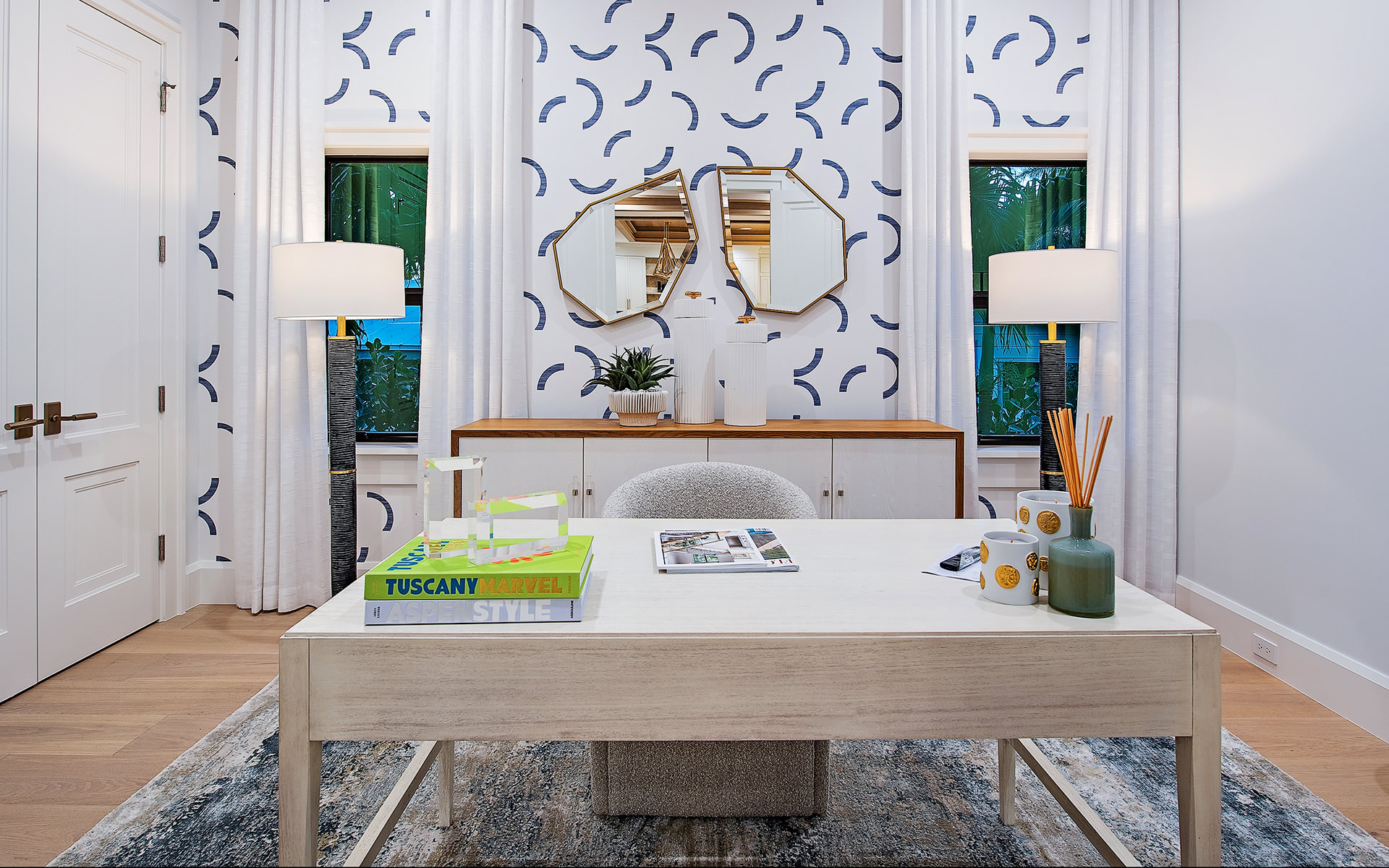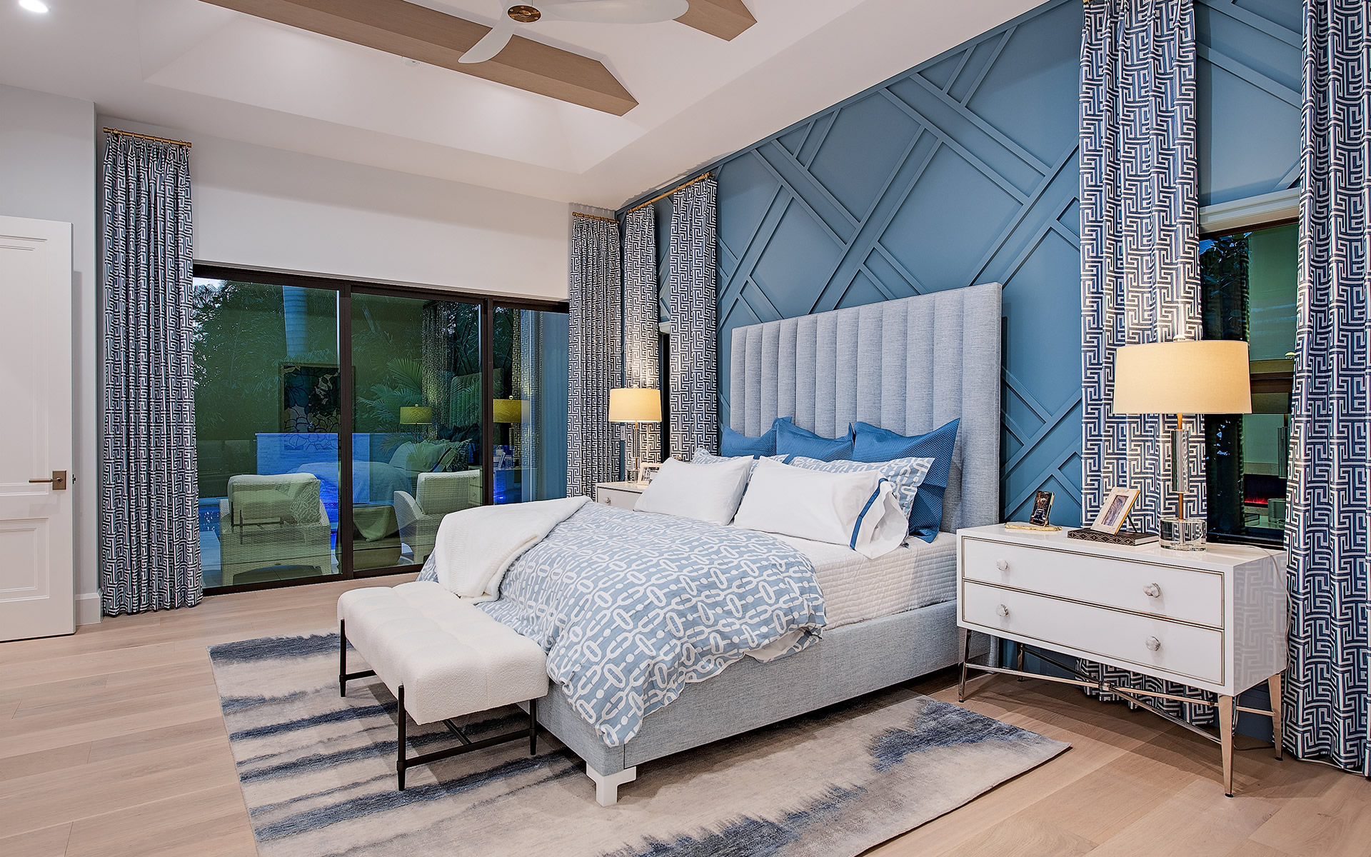 This model residence seamlessly integrates form, function, and forward-thinking living. A vaulted ceiling in the grand entryway anchors the design, while an elevator, dual laundry rooms, and a second-floor kitchenette add functionality to the five-bedroom layout, which also features an additional study that can be used as a sixth bedroom and 5.5 bathrooms. The exterior further enhances the experience, featuring 1,901 square feet of outdoor living space, including a pool, terrace, and patio with outdoor furnishings complementing this Park Shore Model Home.