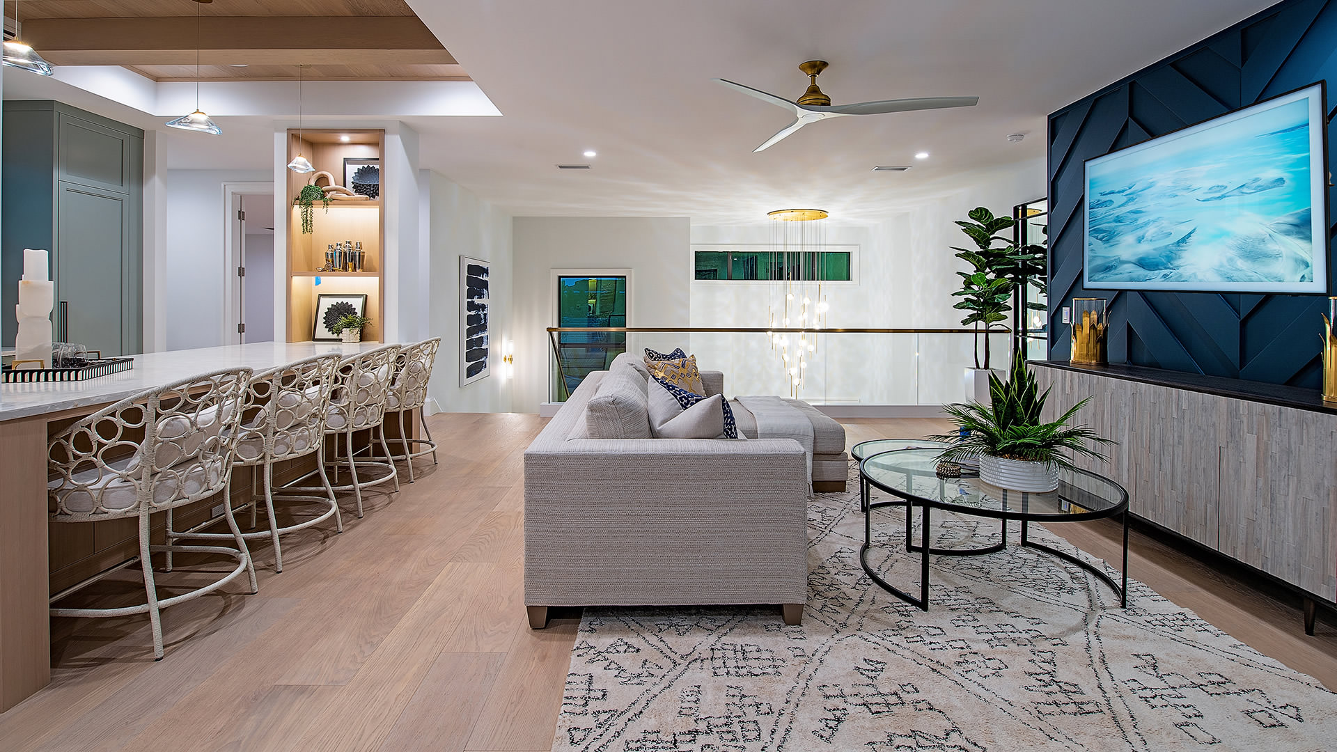 Upstairs, a second-floor open loft serves as a versatile retreat, complete with a built-in bar and adjacent lounge designed for relaxed gatherings and effortless entertaining. A chevron wood accent wall in deep navy anchors the space with contrast and character, while the rattan barstools and curated accessories nod to the home’s coastal roots. A soft, geometric rug and tailored sectional create a cozy yet elevated hangout zone for family and guests alike.