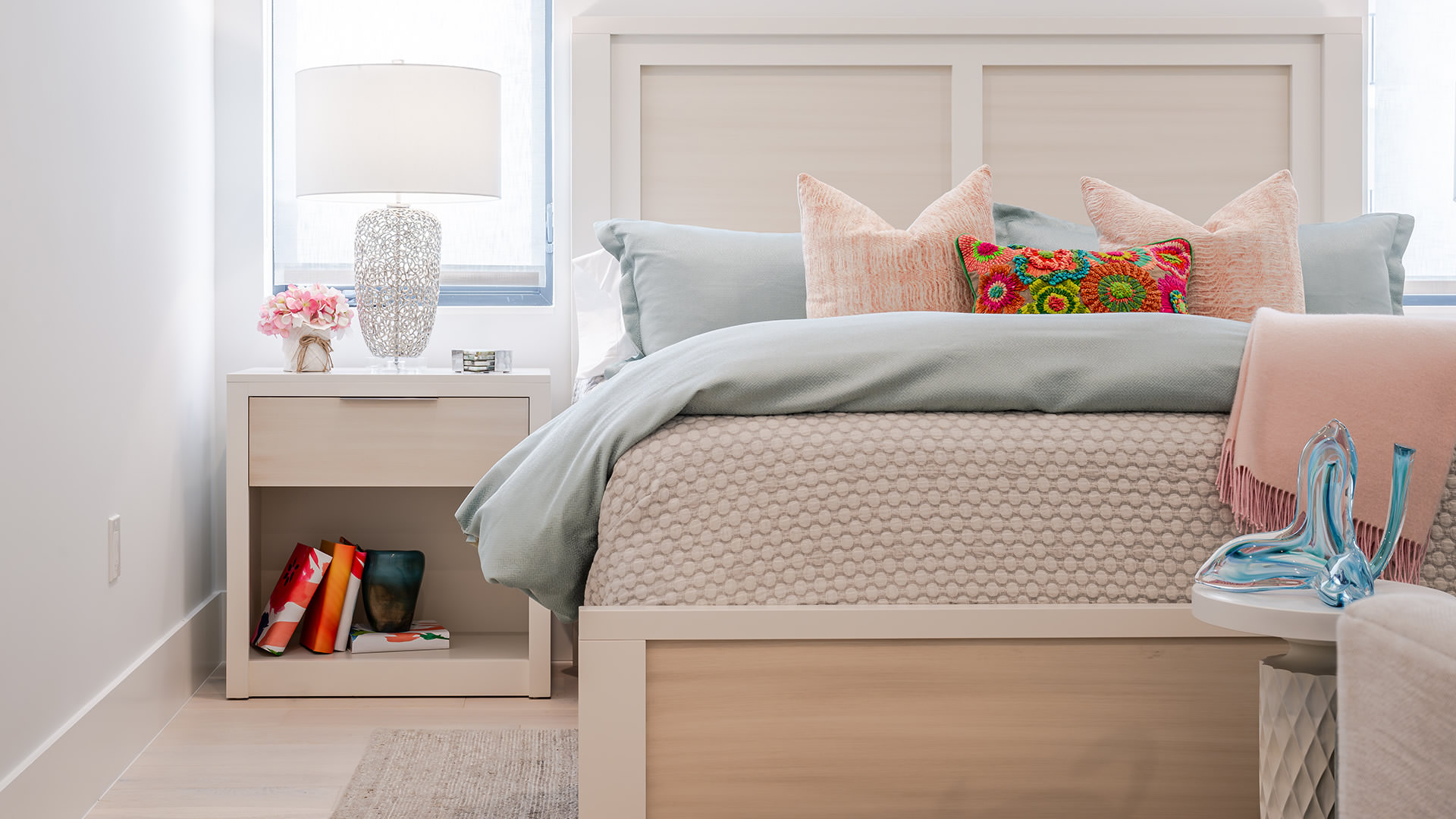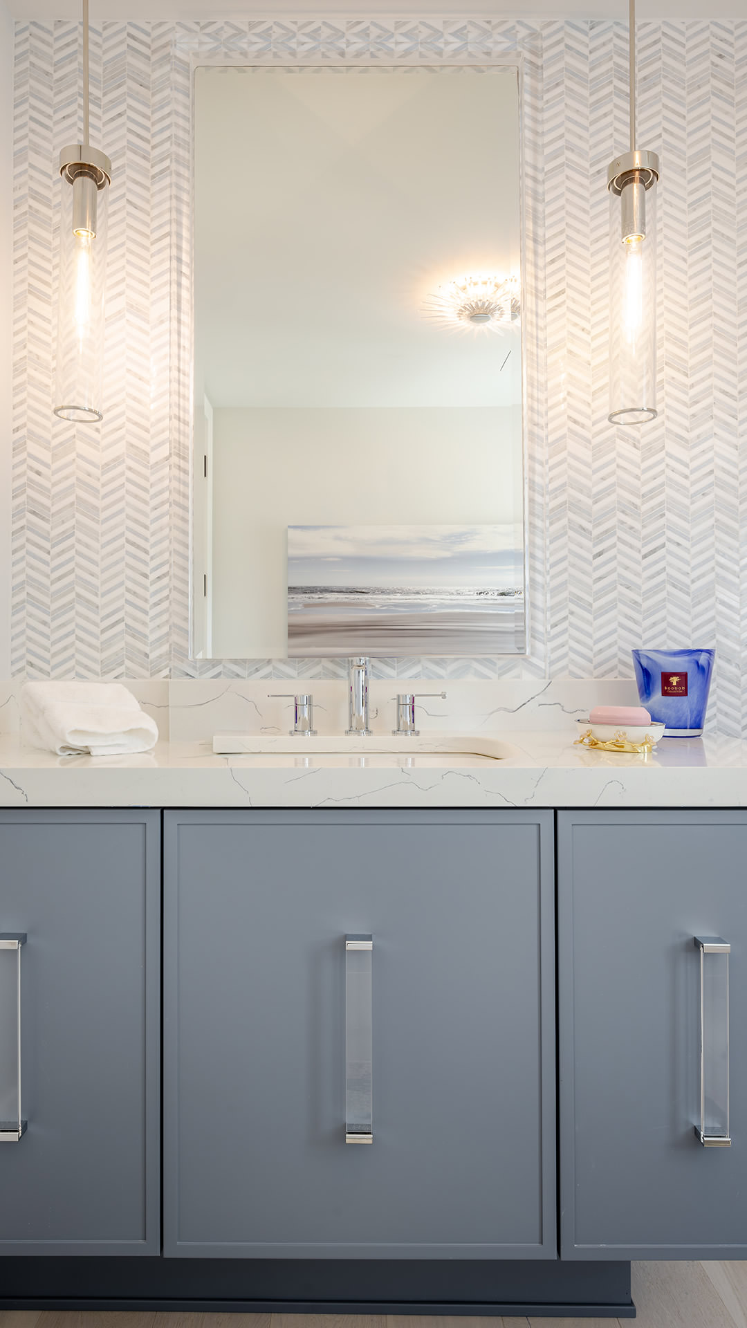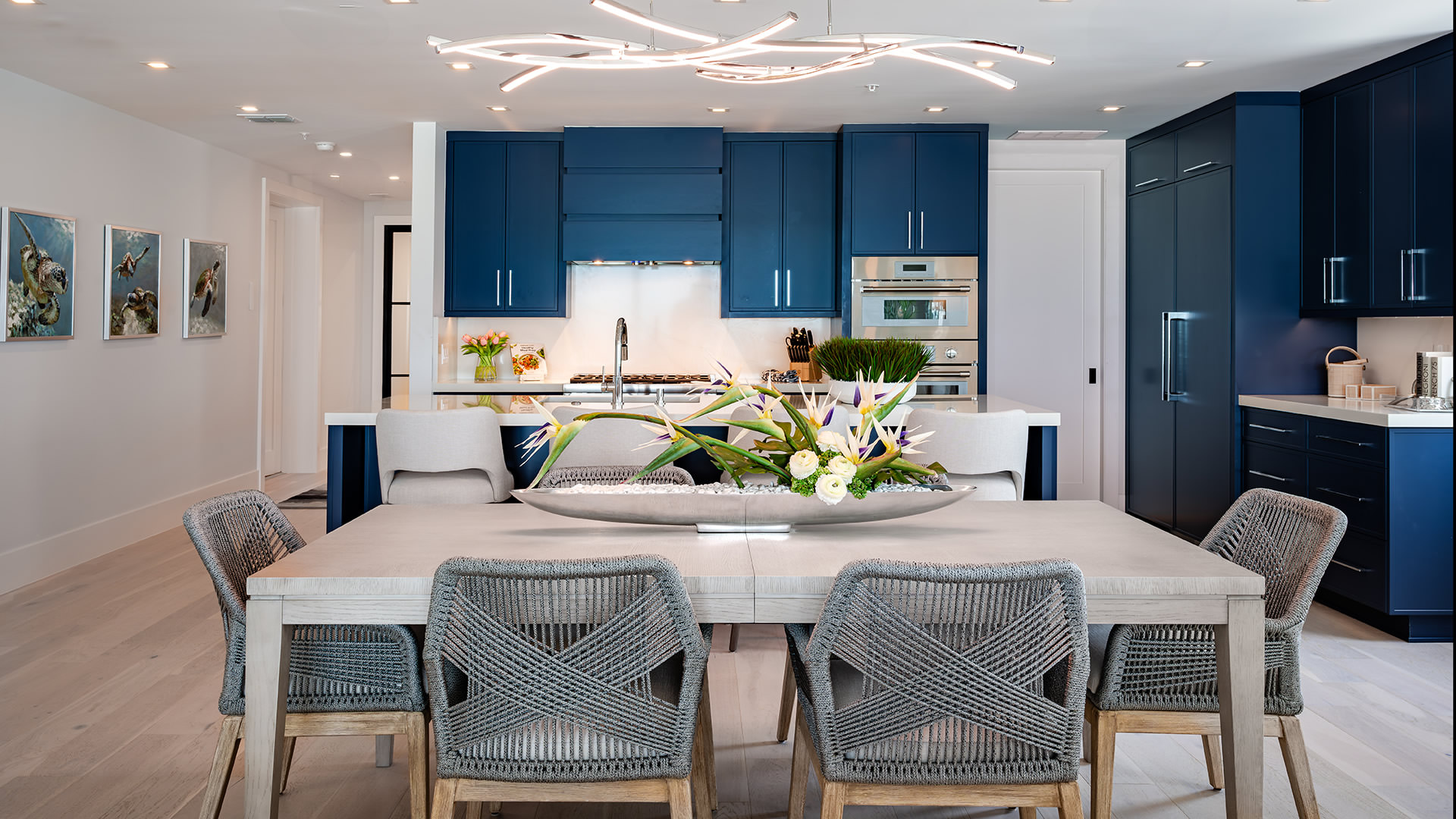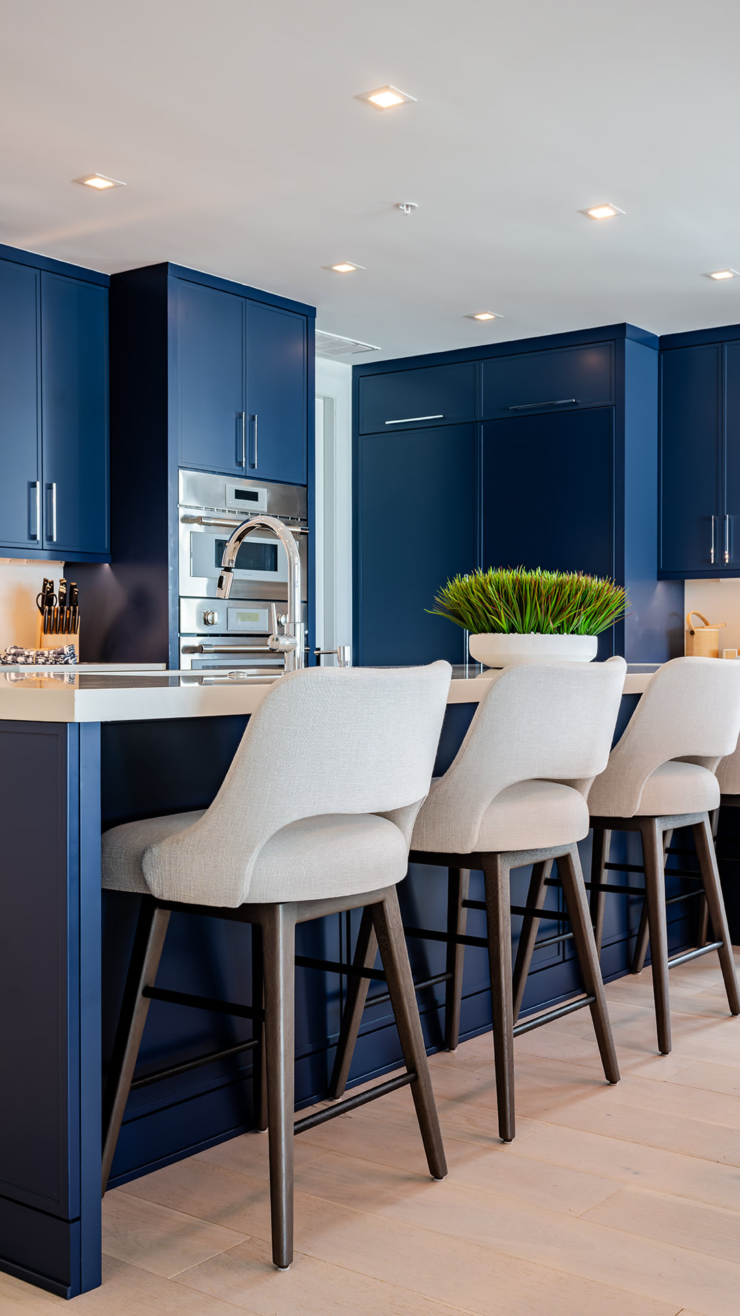 The interior showcases a harmonious coastal palette inspired by the natural surroundings—custom royal blue cabinetry paired with soft coral, seafoam green, and tranquil blue accents that echo the ever-changing hues of the ocean. Light-toned flooring and wall colors enhance the natural light and promote a fresh, cool ambiance, while a minimalist, uncluttered aesthetic brings a sense of calm and sophistication.