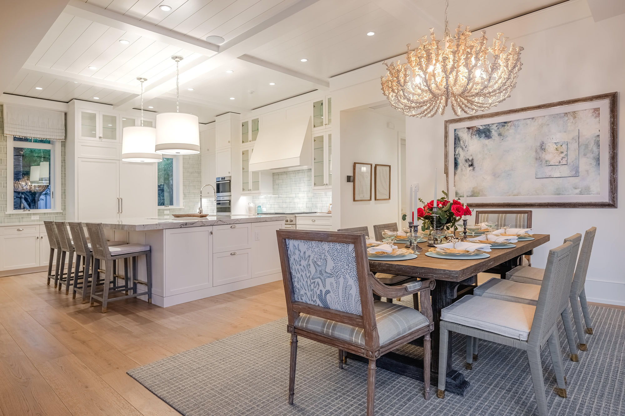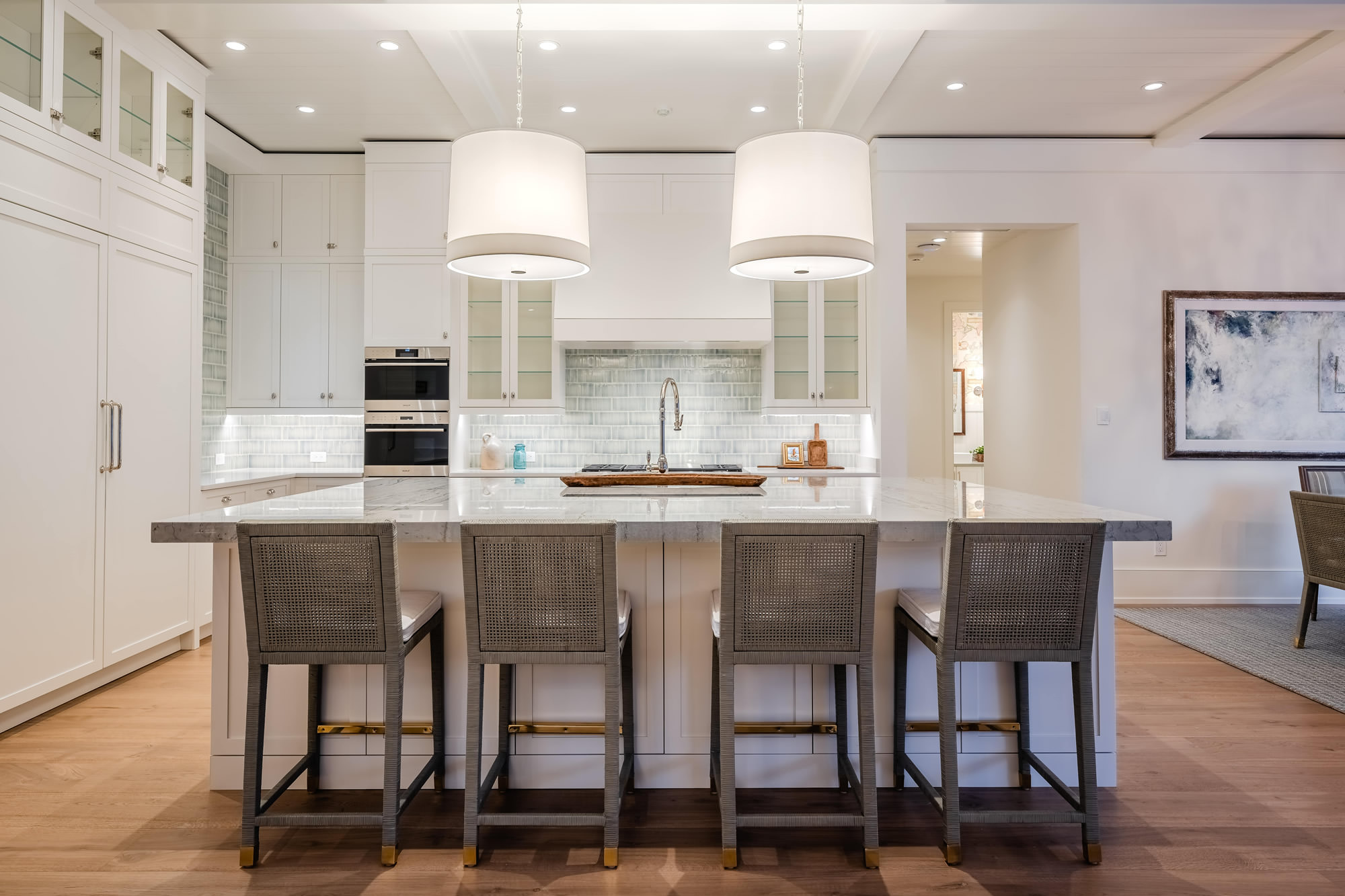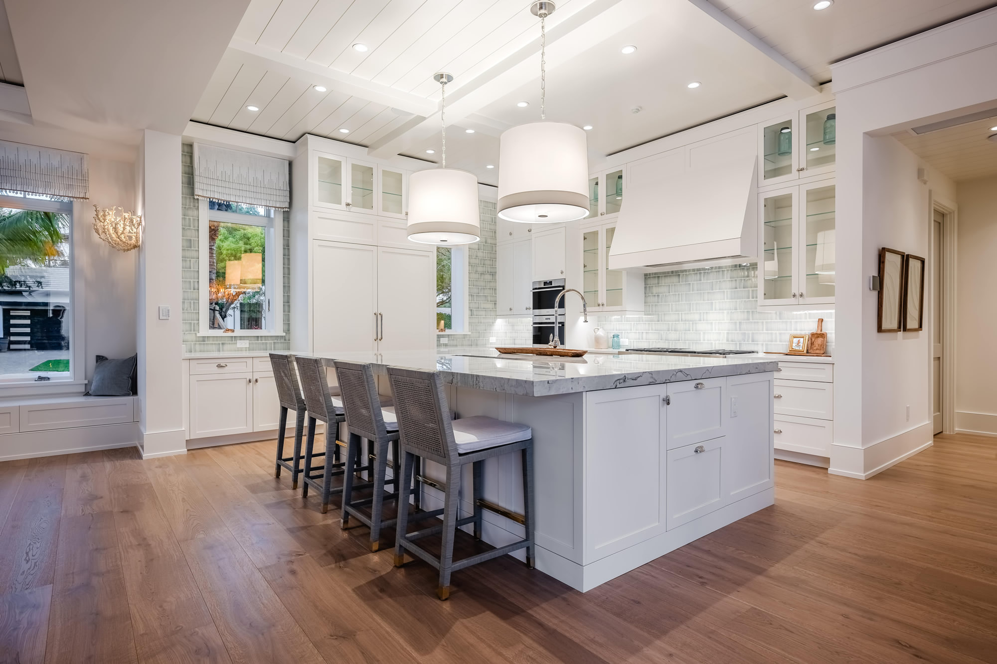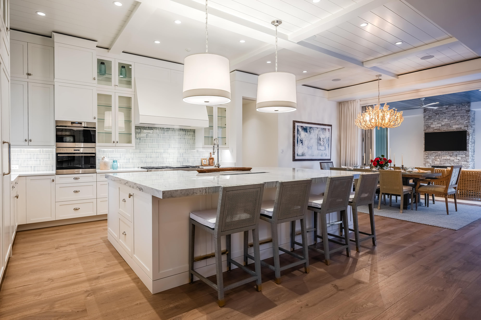 The space strikes a balance between beauty and practicality through thoughtful design, a blend of materials, and standout architectural details. Key highlights include a standard-height perimeter countertop in Thassos quartz and a large island topped with 2.5″ mitered Maldive quartzite, featuring a built-in mitered cooler seamlessly integrated into the island’s surface. A blue crackle-glaze tile backsplash adds depth and character, while custom beams and a tongue-and-groove ceiling elevate the architecture. The space is finished with polished nickel hardware, custom window valances, and a pair of dramatic oversized pendants. Top-of-the-line appliances and hidden functionality complete this elevated kitchen—delivering both a showpiece and a truly functional culinary space.