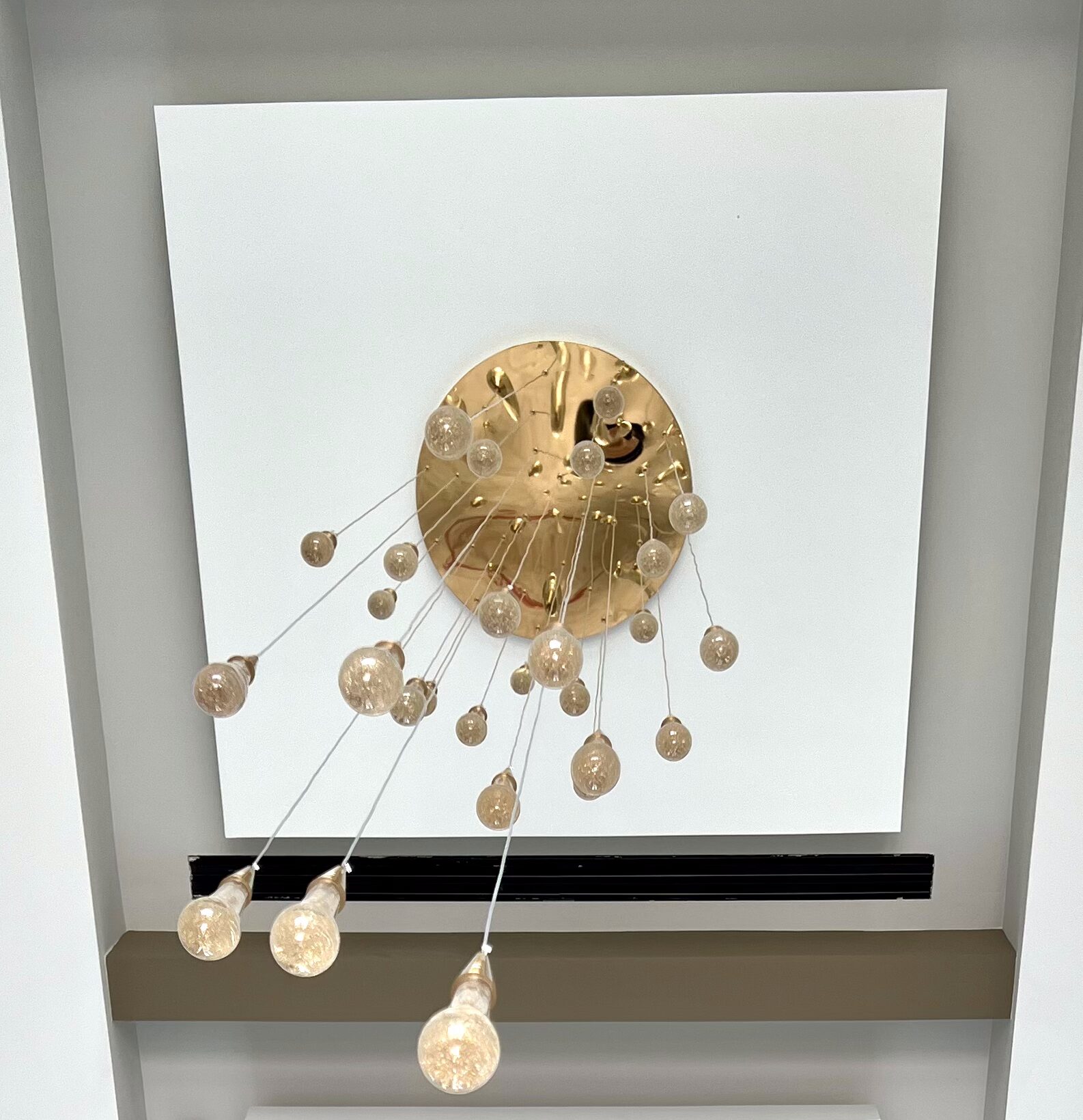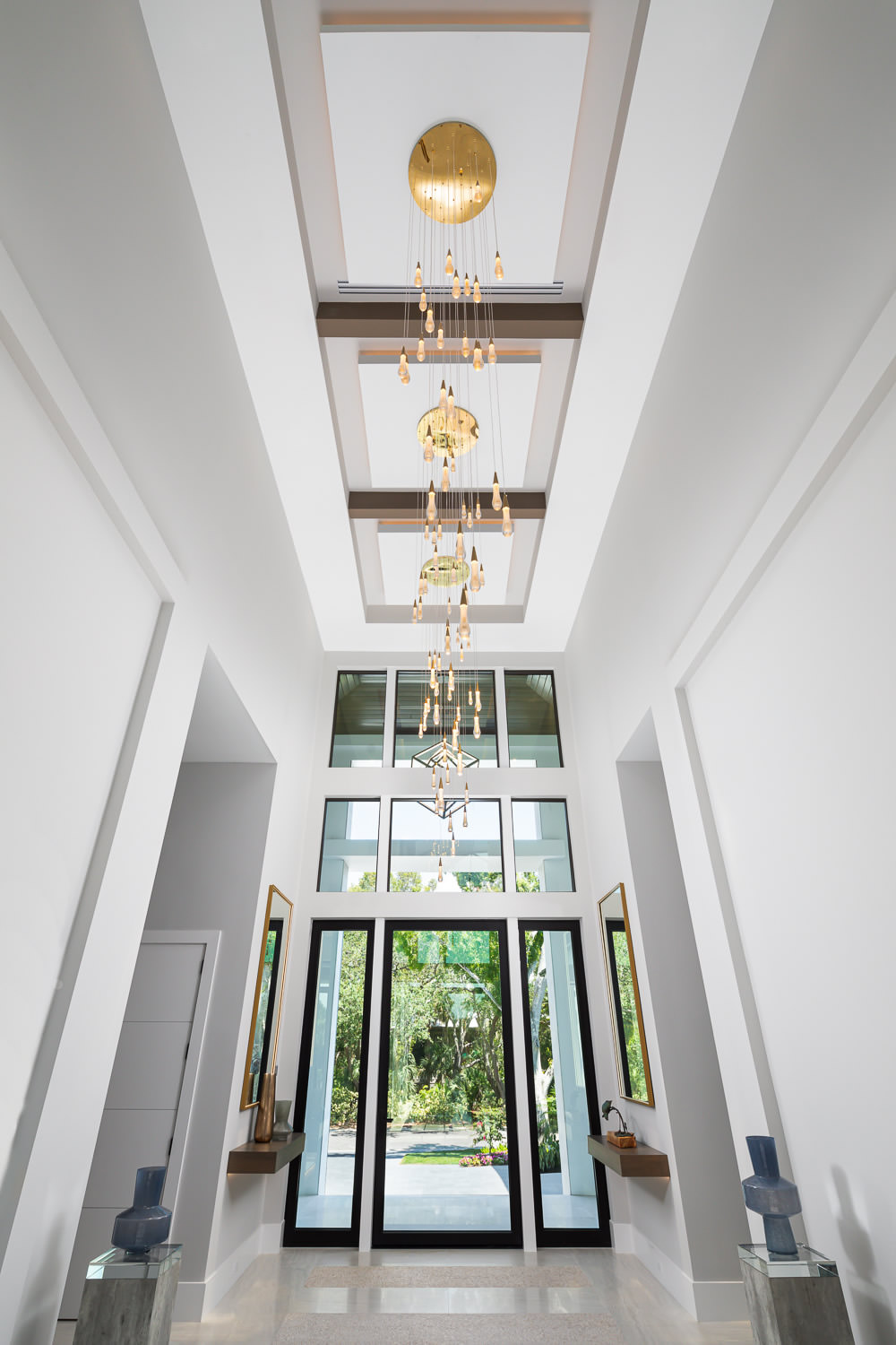 To guide the eye from the striking front door to the serene water features in the backyard, we introduced a repeating motif that adds both softness and structure. Three square “clouds,” subtly backlit for depth and drama, are perfectly aligned within a rectangular tray ceiling. Suspended beneath them are cascading light fixtures that amplify the sense of motion and visual continuity. At the center, a circular brushed brass plate acts as a radiant focal point, from which delicate pendant lights descend like falling droplets. These are hung on nearly invisible cables, creating a weightless, floating effect. The pendants feature teardrop-shaped glass elements, each with a warm internal glow that accentuates the verticality of the space and adds a gentle ambiance.