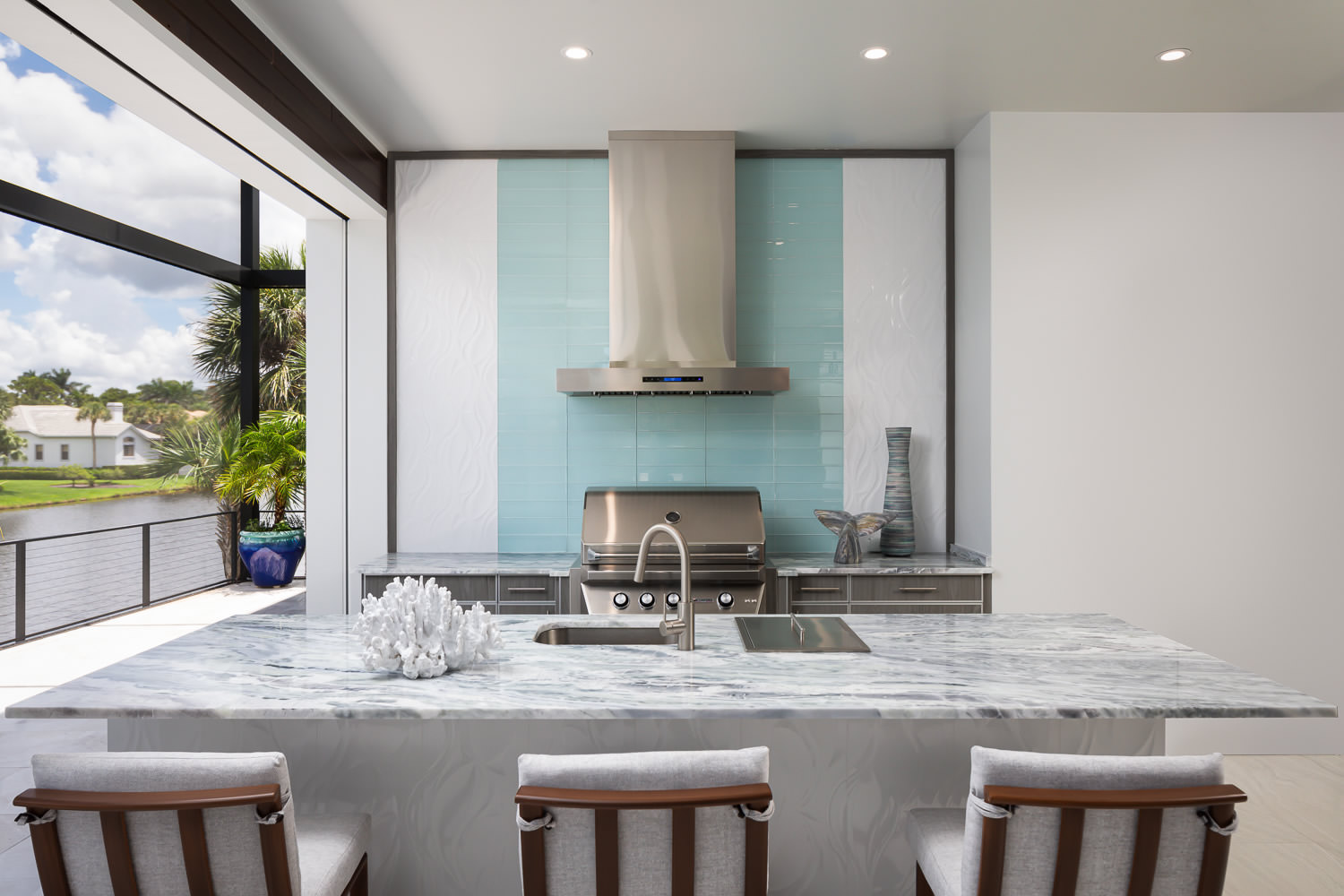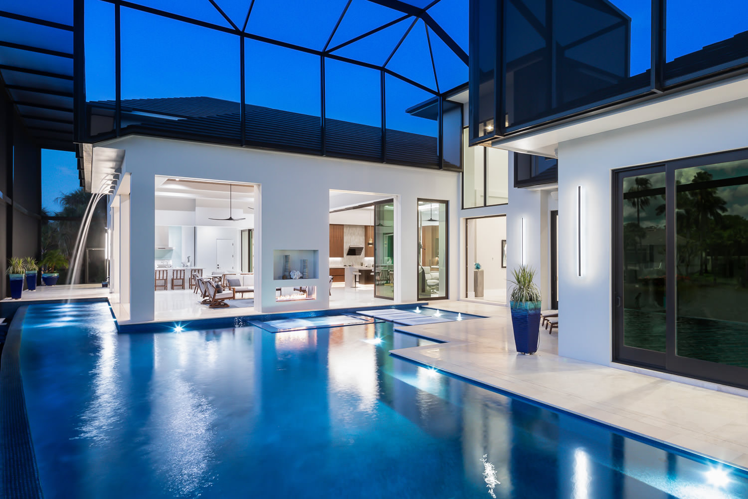 A soft curved infinity wall, finished in shimmering blue mosaic tile, defines the pool’s edge and enhances its fluidity. Five dramatic water spouts cascade from the second story, creating a sensory experience that is both visually dynamic and audibly calming—perfectly placed beside the open-air living room and double-sided fireplace.