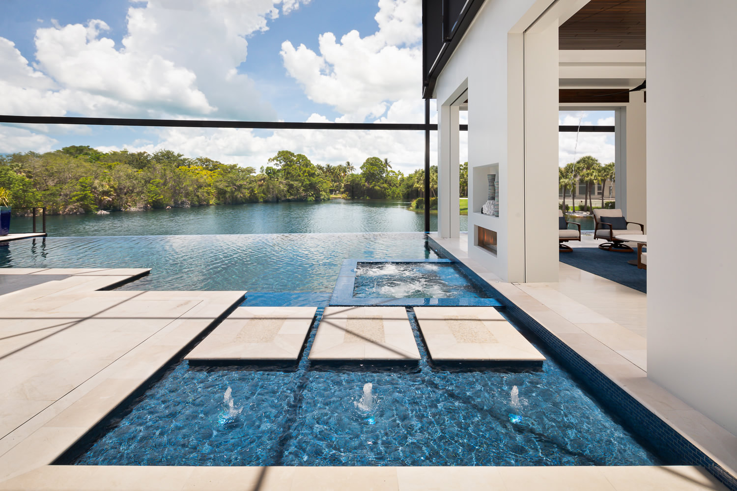 The built-in spa offers a luxurious spot to unwind, surrounded by striking views and a calming ambiance. Stepping stones integrated directly into the water invite you to journey from one outdoor living area to the next, creating a playful yet refined circulation path that feels like an extension of the home’s architecture.