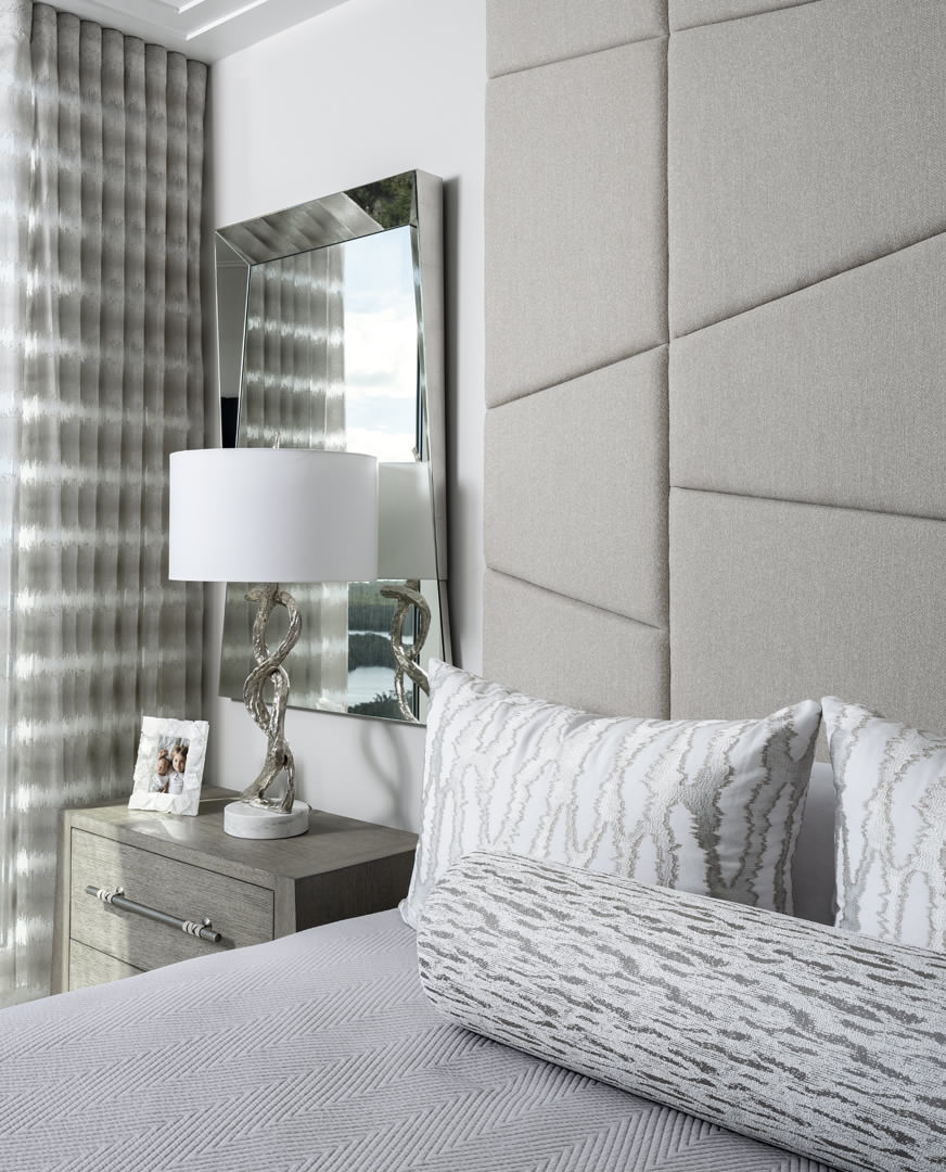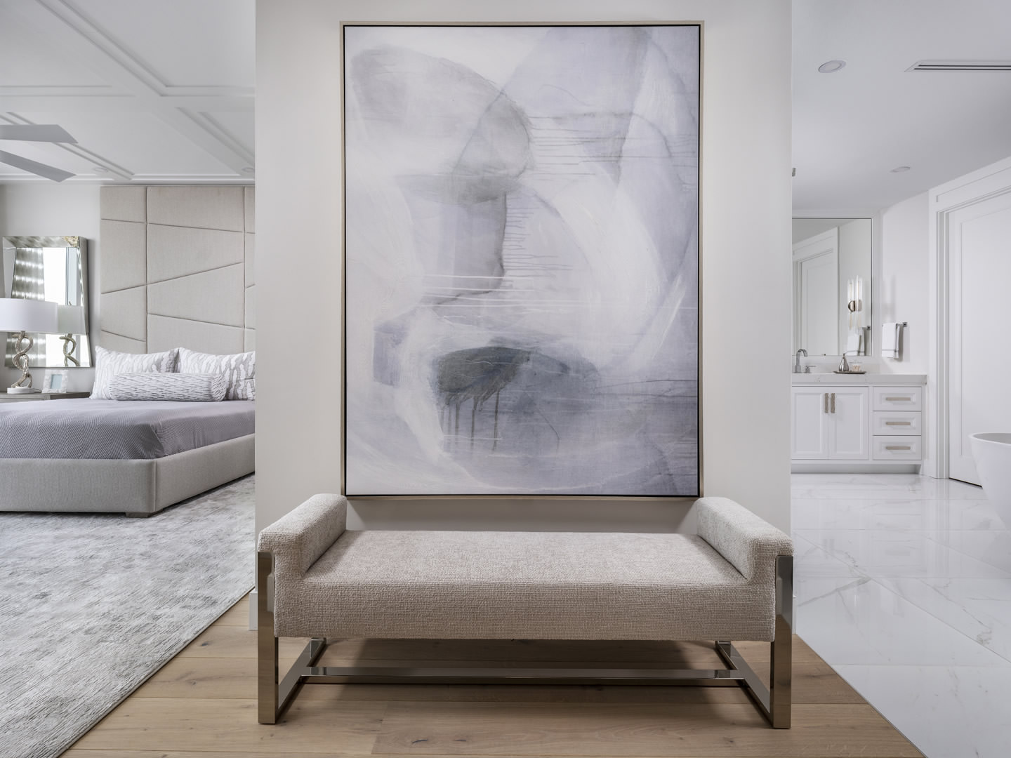 Perched in a penthouse with soaring 10-foot ceilings and breathtaking Gulf Shore views, this master suite is a serene sanctuary defined by natural light and sophisticated simplicity. Floor-to-ceiling windows flood the space with brightness, highlighting a neutral palette rich in texture and warm wood tones that create subtle contrast and timeless elegance. A full-height headboard commands attention the moment you enter, flanked by stunning John Richards mirrors that add a sculptural, three-dimensional effect, infusing the room with drama and artistry. A cozy chaise near the windows invites quiet moments of relaxation and reading. The spacious master bath is bright and crisp, featuring pristine white cabinetry and tilework. A striking wallcovering behind the tub is paired with an artful collection of sculptural mirrors, adding depth and visual intrigue. Completing the suite is a generously sized his-and-hers walk-in closet, thoughtfully designed to maximize storage and organization with ample space for both