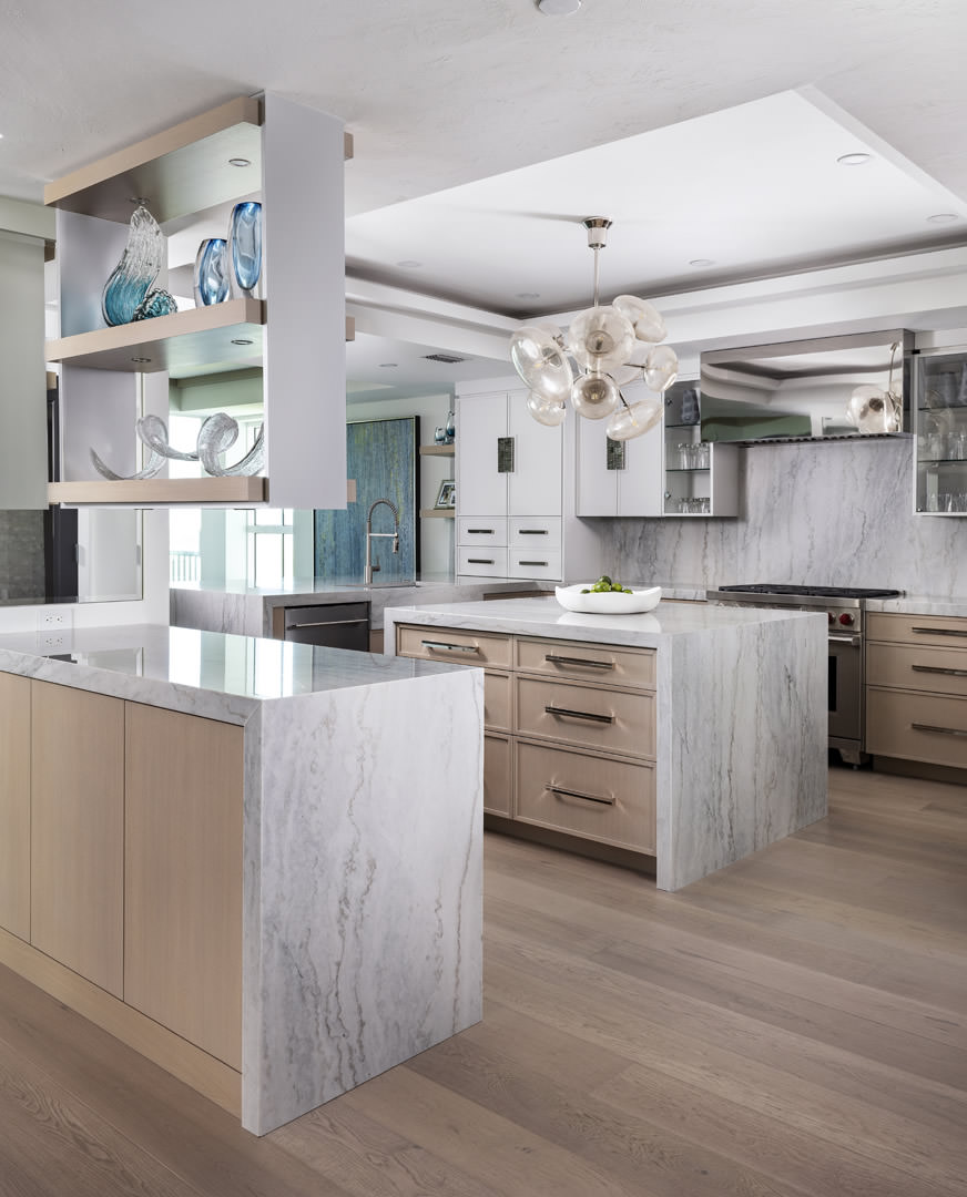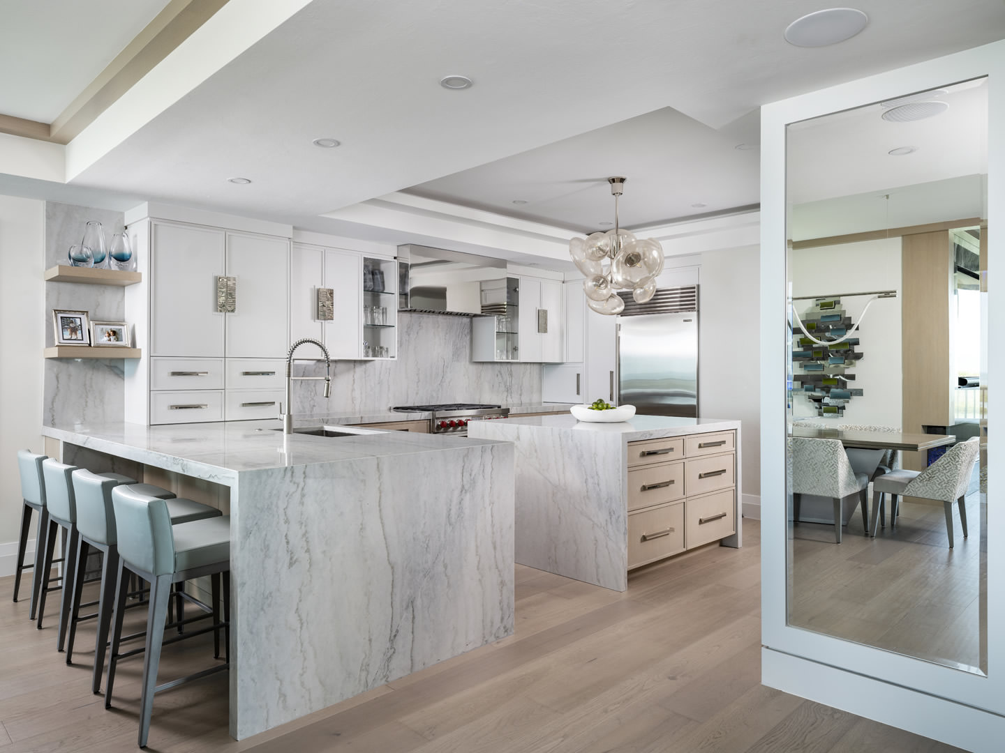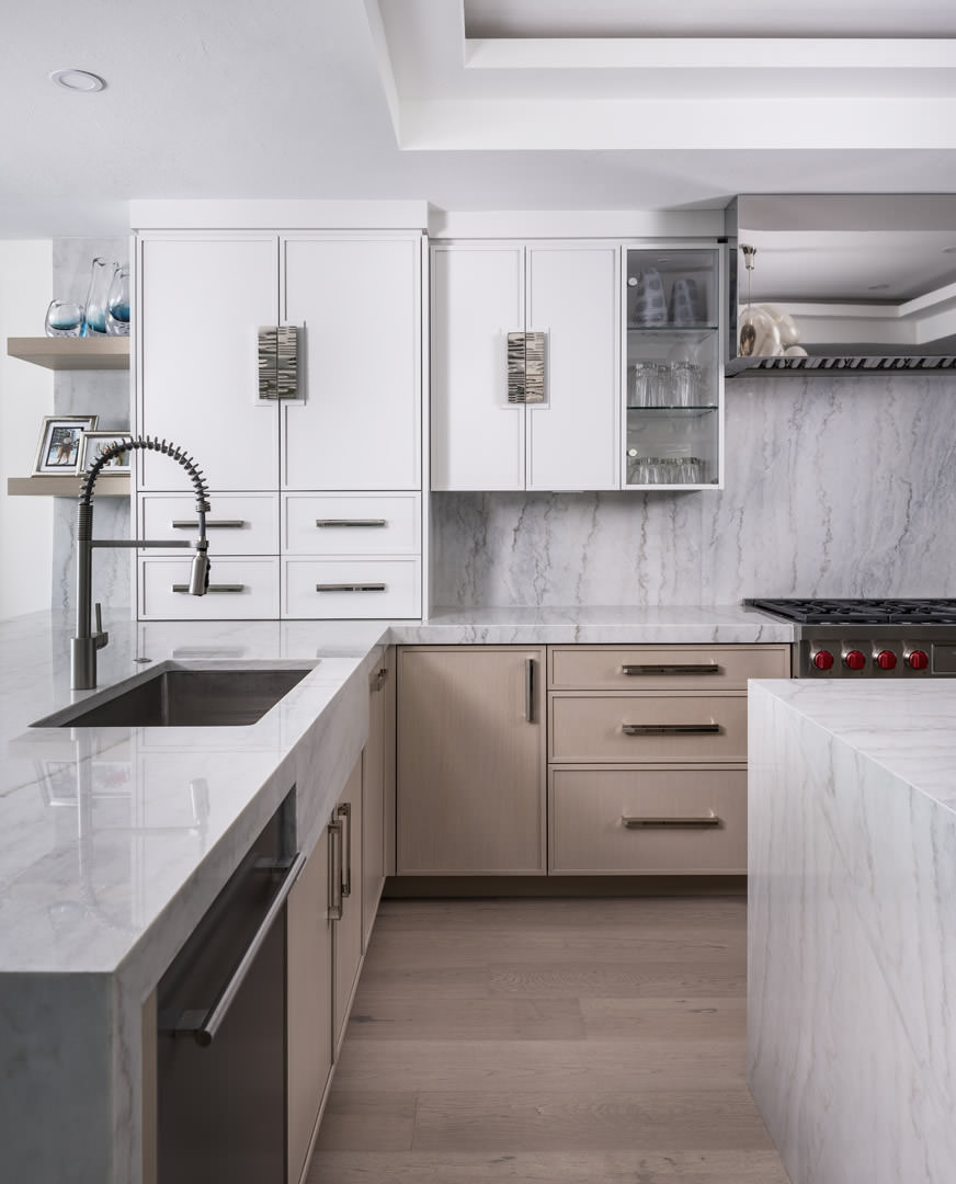 This kitchen is a true transformation from the original floor plan. We opened up an alcove kitchen to seamlessly connect with the main living area, achieving the highly sought-after open floor plan concept. Working around a structural column, we cleverly clad it in mirrors and incorporated a hanging shelf detail that defines the kitchen’s perimeter while enhancing light and space. The design features sleek modern elements, complemented by a sophisticated mix of light-stained rift white oak and painted cabinetry. Moving away from traditional white, we selected a warm light grey, Benjamin Moore’s Silver Satin, for the painted cabinets, adding warmth and depth. Textured polished nickel hardware on the upper cabinets flanking the stove introduces subtle bling and custom detail. A polished stainless steel hood takes center stage as the kitchen’s focal point, beautifully contrasted by stained rift oak cabinetry and quartz countertops featuring 2.5″ mitered edges and elegant waterfall legs. A modernized farmhouse sink, crafted from slab countertops with a sleek apron front, adds a unique, contemporary touch. Above, a hidden LED tape light ledge with color-changing capabilities sets the perfect mood for any occasion. A whimsical yet glamorous modern pendant light over the island adds personality and softness to the kitchen’s otherwise clean, linear design.