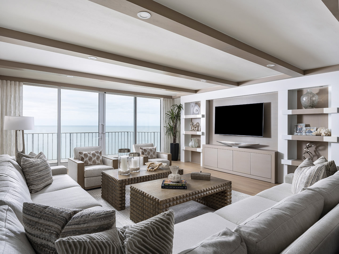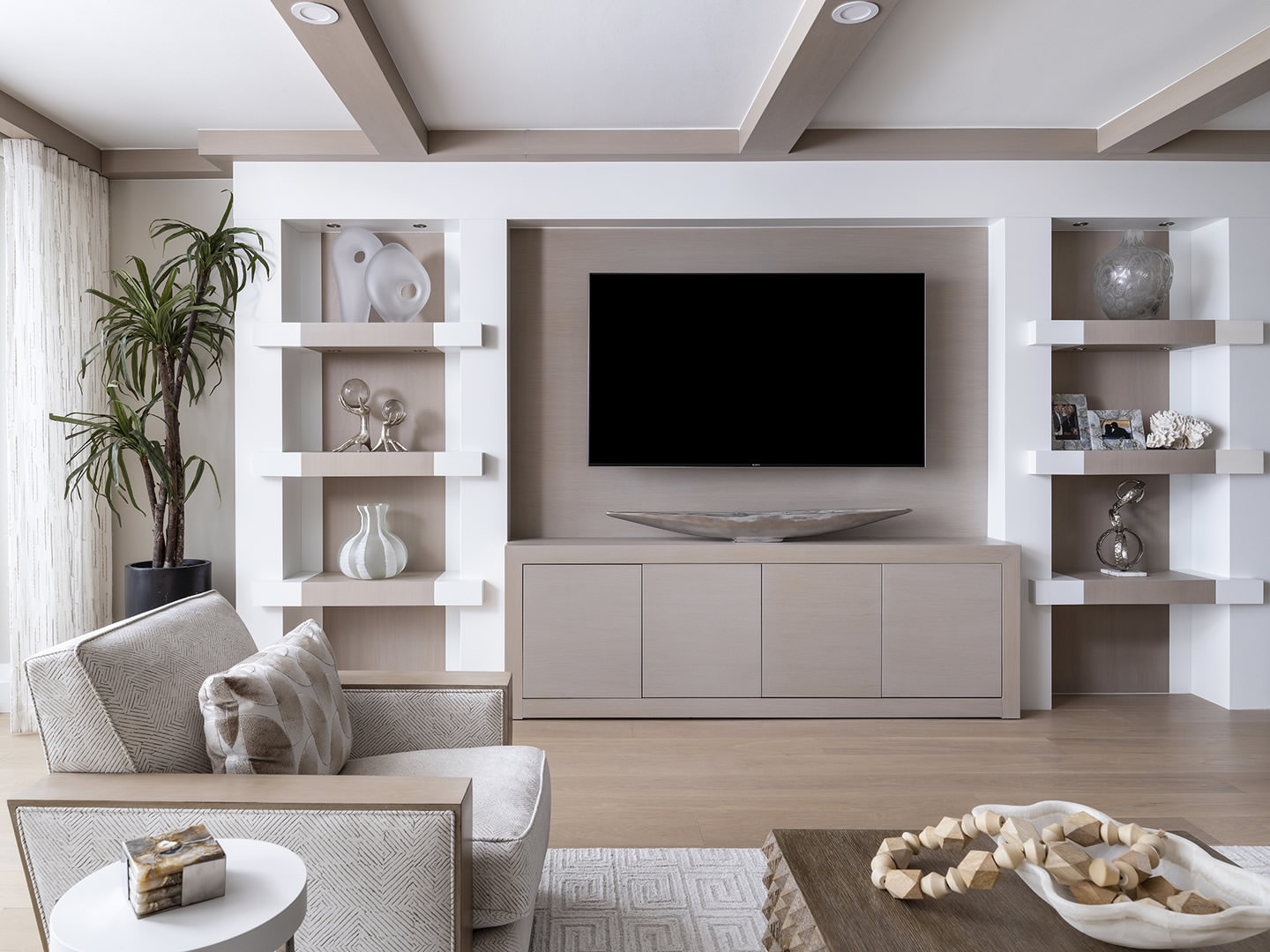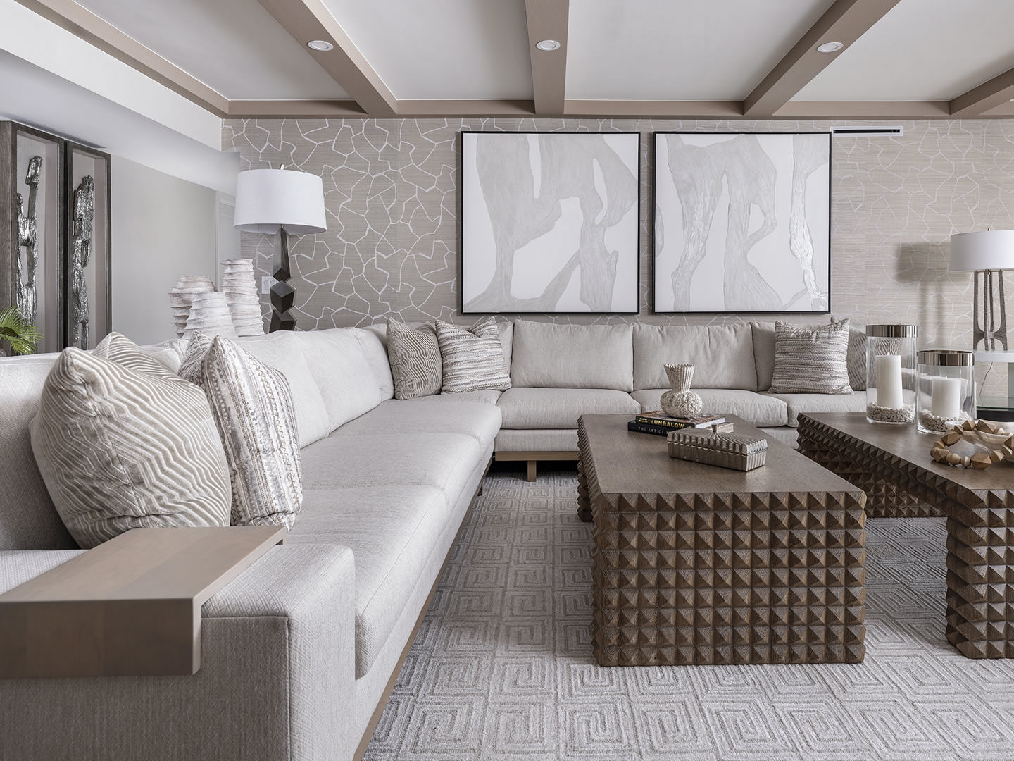 • Neutral tones, wood accents, and tactile elements like area rugs, wallcoverings, and custom furnishings bring depth and warmth.