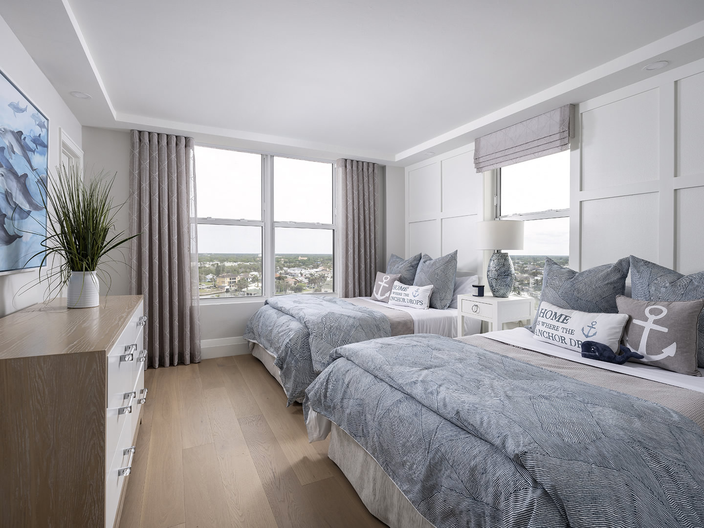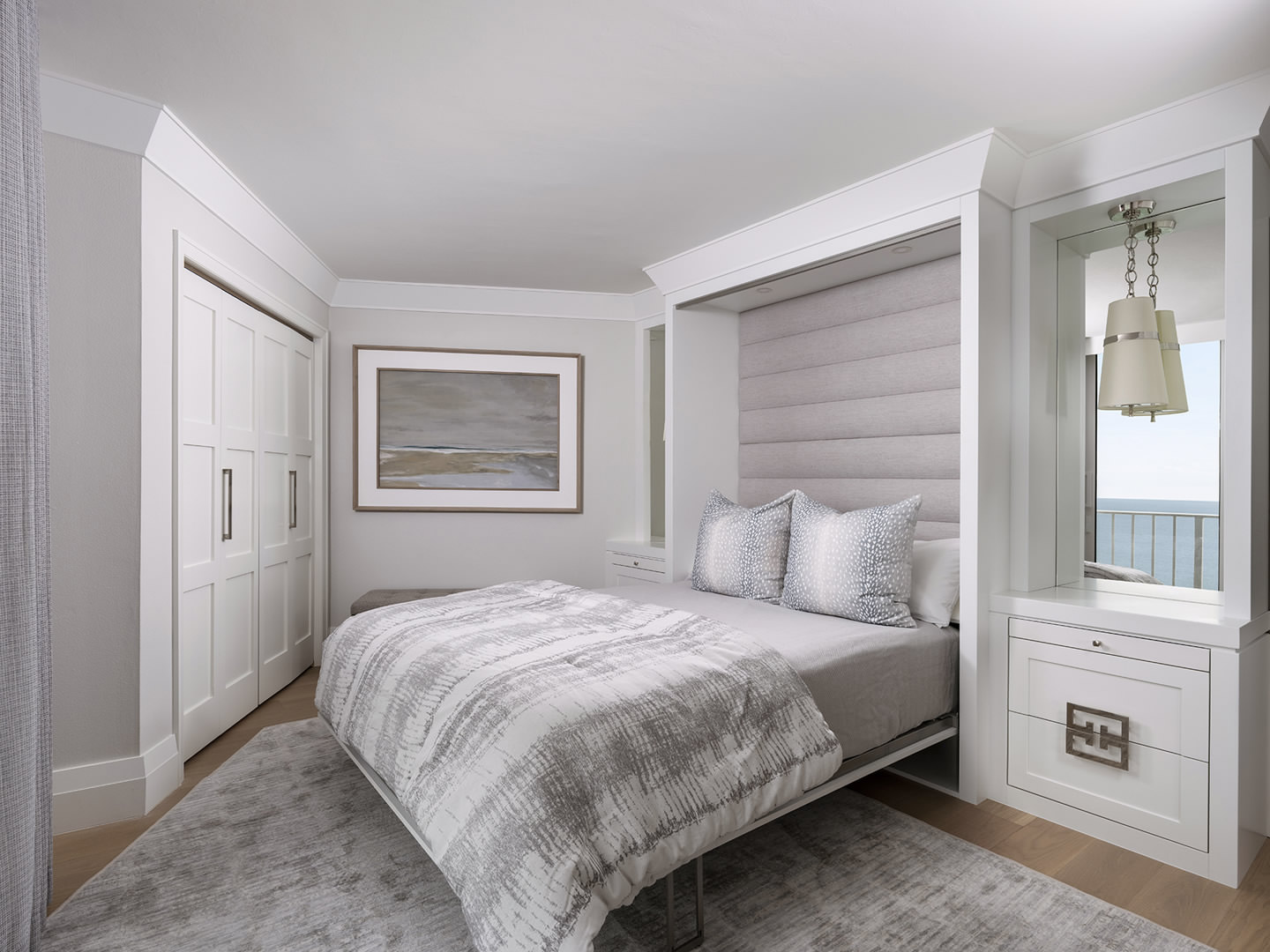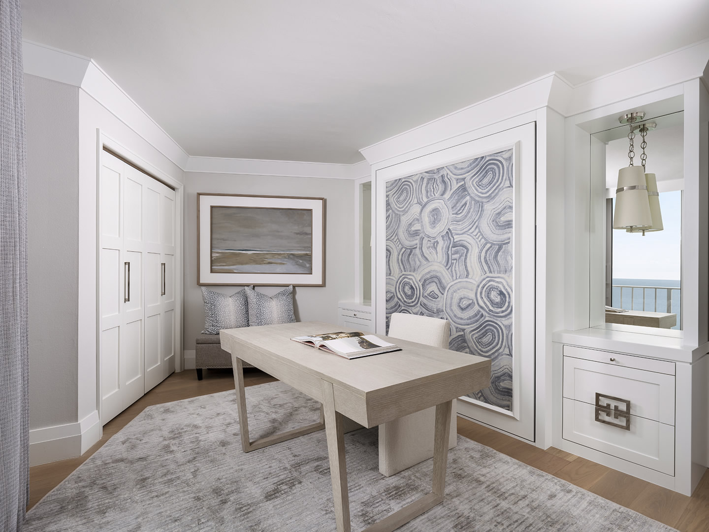 • For the den, we needed to design a dual space for the office and guest bedroom. We designed a custom Murphy bed that functions as a feature wall when raised and resembles a well-appointed guest suite when lowered.