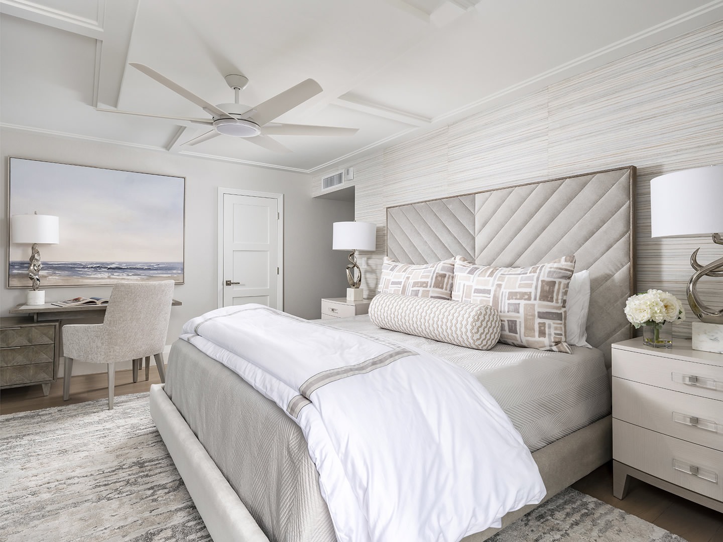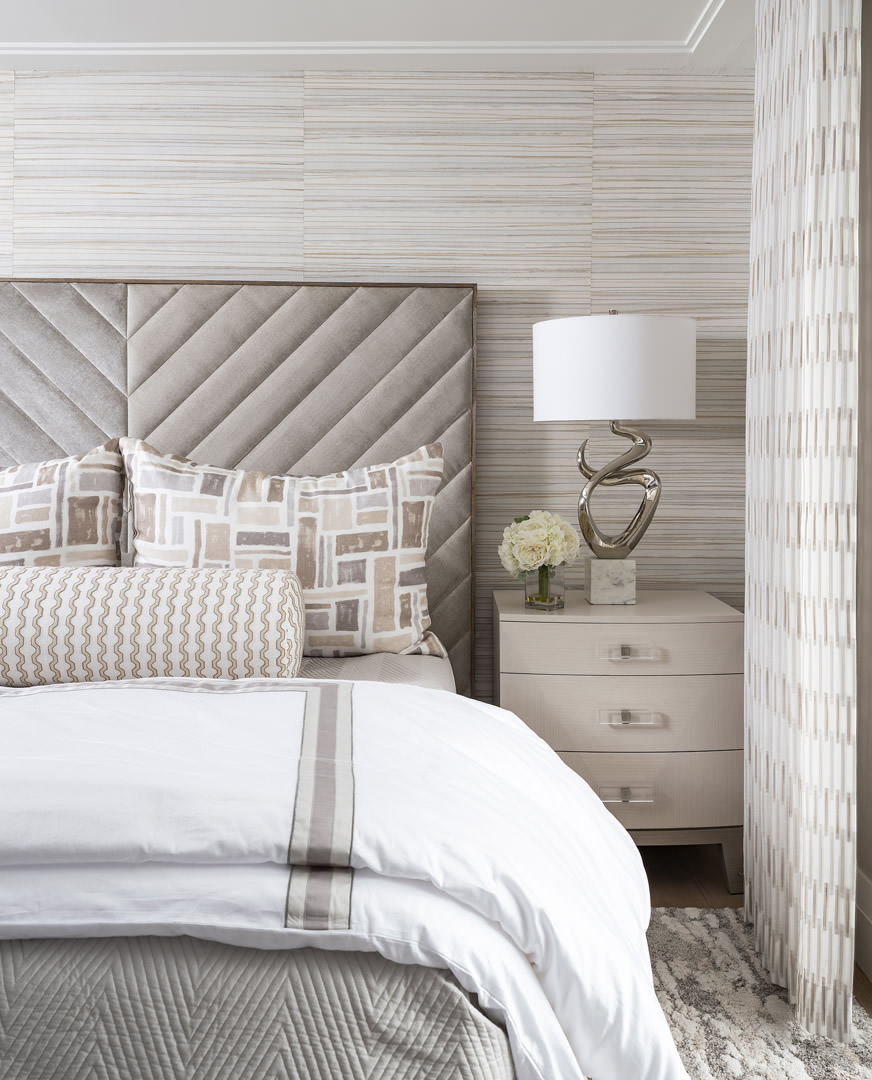 • The master suite is layered in organic neutrals with a gorgeous wallcovering feature wall