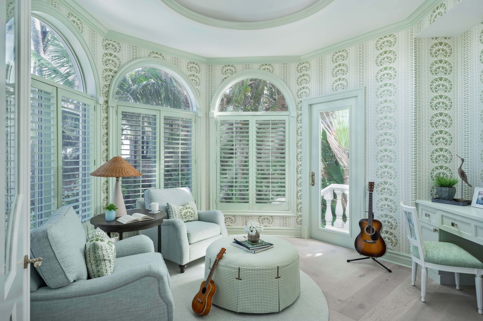 Beyond books, the Den embraced creativity, featuring Thibaut wallpaper as an inviting backdrop for keyboard and guitar jam sessions. A custom desk in Livable Green concealed the keyboard and amplifier when not in use, combining practicality with style.