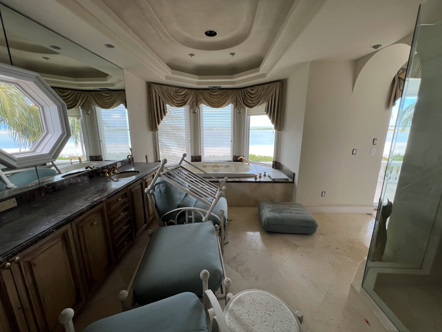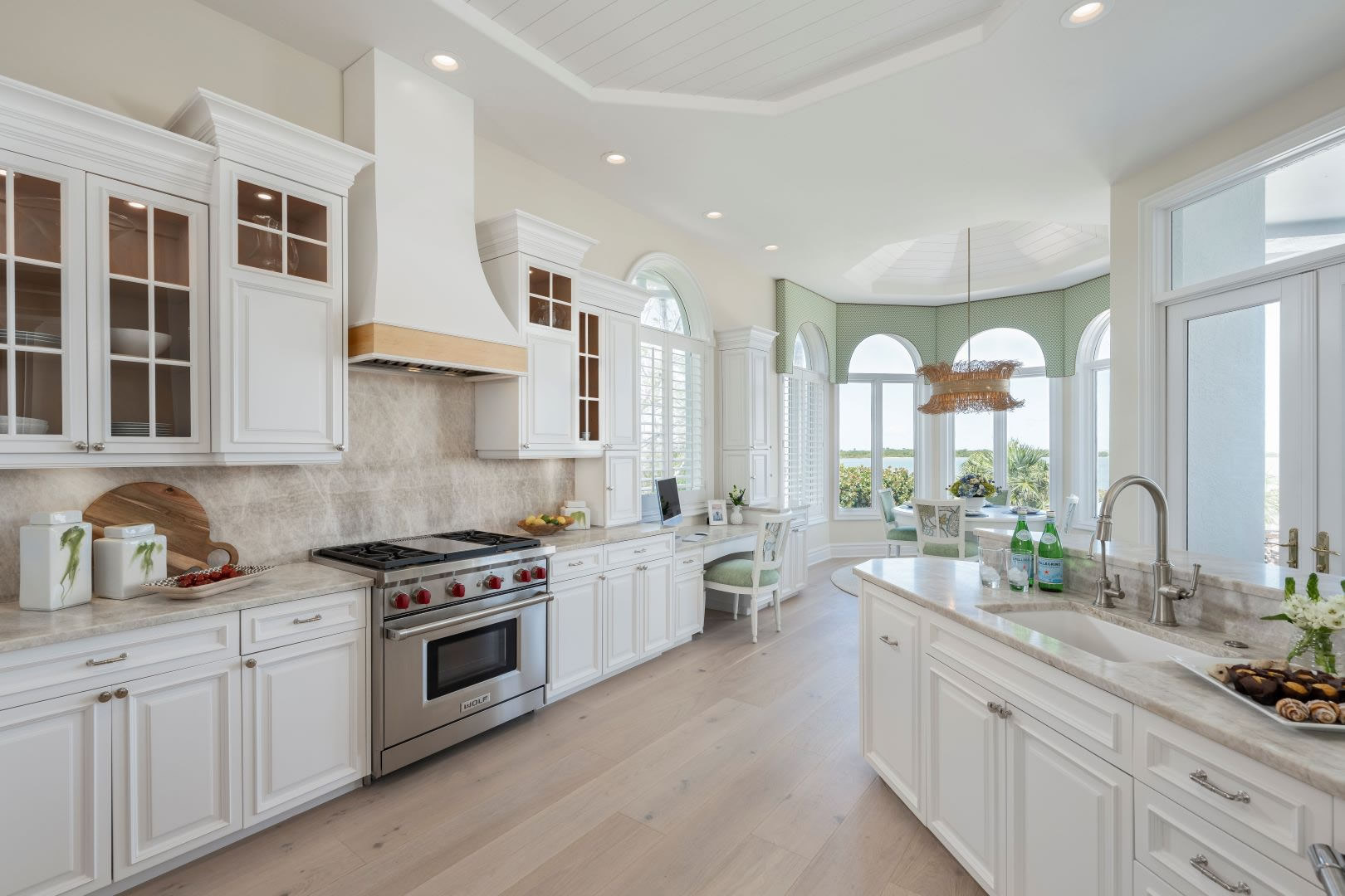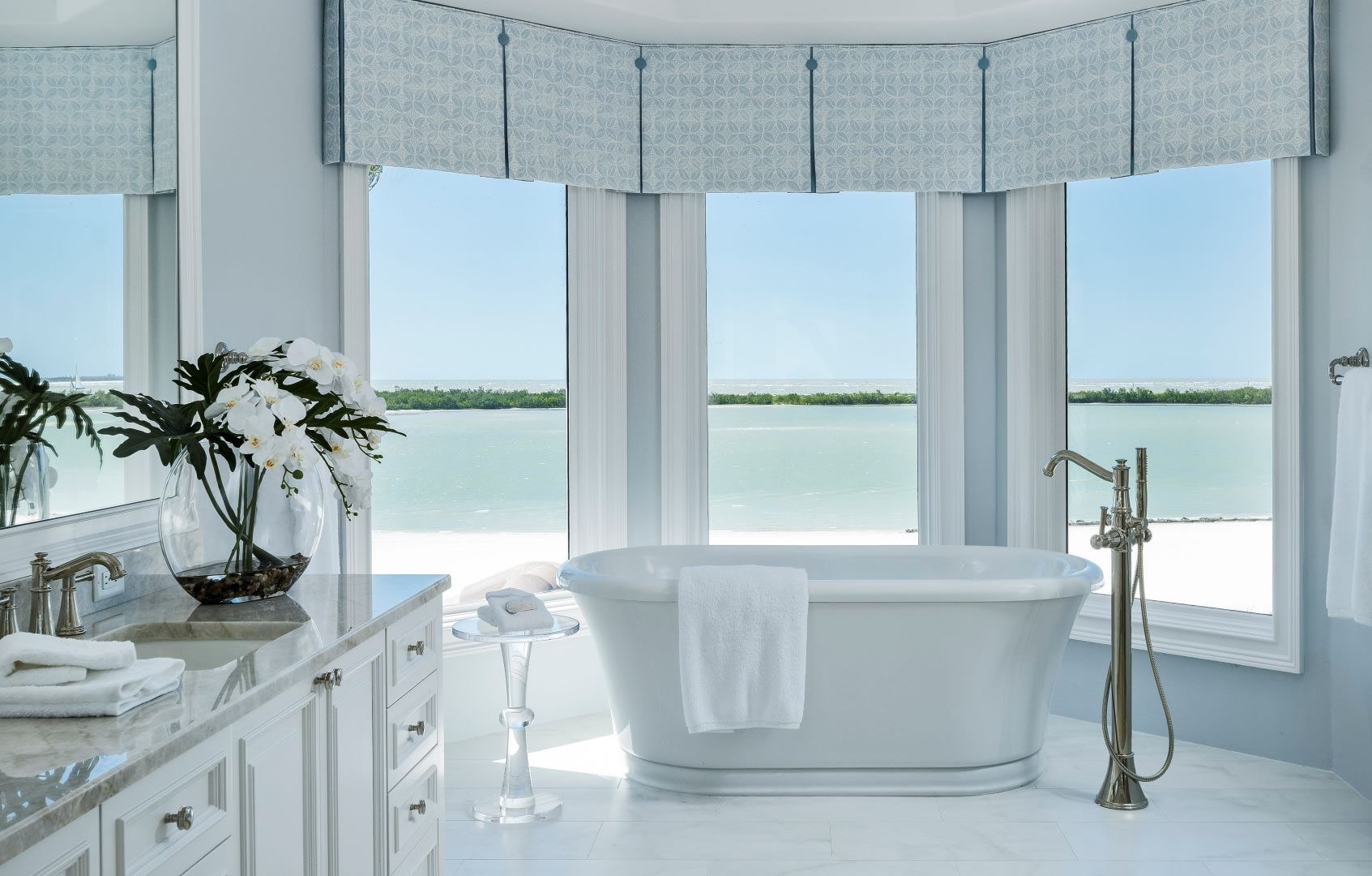 The book collection extended into the Master Suite, where a neoclassical fireplace façade and redesigned bookcases provided open and closed storage. A cozy reading nook to the left of the fireplace offered the perfect spot for literary escape. The bedroom, adorned with Schumacher wallpaper and handsome new furnishings, exuded refined elegance. To define the suite, custom arched doors separate the bedroom from the remodeled Master Bath. The bath was rejuvenated with freshly painted cabinetry, quartzite countertops, upgraded plumbing, Calcutta-like tile in the shower, and framed mirrors that set the stage for the freestanding tub—positioned in the bay windows overlooking Big Marco Pass, a breathtaking setting to unwind and escape into a story.
