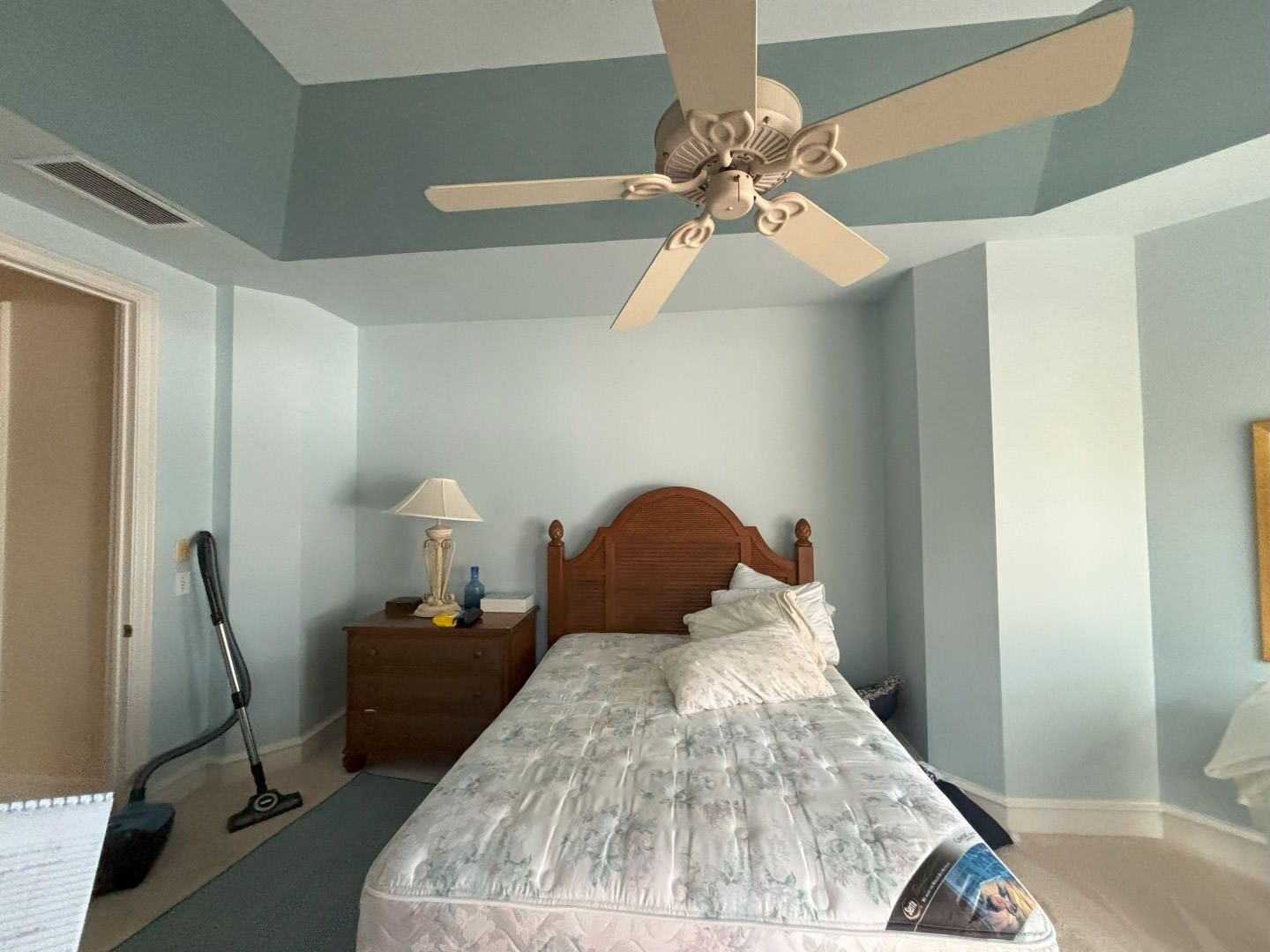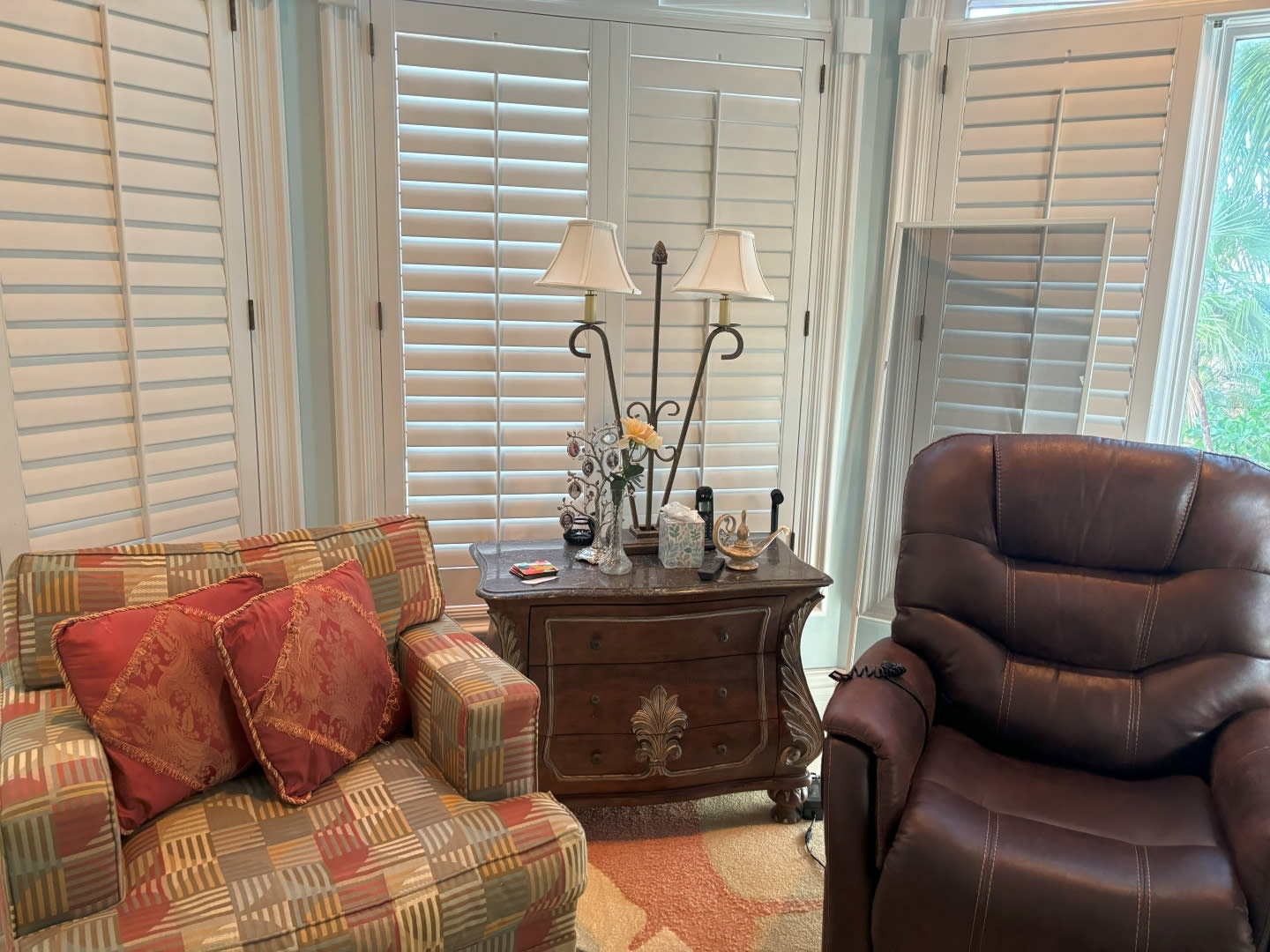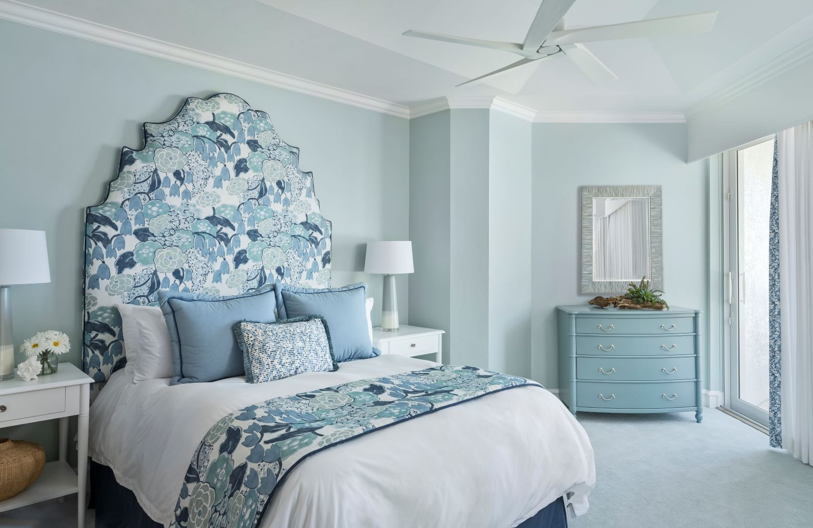 The book collection extended into the Master Suite, where a neoclassical fireplace façade and redesigned bookcases provided open and closed storage. A cozy reading nook to the left of the fireplace offered the perfect spot for literary escape. The bedroom, adorned with Schumacher wallpaper and handsome new furnishings, exuded refined elegance. To define the suite, custom arched doors separate the bedroom from the remodeled Master Bath. The bath was rejuvenated with freshly painted cabinetry, quartzite countertops, upgraded plumbing, Calcutta-like tile in the shower, and framed mirrors that set the stage for the freestanding tub—positioned in the bay windows overlooking Big Marco Pass, a breathtaking setting to unwind and escape into a story.
