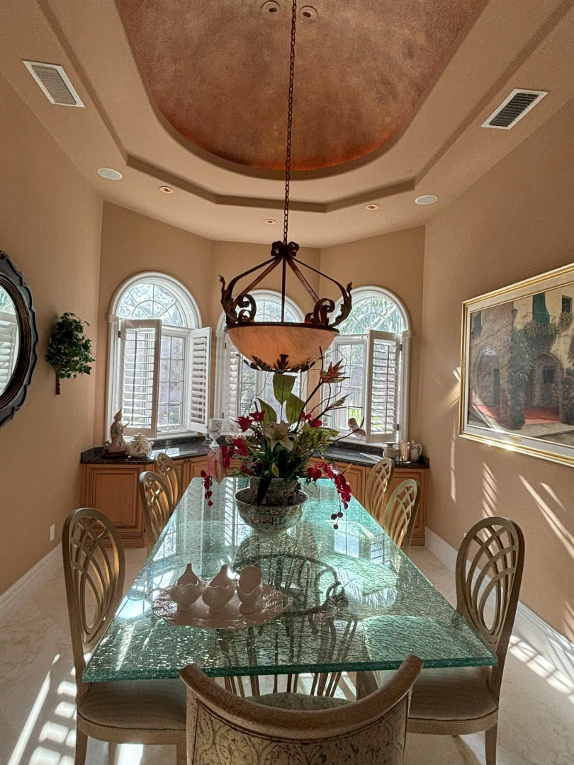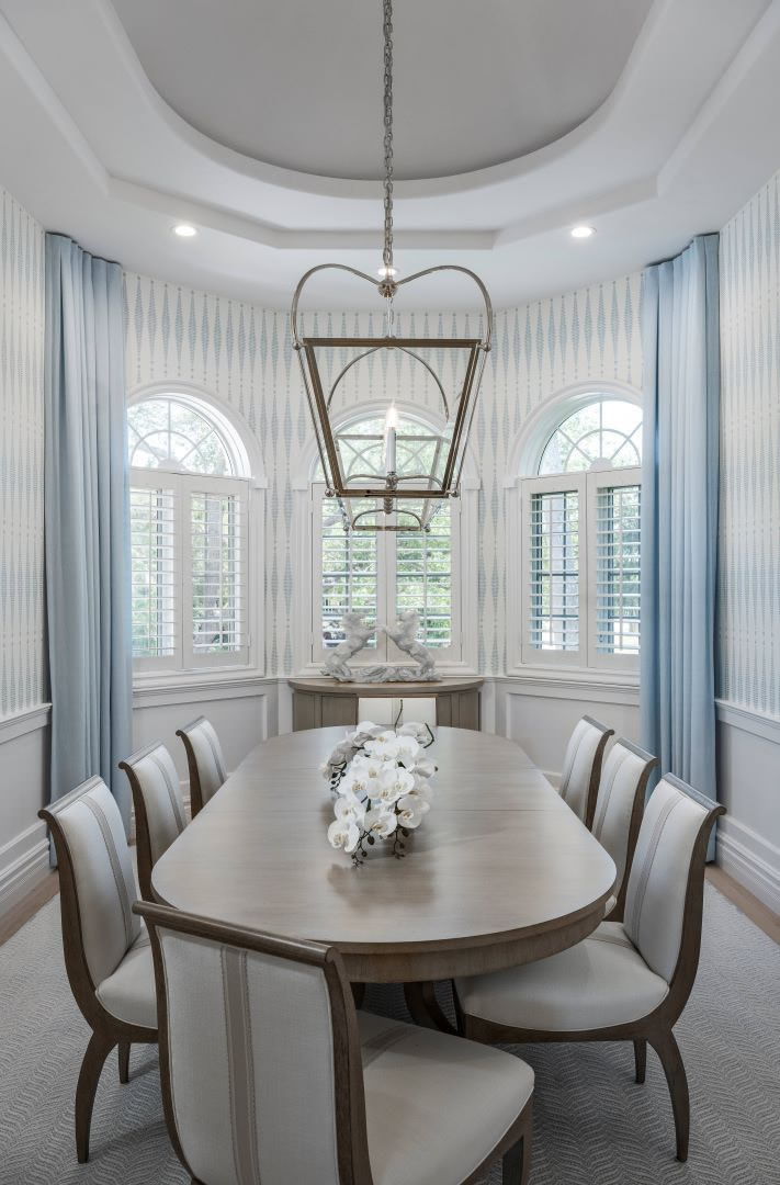 Ceiling treatments were tailored to each space—a coffered library ceiling in the Great Room, Nickel Gap detailing in the Kitchen and Breakfast Nook, and a refined cove treatment in the Master Bedroom. Redesigned niches in the Dining Room, inspired by the Oval Office, and stairway niches integrated more of the book collection, reinforcing the home’s literary theme.
