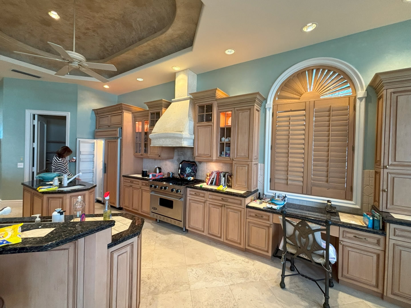 The Kitchen’s cabinetry was refinished in crisp Beach White, paired with Taj Mahal quartzite countertops that elegantly cascaded into the backsplash. A custom hood was created to bridge the upper cabinets, adding refinement and continuity to the space.