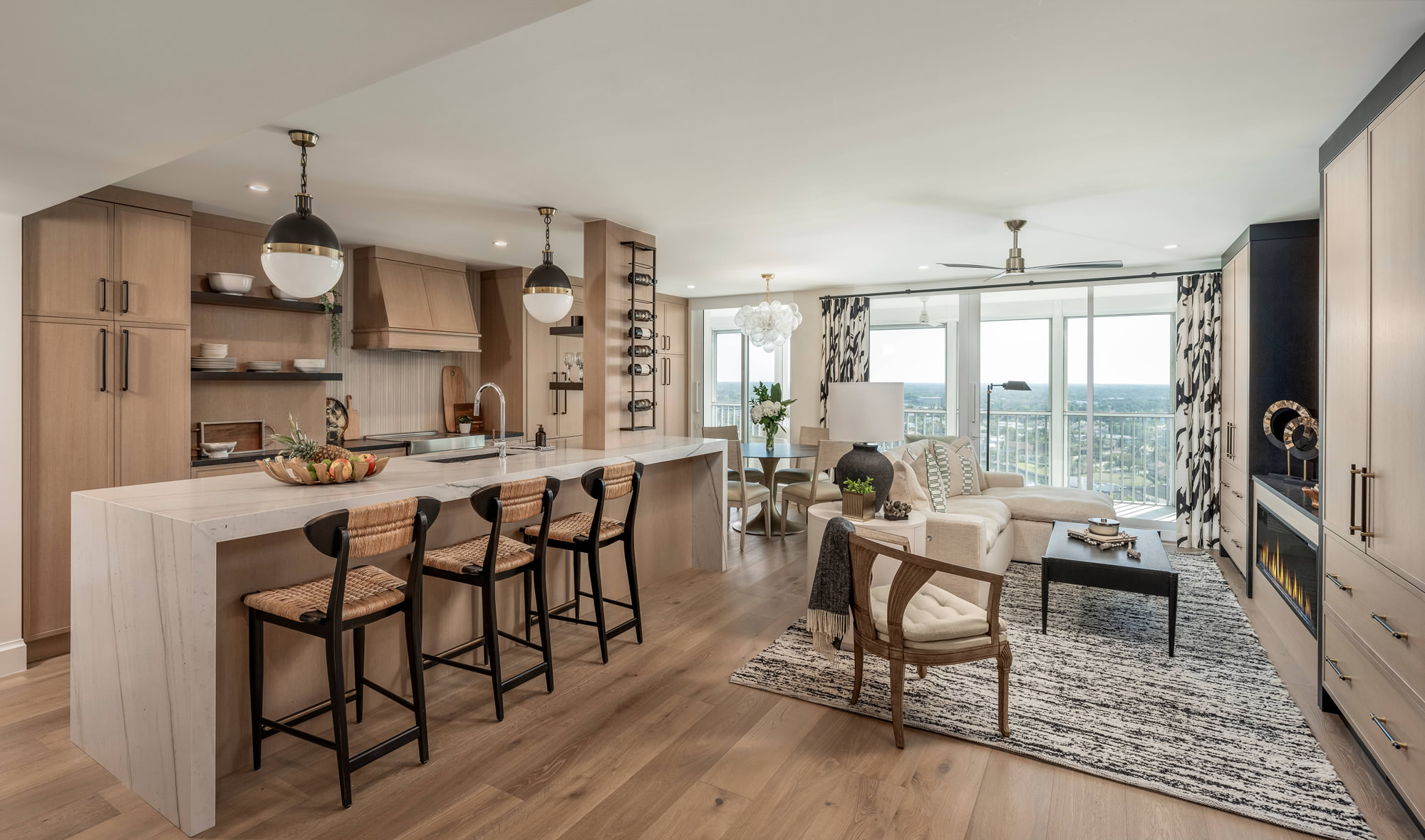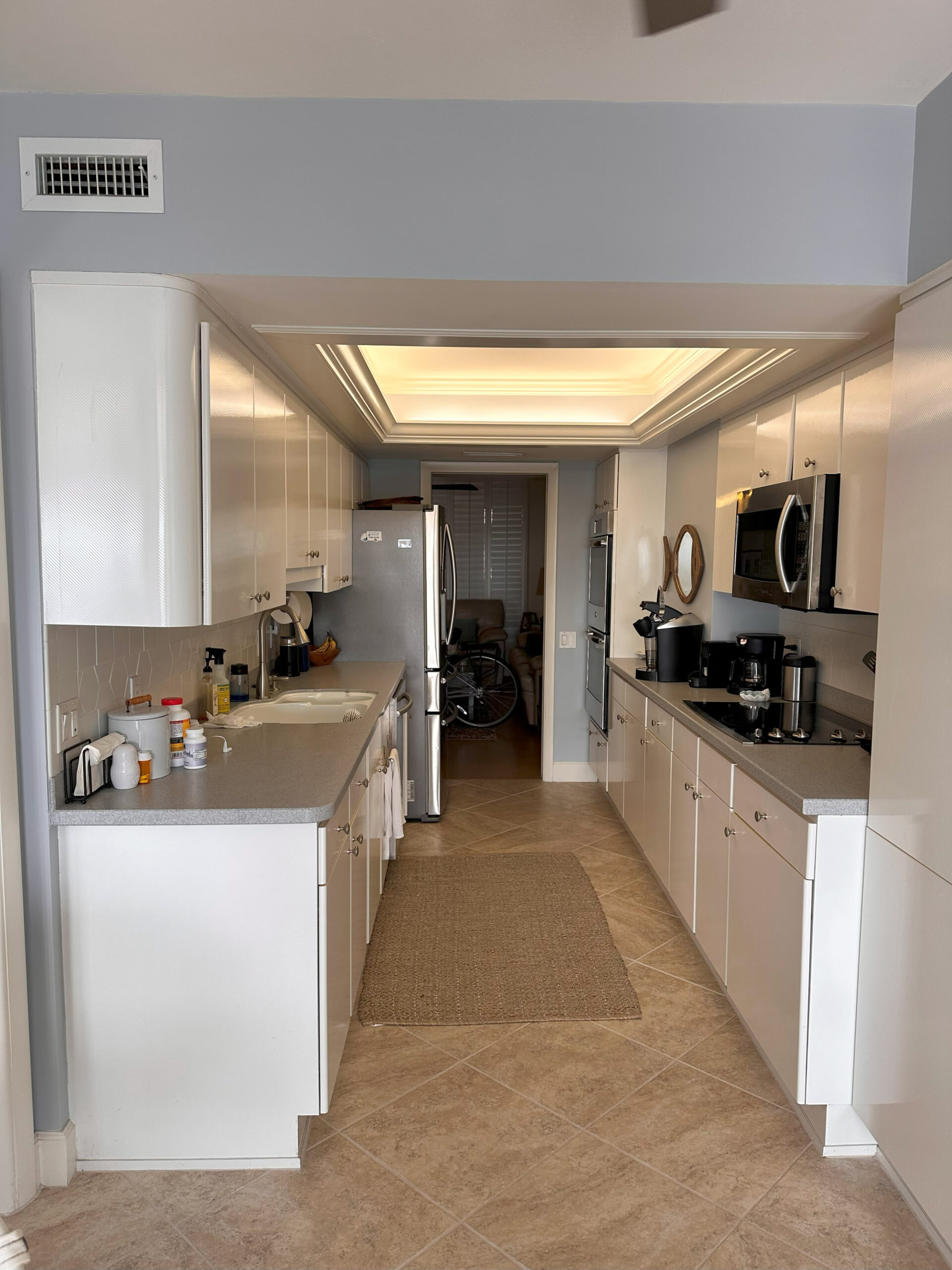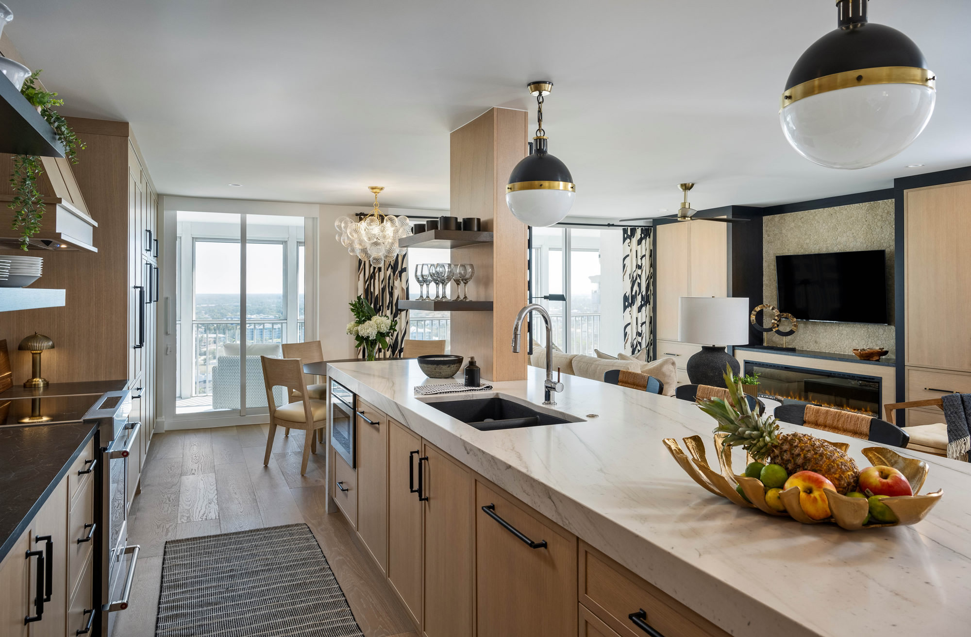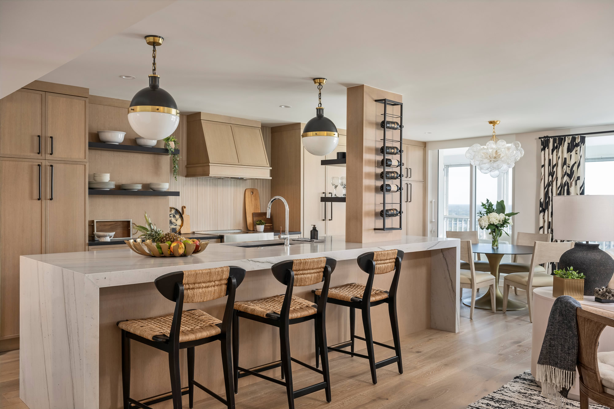 After years of ownership, the client set out to completely reimagine their penthouse at the Monaco Beach Club—beginning with the kitchen. Once a closed-off galley, the space was opened up by removing dividing walls, unveiling an expansive layout centered around a dramatic 12-foot quartzite island with waterfall edges. Designed as both a showpiece and a gathering hub, the island features a built-in microwave, double trash cabinet, oak-paneled dishwasher, large sink, and generous storage.