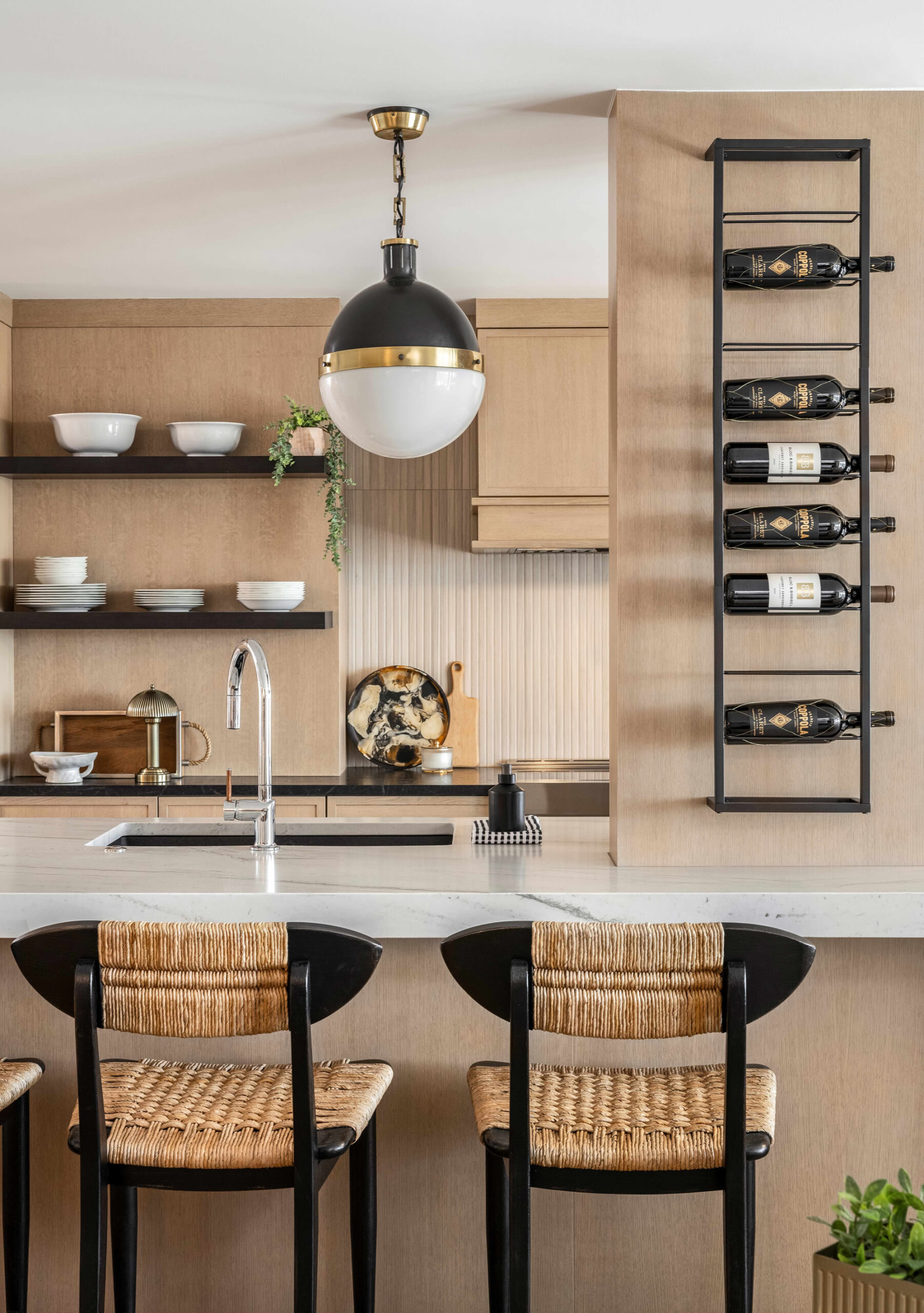 A standout challenge involved two immovable pipe chases, which the designer transformed into focal points. One, located within the island, became an elegant wine display with floating black shelves and a sleek rack. The second, next to the range, was clad in oak and accented with black shelving, blending seamlessly into the design.