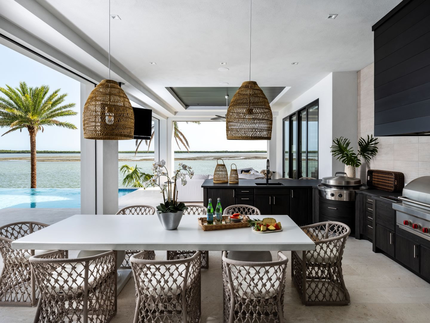 In the dining area, a ten-foot-long stone pedestal table stands as a sculptural centerpiece, encircled by eight nautical rope-wrapped chairs and flanked by five coordinating counter stools—ready to host cheerful feasts. The lounge encourages relaxation, offering a deep upholstered sectional and woven lounge chairs ideal for catching a game on the outdoor television, watching dolphins dance offshore, or basking in the vivid hues of a Gulf Coast sunset.