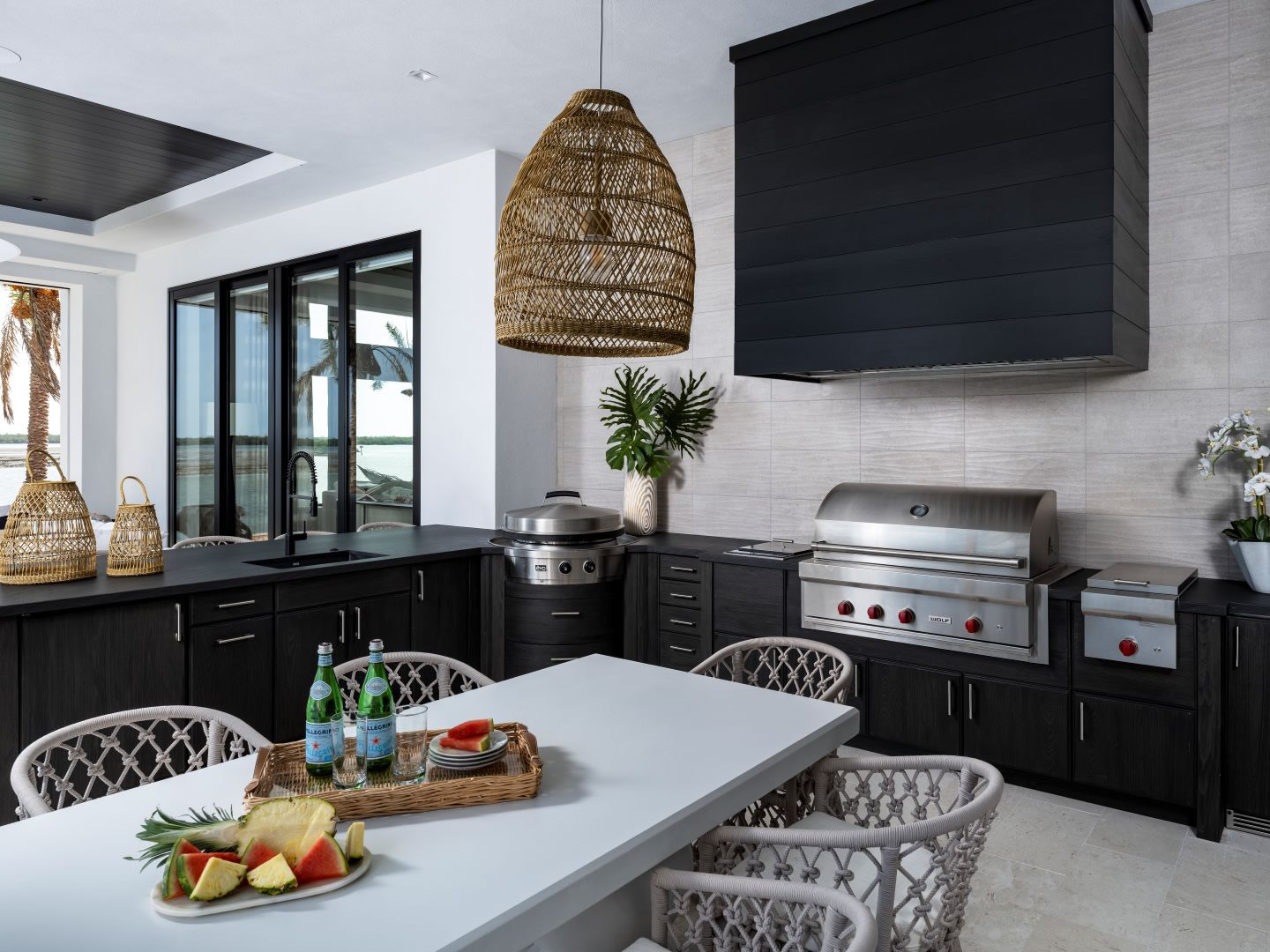This extraordinary outdoor living sanctuary artfully fuses aesthetic beauty with intelligent design—crafted to host spirited gatherings of loved ones while indulging the desires of the devoted culinary aficionado. At its core lies a professional 42” Wolf gas grill equipped with supplementary burners and a deep fryer, complemented by an Evo circular flattop ideal for lively, interactive cooking. Discreet under-counter appliances—refrigerator, ice maker, and trash disposal—are seamlessly concealed within sleek, panel-ready NatureKast slab-front cabinetry in an Arctic Slate finish. Above, Black Vermont Riverwashed stone countertops frame an Anthracite single-bowl sink paired with a matte black pull-down faucet, effortlessly marrying style with utility.
