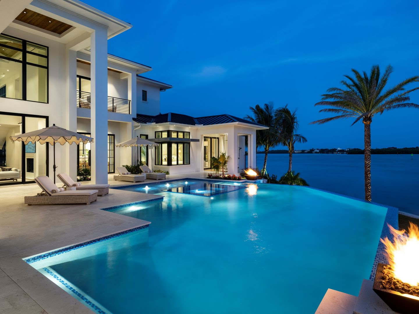 Just beyond, woven chaises under whimsical umbrellas line a breathtaking infinity-edge pool that appears to spill seamlessly into the Gulf. This aquatic haven features a sunken hot tub, a sun ledge with bubbling jets, and a captivating glass-tiled spillover wall, dramatically lit by fire bowls that flicker with enchantment at dusk.