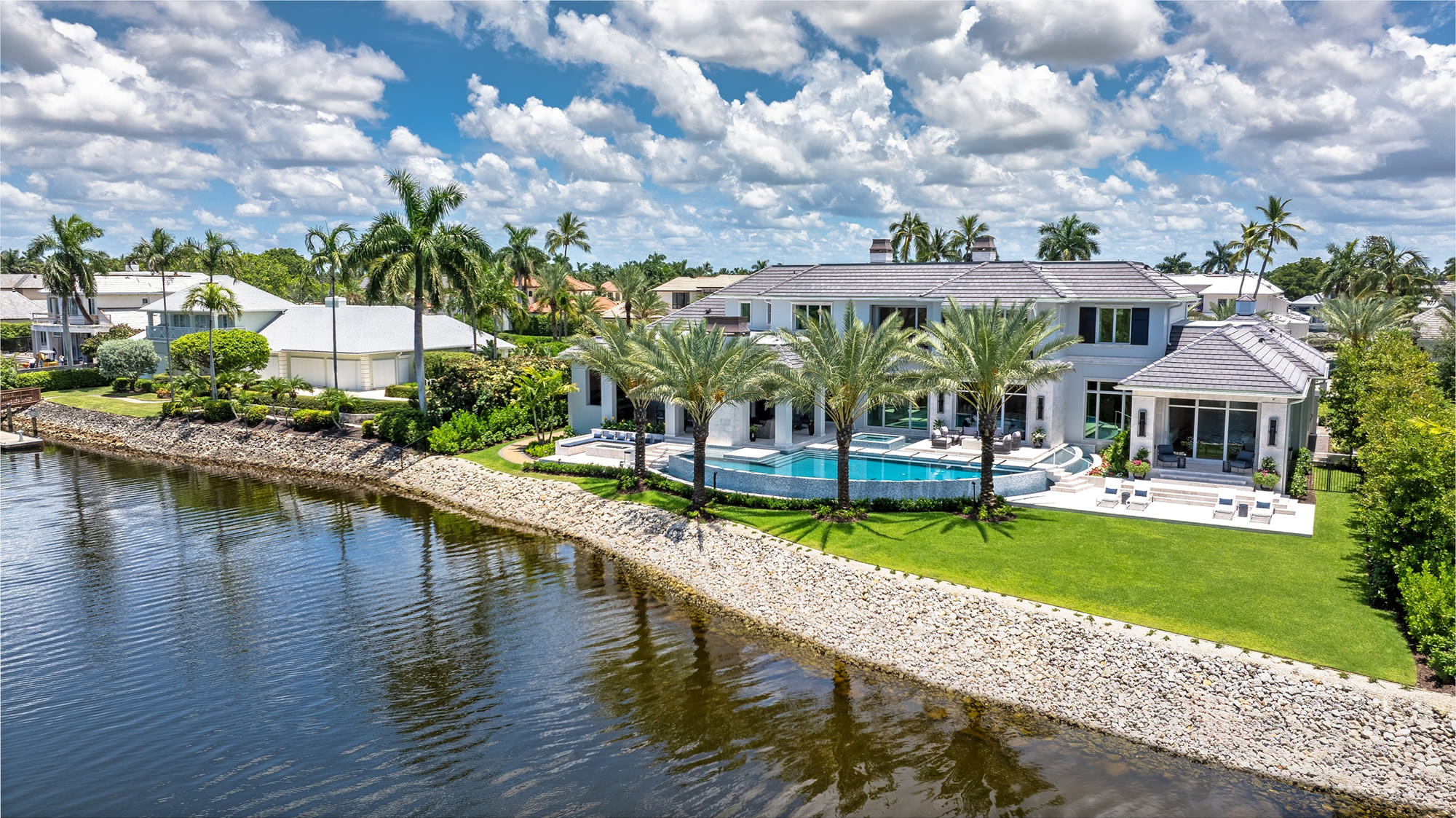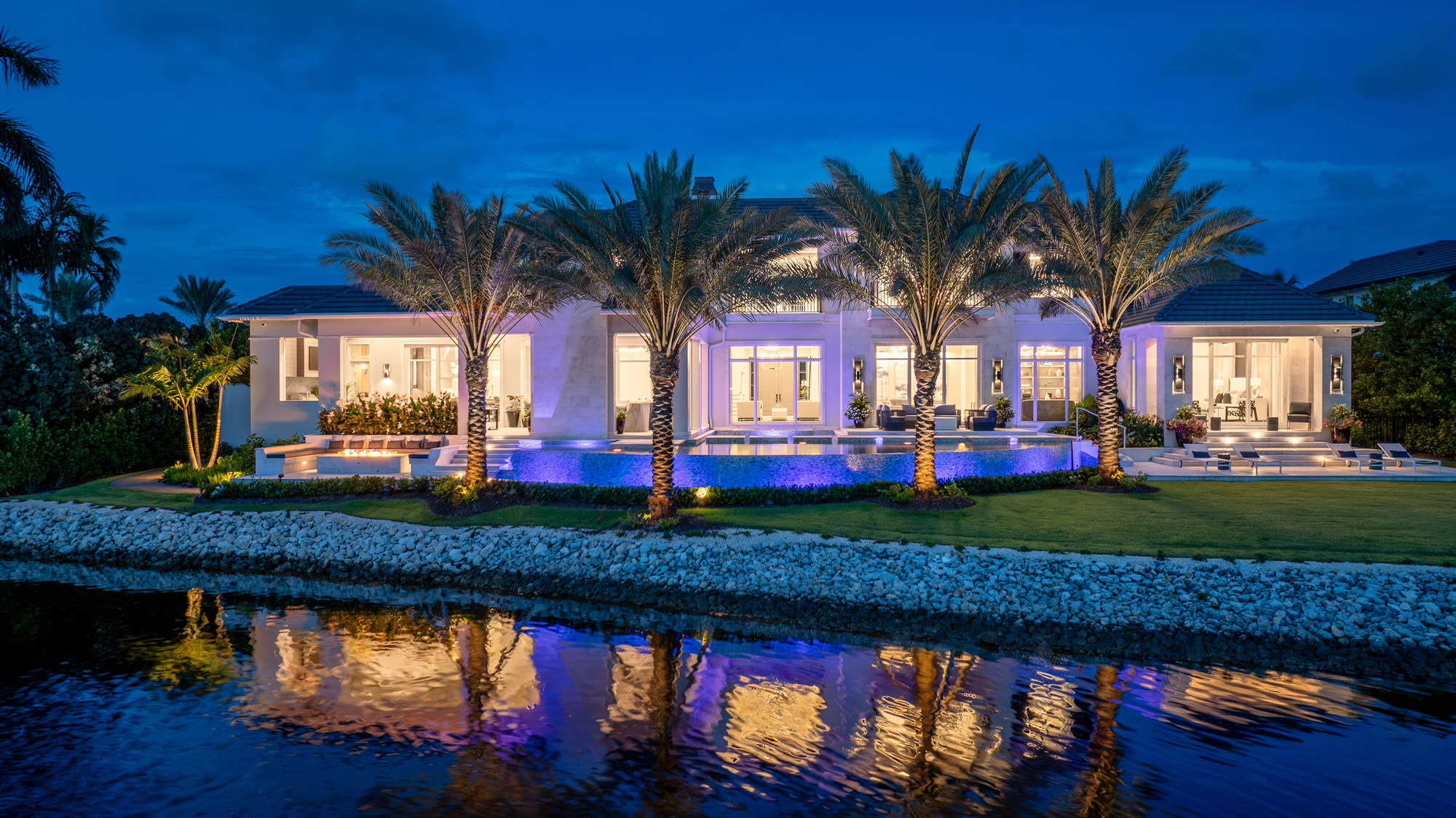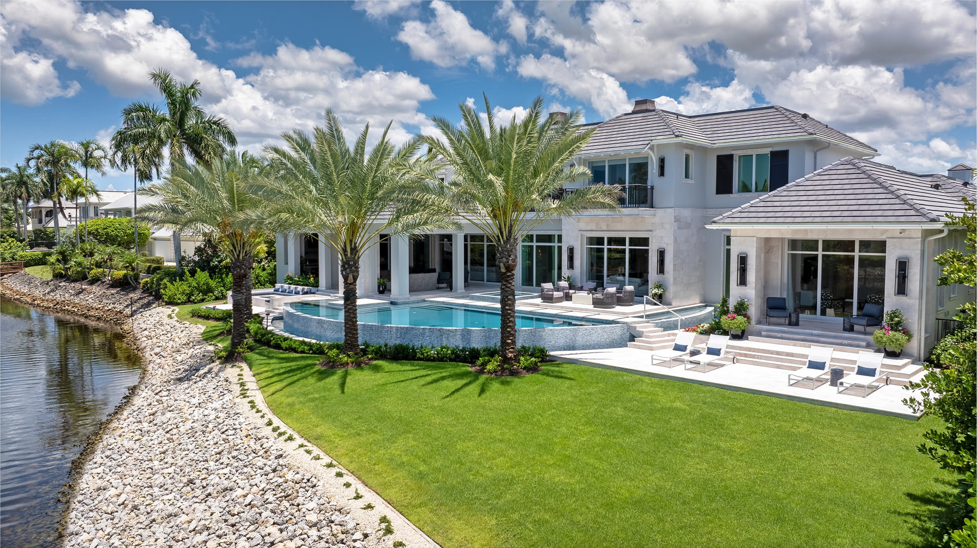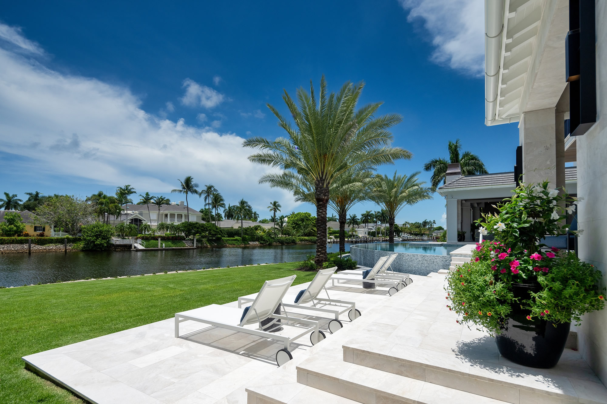 At the heart of this waterfront Port Royal estate lies a showstopping half-moon shaped infinity-edge pool, designed by Windam Design to capture sweeping views and elevate everyday living. The pool’s elegant design includes a sun shelf for lounging in the water and a raised spa, all wrapped in luxurious shell stone decking that stays cool underfoot and adds a natural, coastal aesthetic.