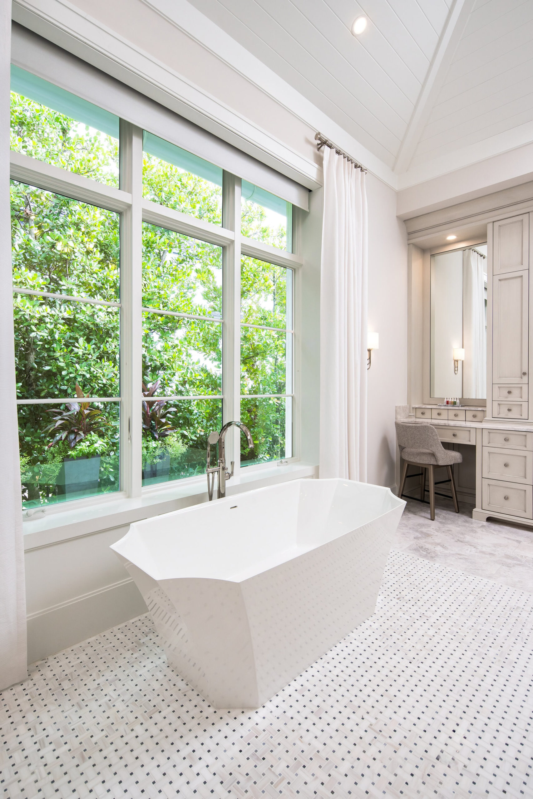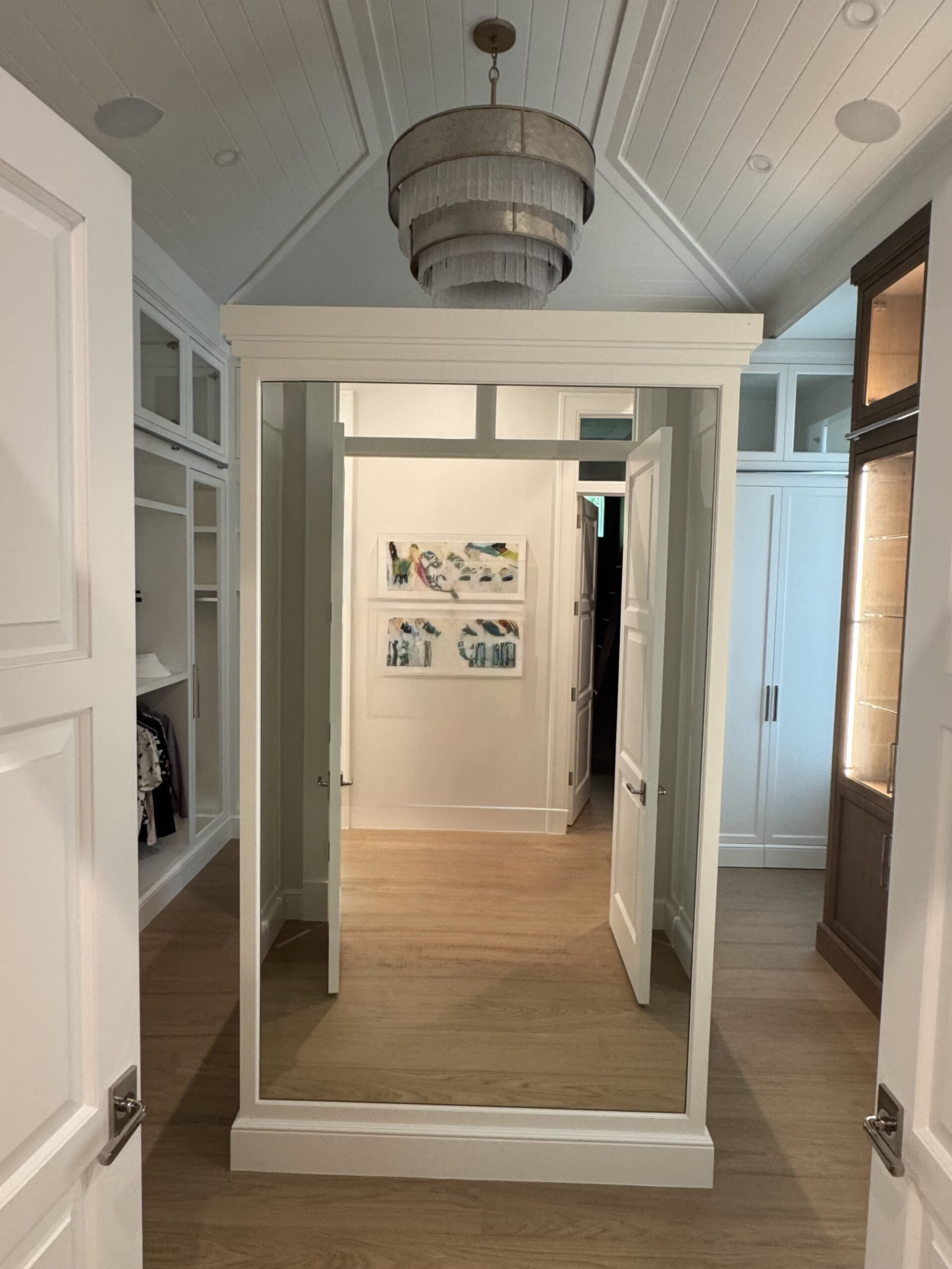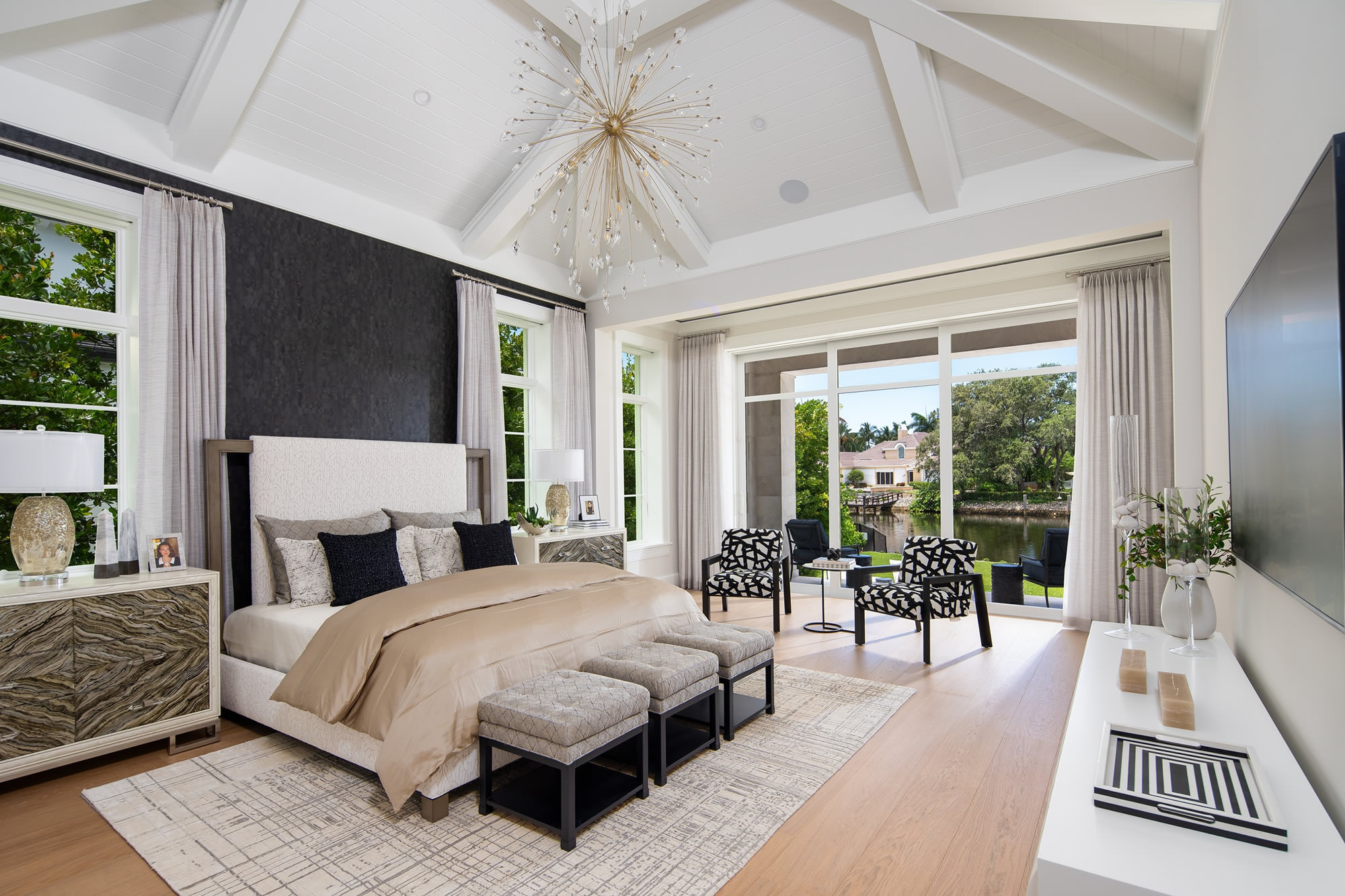 A big contributor to commanding the highest sale on the street among seven newly constructed homes, this master suite in Port Royal is a masterclass in refined design and quiet opulence. Dual entrances—one through grand double doors and another hidden passage from the club room—offer both presence and privacy. Inside, custom millwork and decorative beams complement the RIVA Spain wide plank wood flooring, while hidden A/C vents maintain the clean architectural lines. The light-filled bath is anchored by Ruffino Custom Cabinetry and a sculptural standalone tub, creating a true spa-like escape. Dual walk-in closets by Ruffino provide tailored storage, and from the bedroom, tranquil water views and direct access to the outdoor living area and pool via Andersen sliders complete this luxurious waterfront retreat.