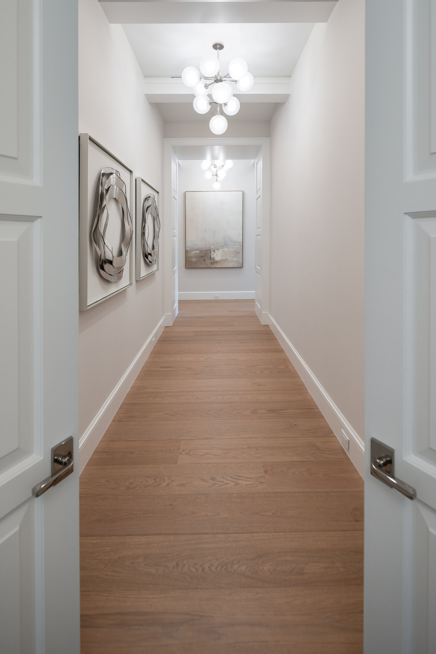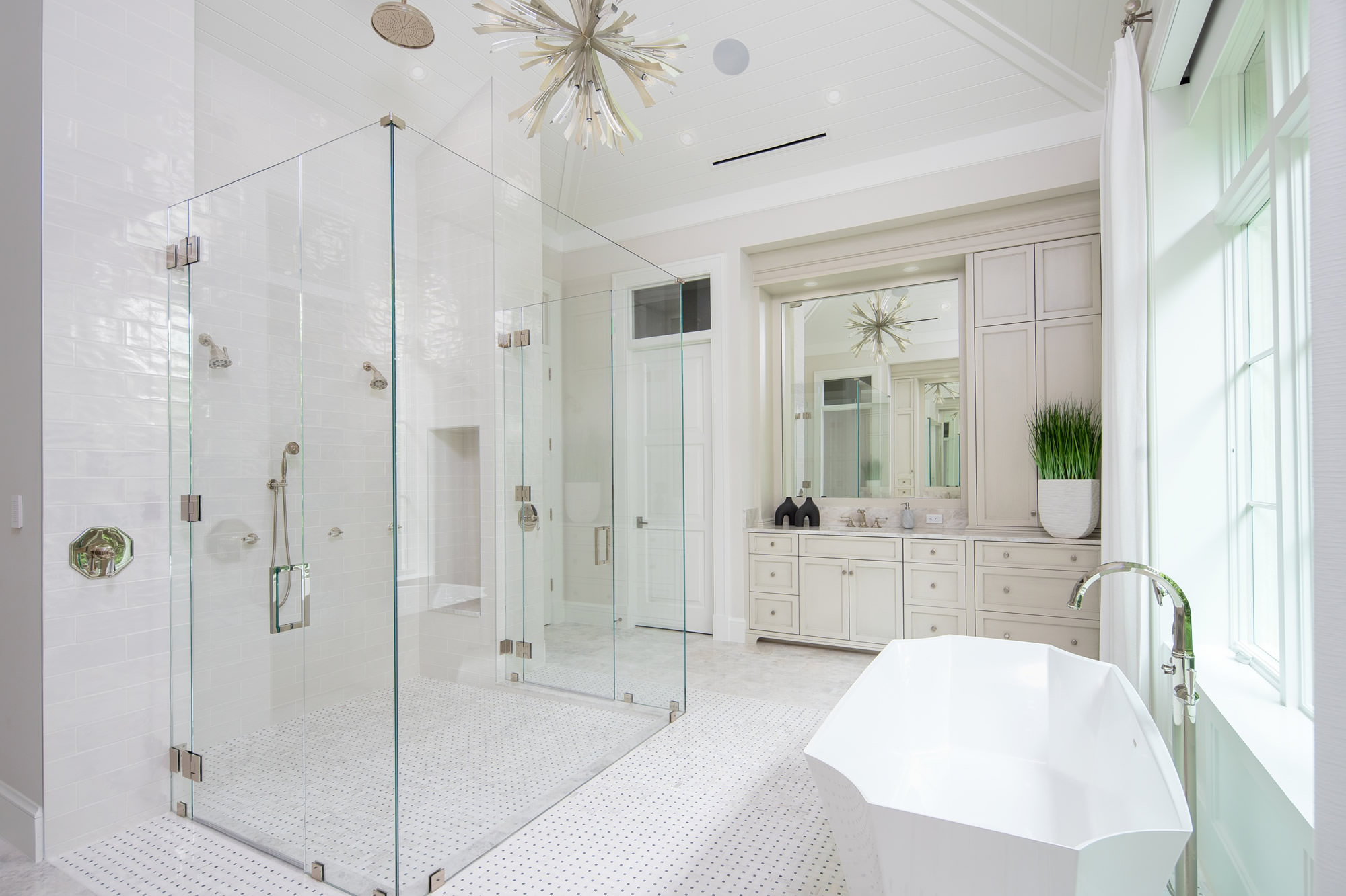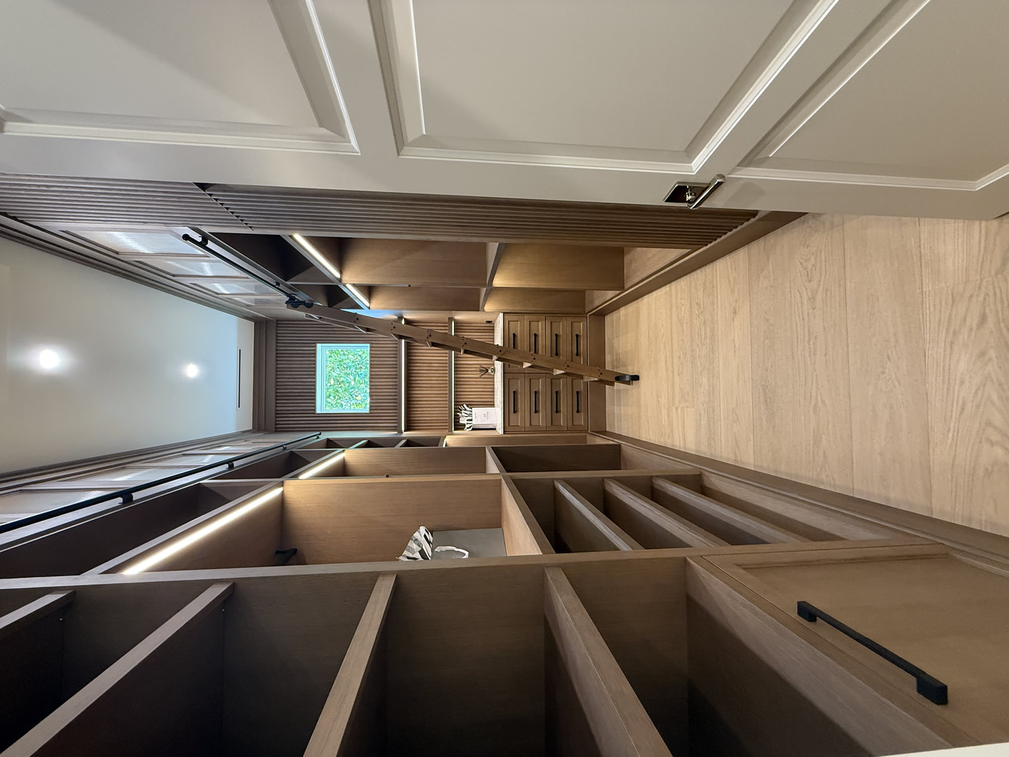 A big contributor to commanding the highest sale on the street among seven newly constructed homes, this master suite in Port Royal is a masterclass in refined design and quiet opulence. Dual entrances—one through grand double doors and another hidden passage from the club room—offer both presence and privacy. Inside, custom millwork and decorative beams complement the RIVA Spain wide plank wood flooring, while hidden A/C vents maintain the clean architectural lines. The light-filled bath is anchored by Ruffino Custom Cabinetry and a sculptural standalone tub, creating a true spa-like escape. Dual walk-in closets by Ruffino provide tailored storage, and from the bedroom, tranquil water views and direct access to the outdoor living area and pool via Andersen sliders complete this luxurious waterfront retreat.