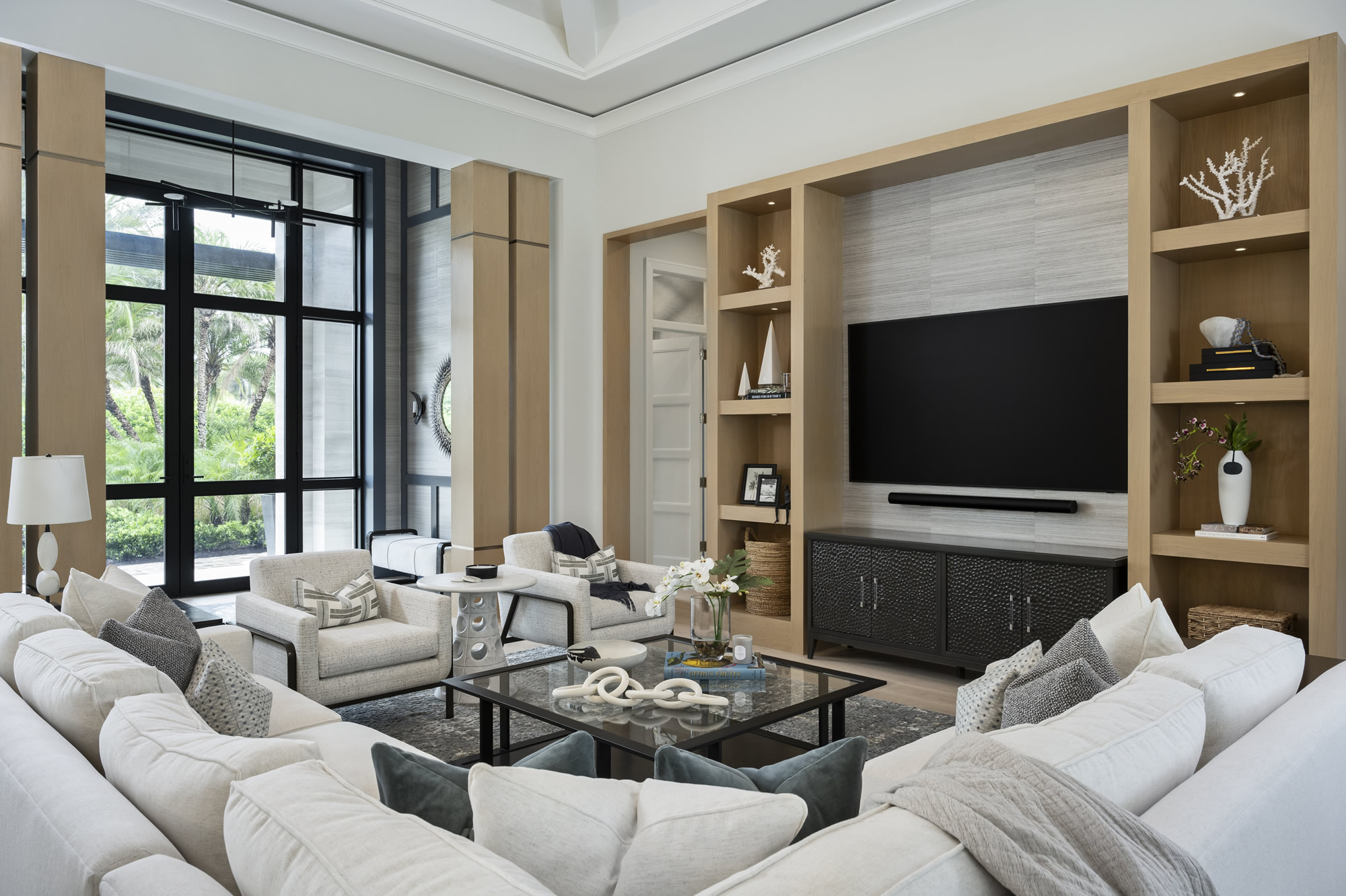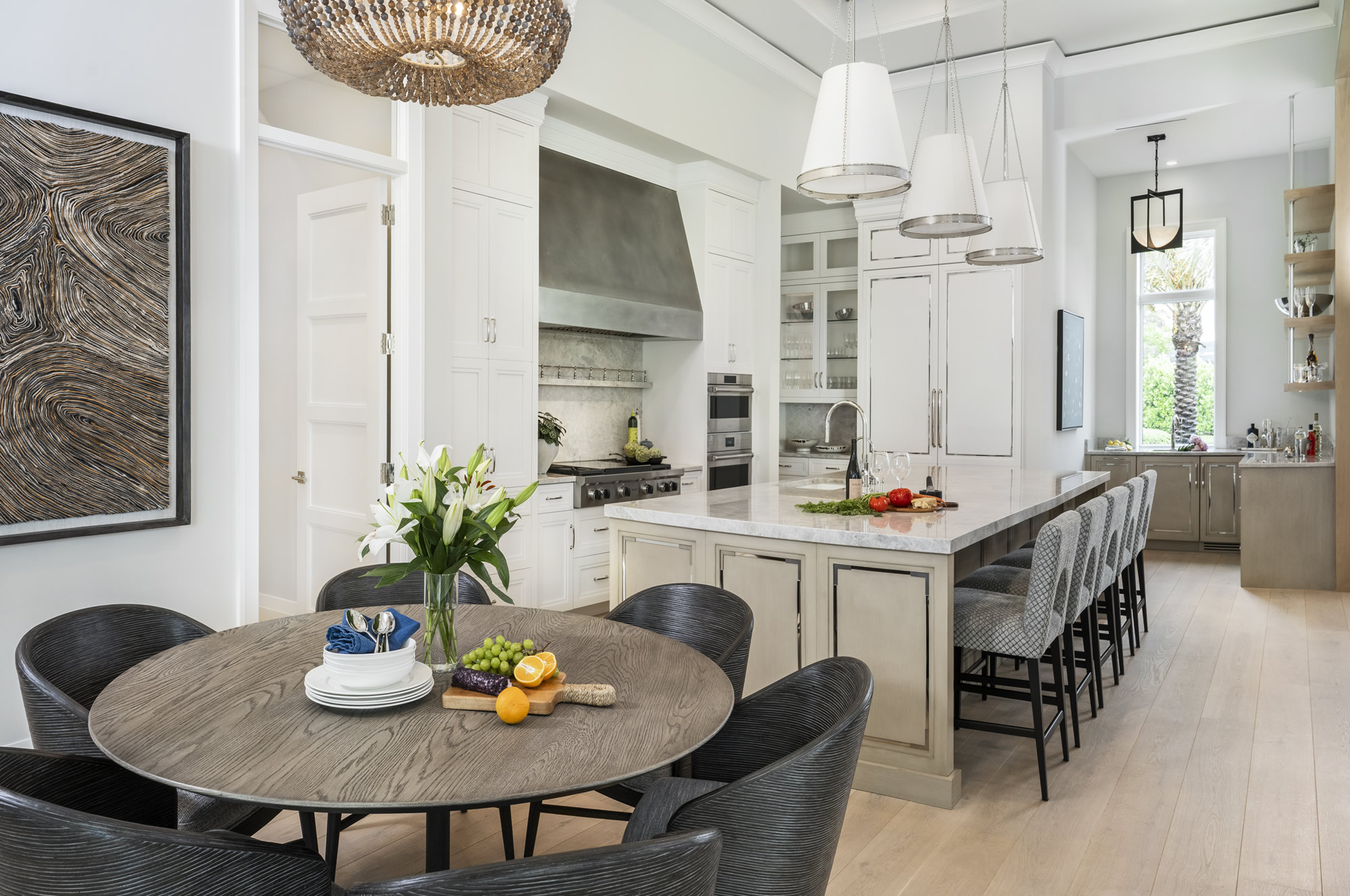 Bathed in natural light and defined by soaring ceilings, exquisite millwork, and refined organic finishes, this meticulously designed offers unmatched elegance and craftsmanship. At the heart of the home, a chef’s kitchen boasts custom floor-to-ceiling Ruffino Custom Cabinetry, a massive island ready for cooking prep and gathering, a wet bar with wine storage, and a thoughtfully placed morning bar—perfect for everyday luxury and entertaining.