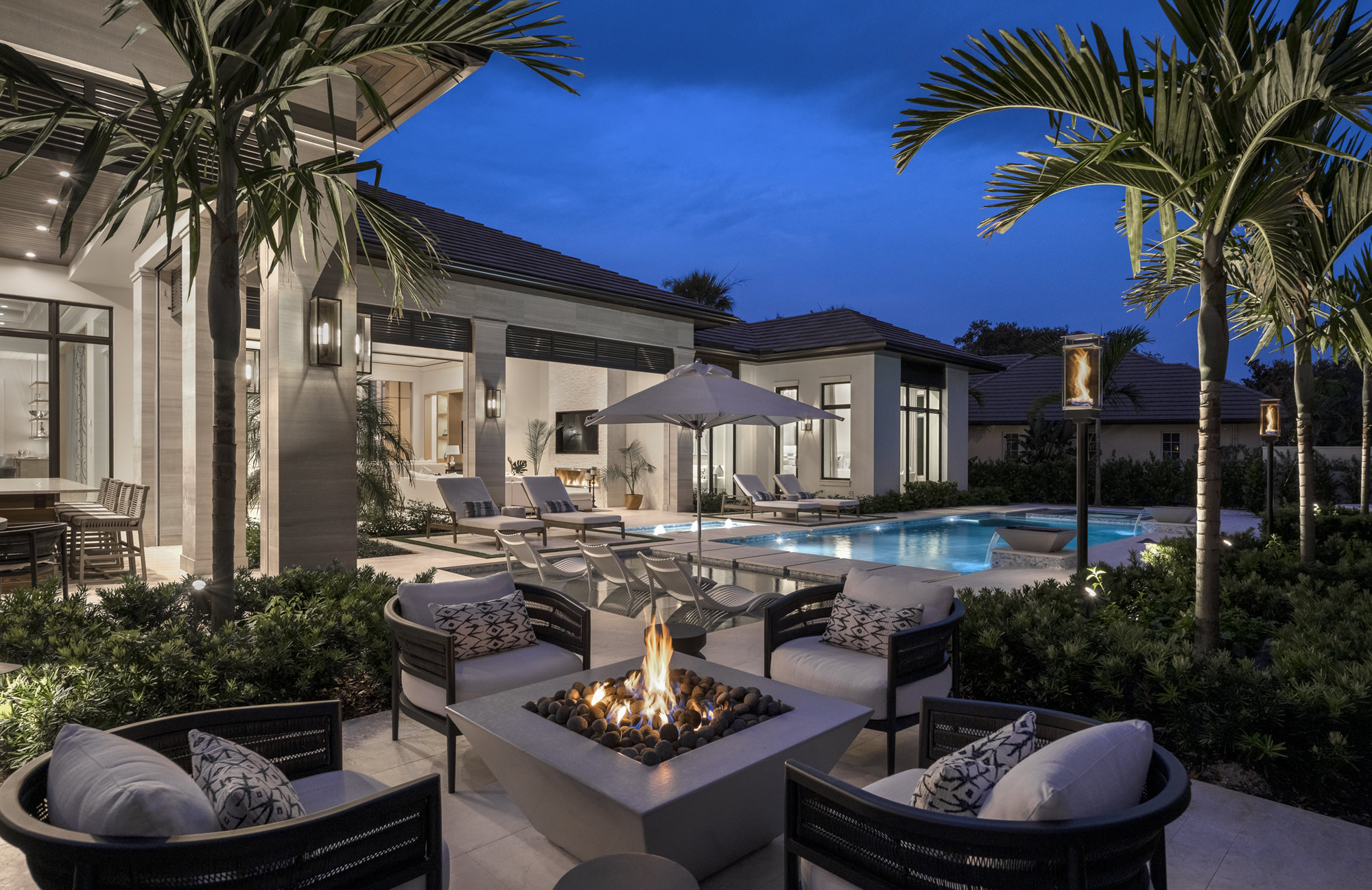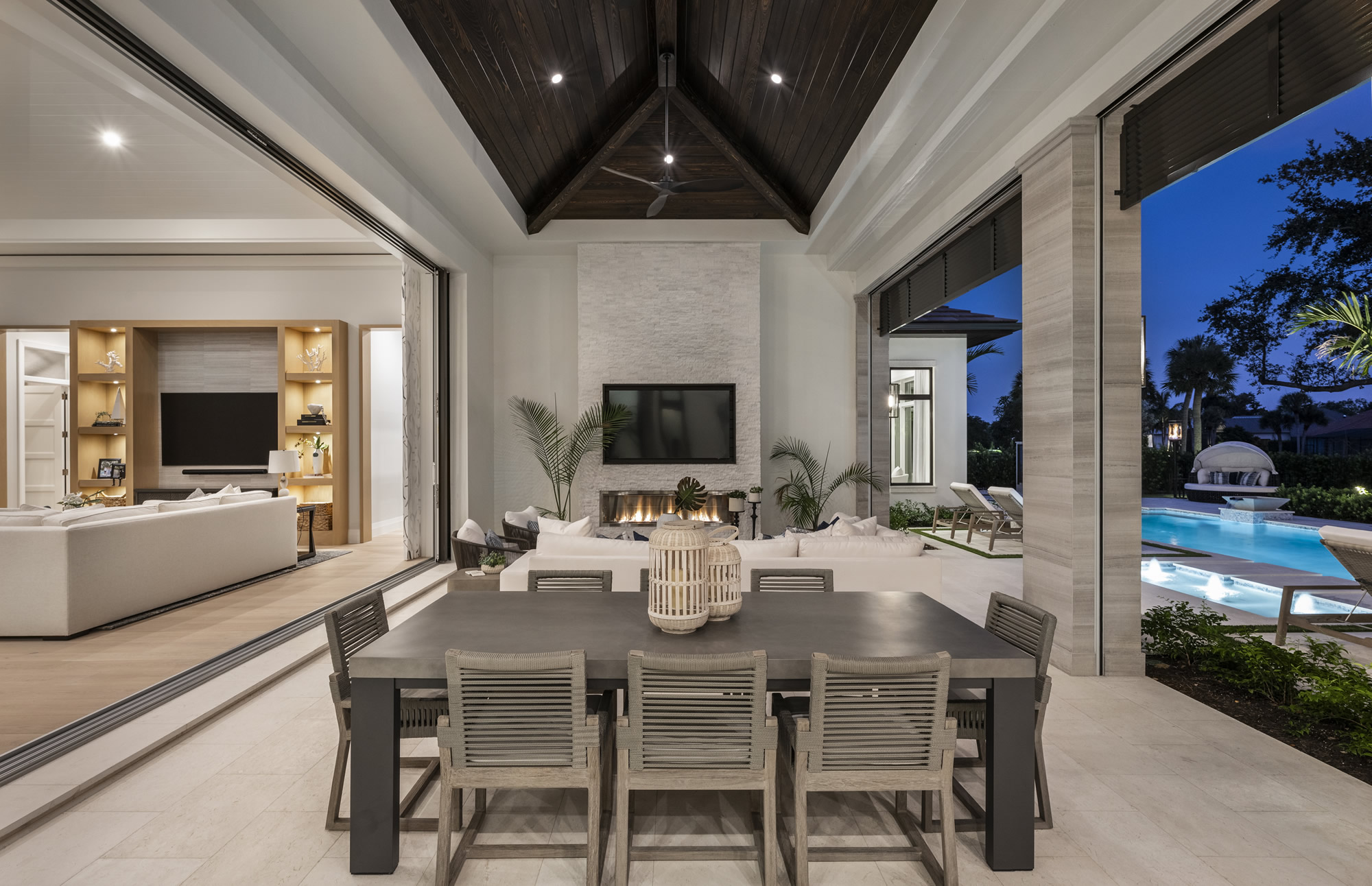 The expansive great room, highlighted by a dramatic tongue and groove ceiling and beams with hidden a/c vents, opens to a serene lap pool with captivating lake views. Inside, a luxurious master wing offers a private sanctuary, complemented by four spacious guest suites with en-suite bathrooms and a richly appointed media room. Outdoors, the lakefront backyard is a private oasis featuring a spa, outdoor kitchen, fireplace, and media-ready living area. With almost 8,000 square feet of total living space, three garages, and Crestron smart home technology, this coastal retreat blends sophisticated design with effortless livability—every detail carefully considered for the ultimate in lakeside living.