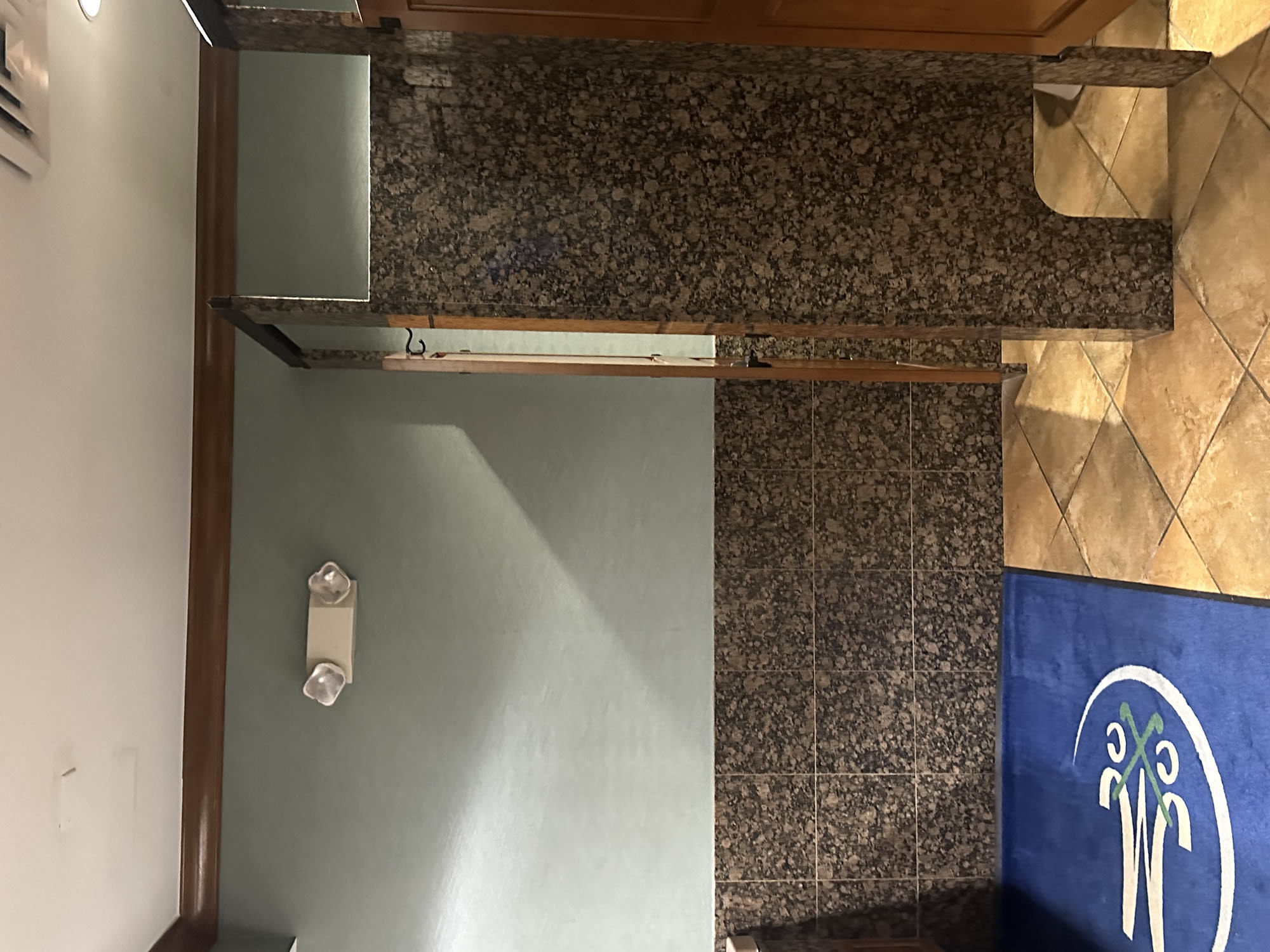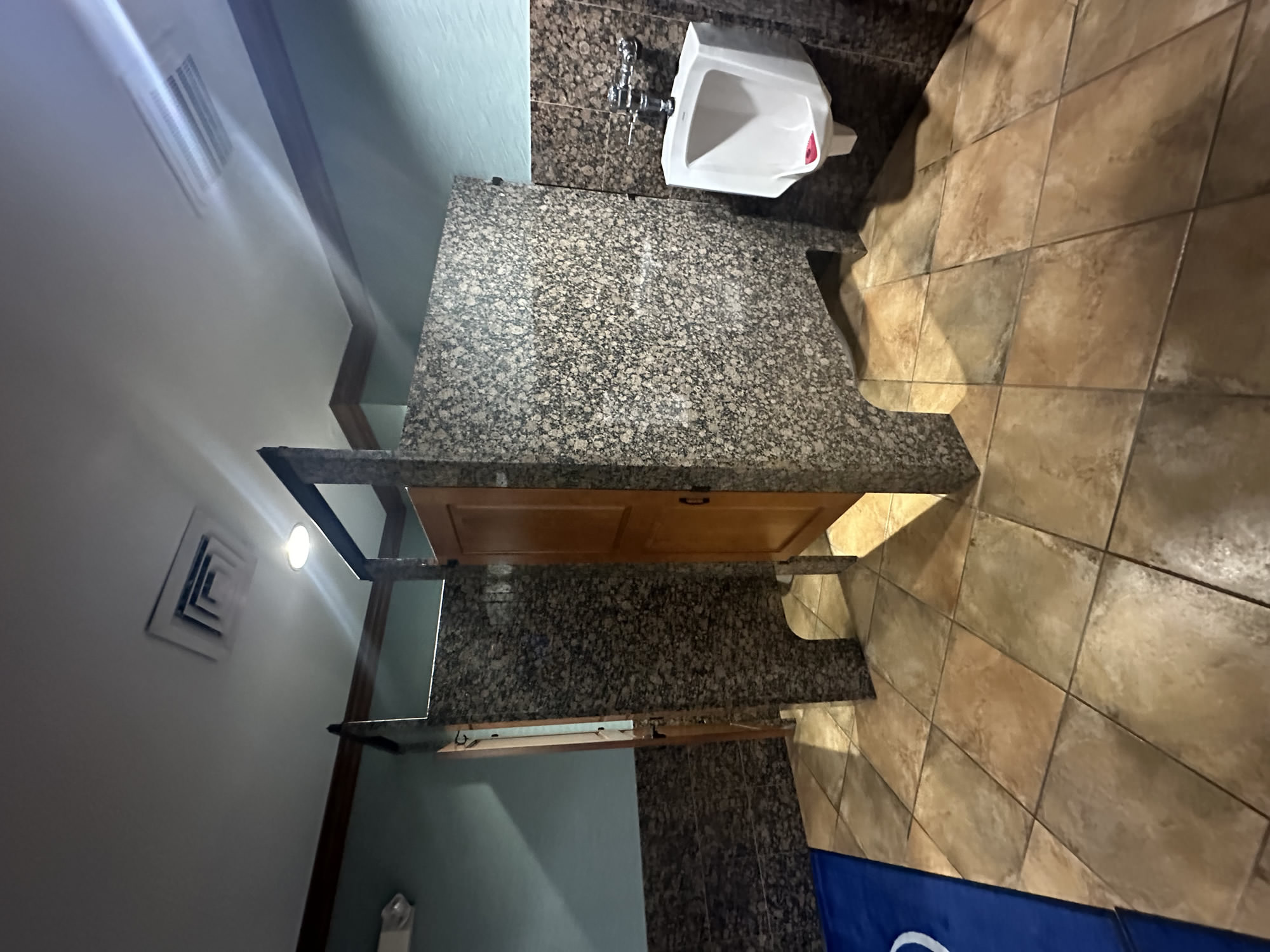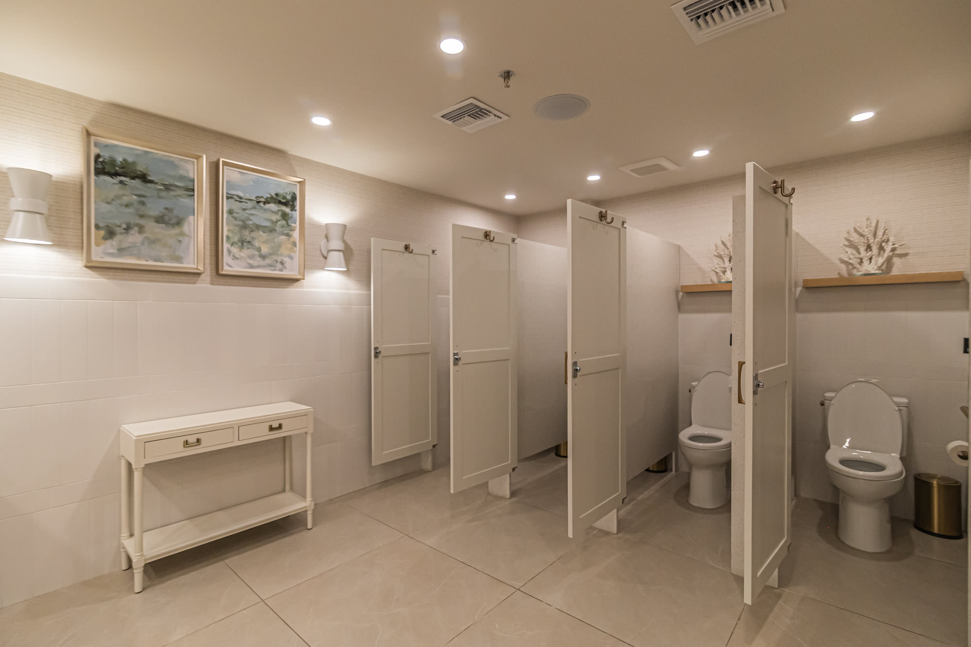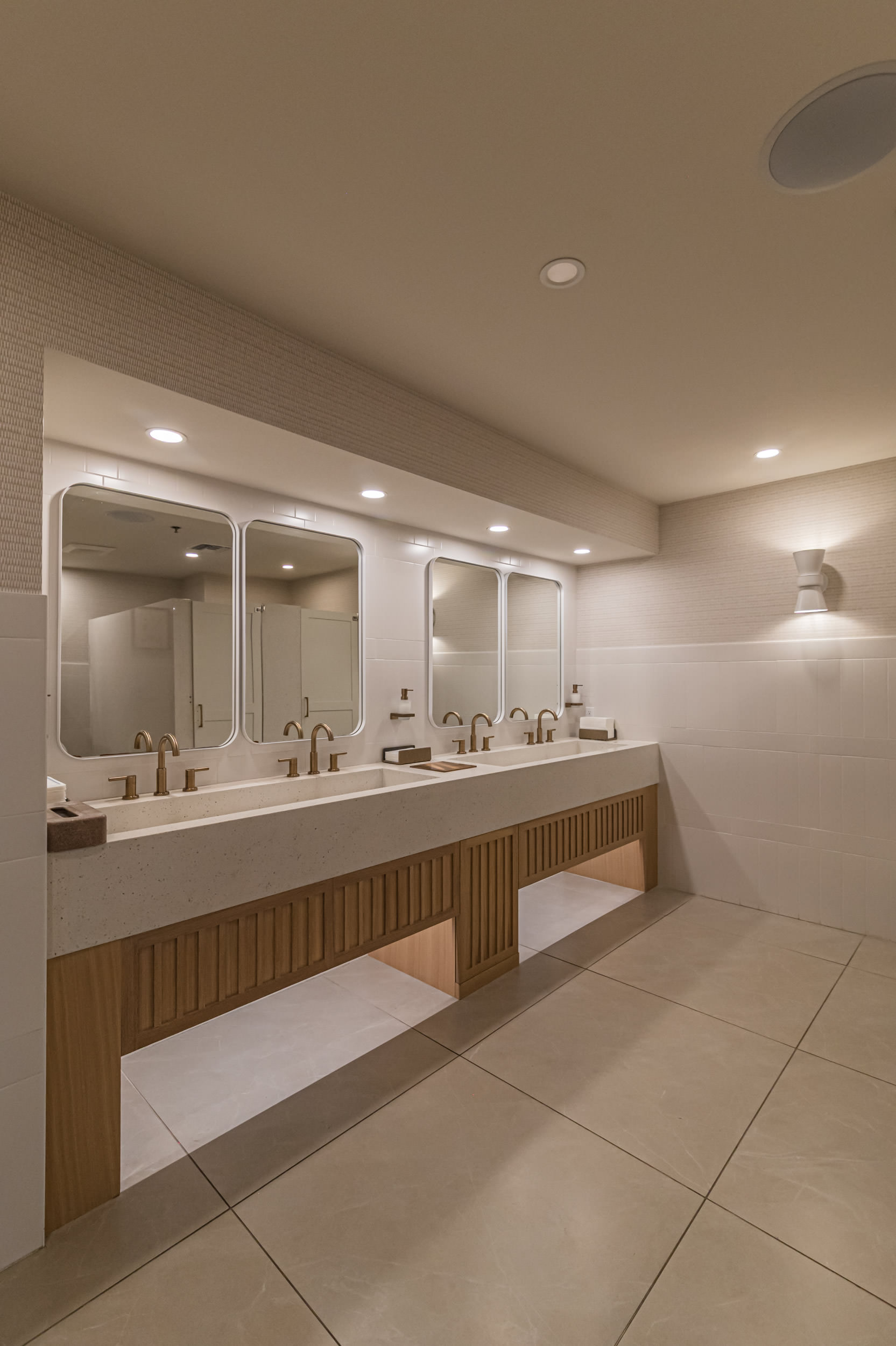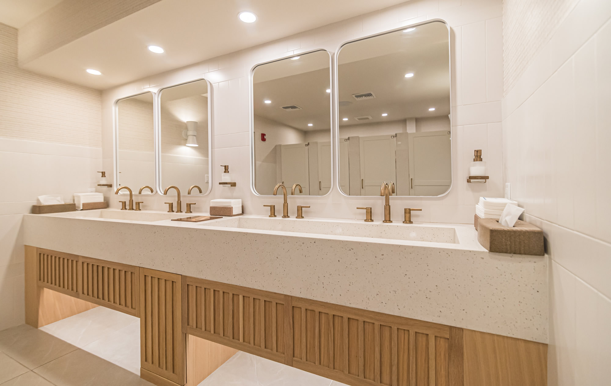 The former restrooms were dark and poorly lit. We transformed the space by adding lots of lighting including under vanity lights. A neutral palette of 33×33 Cristallo Beige porcelain tile on the floors, 4×16 Meringue Matte ceramic tile on the walls, and custom MSI Ice White quartz trough sinks helped brighten the space. A pop of color was introduced by using rift oak for the custom vanity and brushed gold faucets, soap dispensers, tissue holders, and hooks.