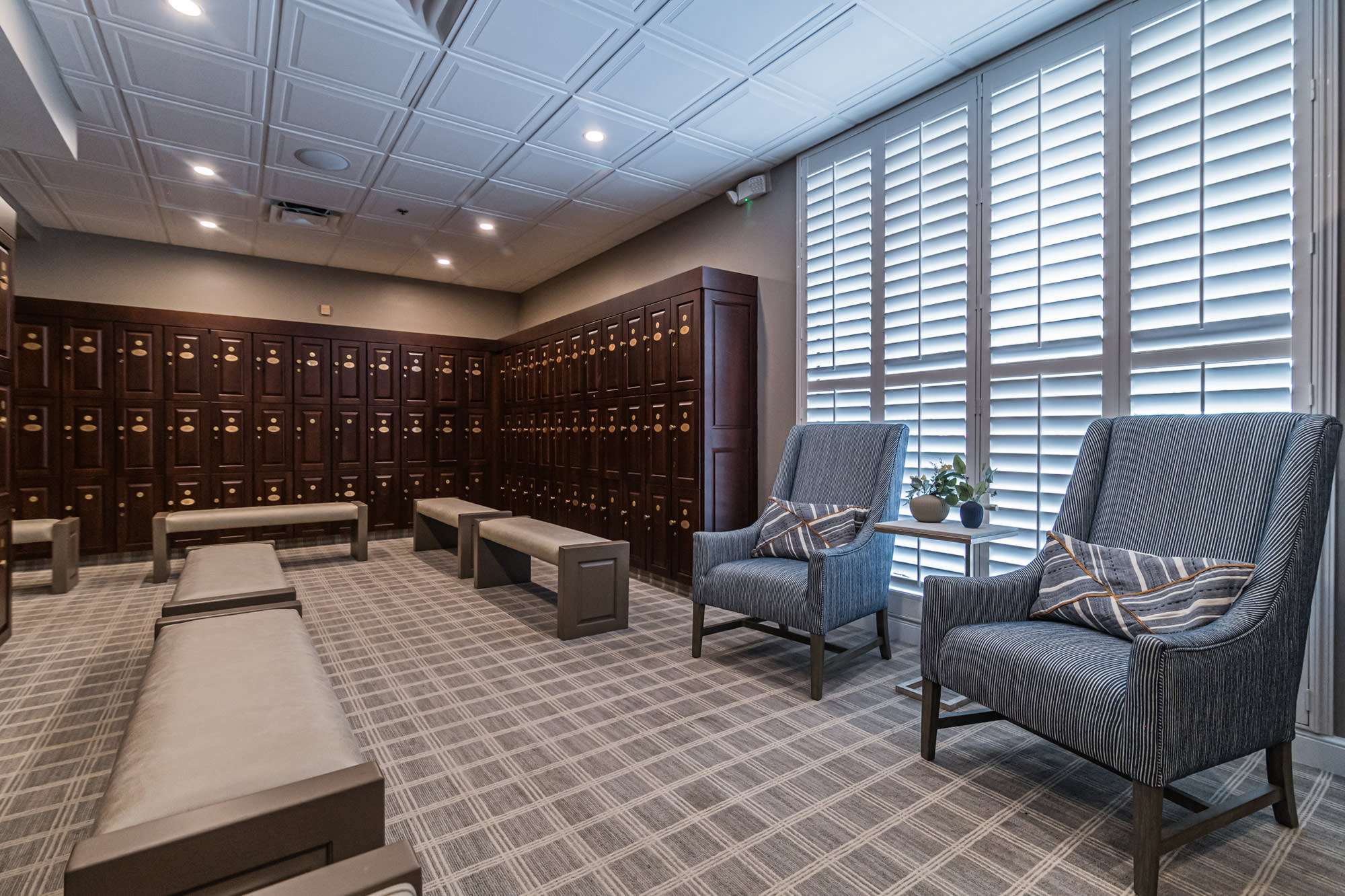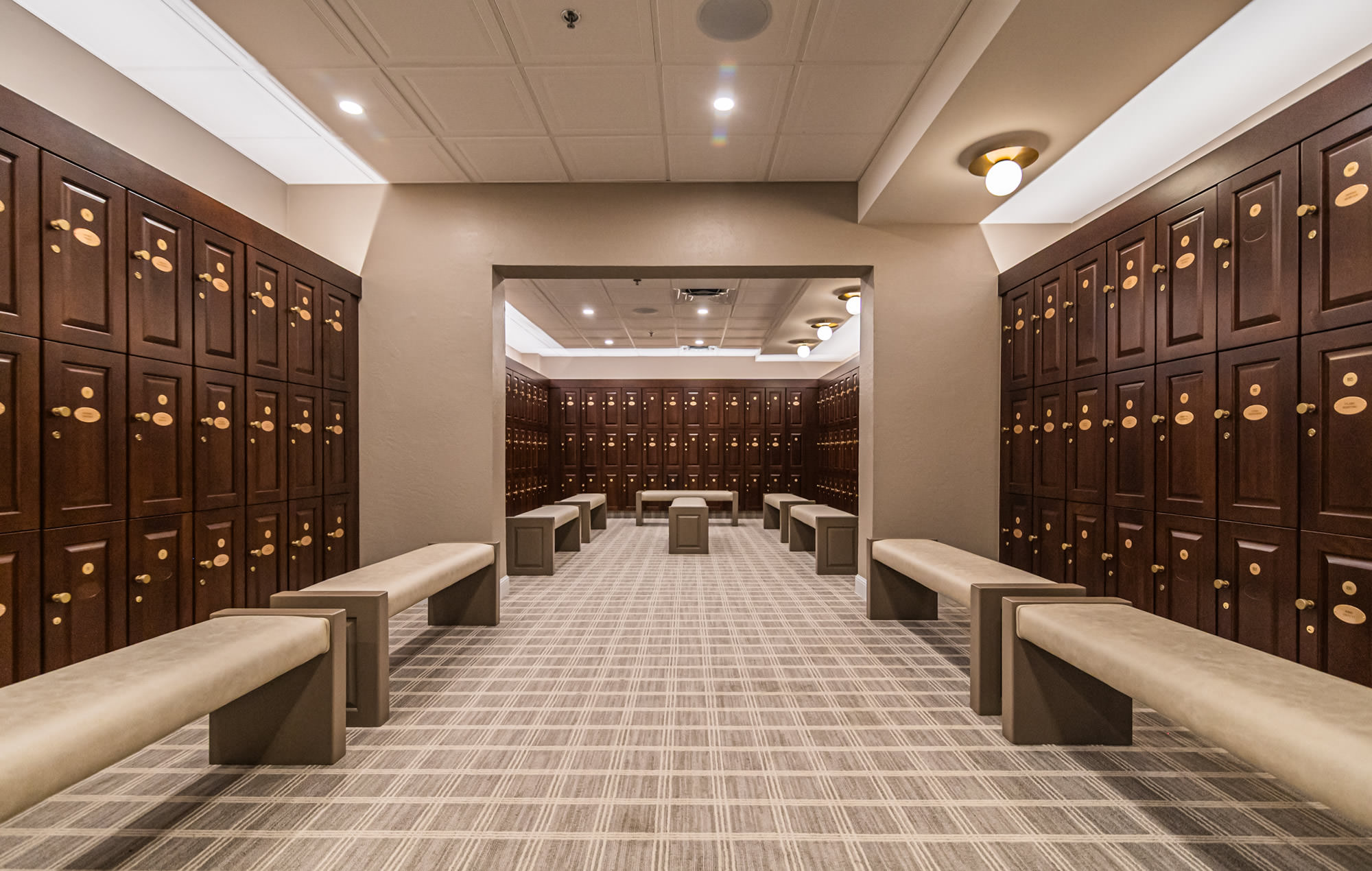 The locker rooms required complete renovation. However, due to the time constraints, the Board agreed to refresh the existing lockers. The locker doors were removed and prepped off site while the boxes were prepped on site. The final painting took place on site over several weeks. A dark stain color was used which complemented the new brushed gold hardware. Warm toned carpet and paint completed the space.
