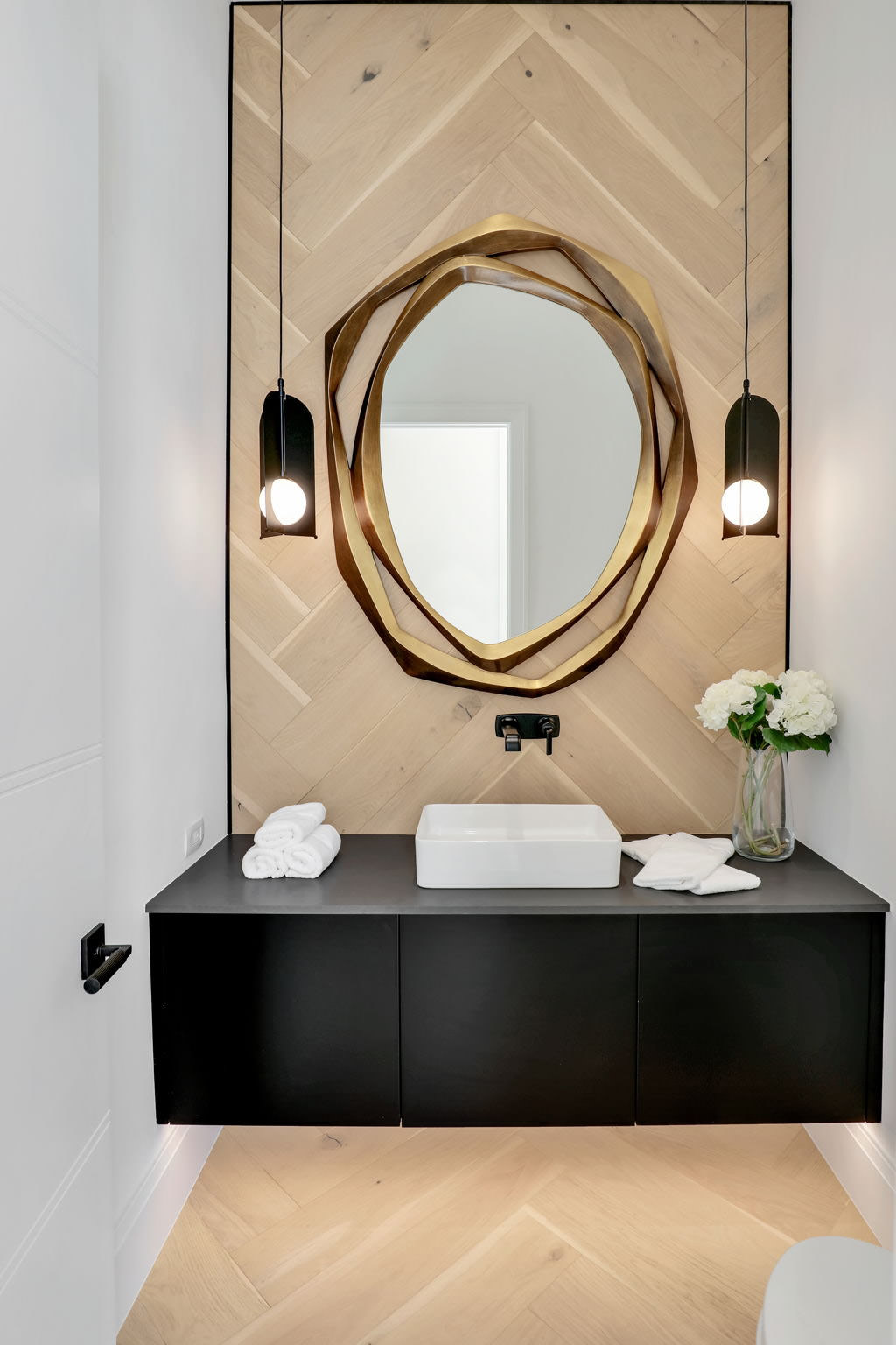 A dramatic vertical continuation of the herringbone patterned floor was custom-installed to wrap up the powder room wall, turning a traditionally utilitarian space into a statement of material artistry and bespoke detailing.