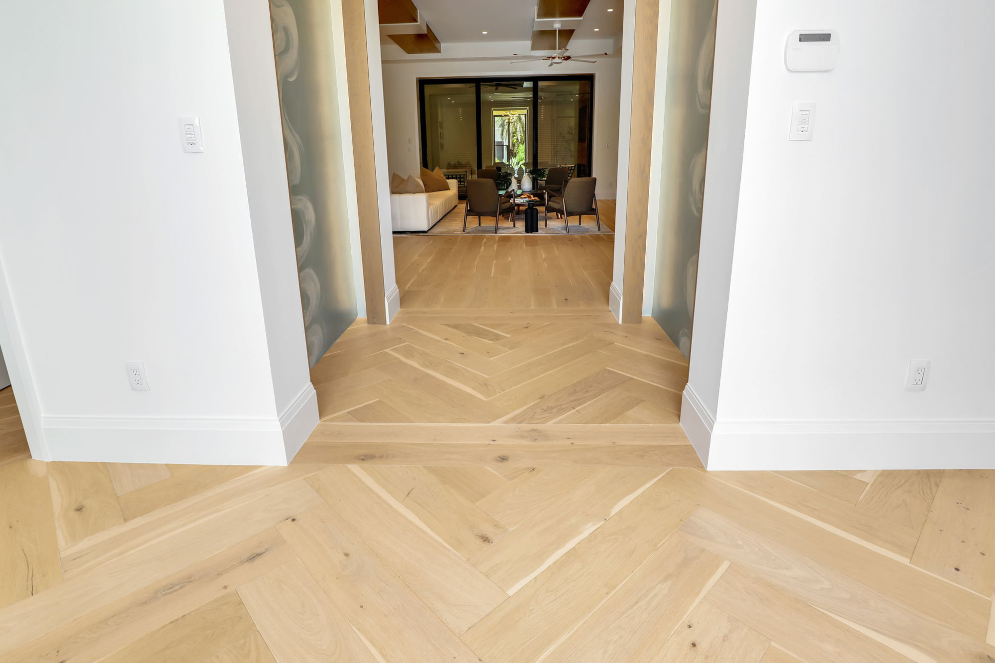 This custom wood flooring installation, completed in a high-end coastal residence in The Moorings, exemplifies the intersection of technical mastery, material excellence, and design-forward innovation. Spanning two stories and integrating a bespoke staircase, the project utilized premium European white oak—selected for its tonal richness, structural integrity, and timeless aesthetic.