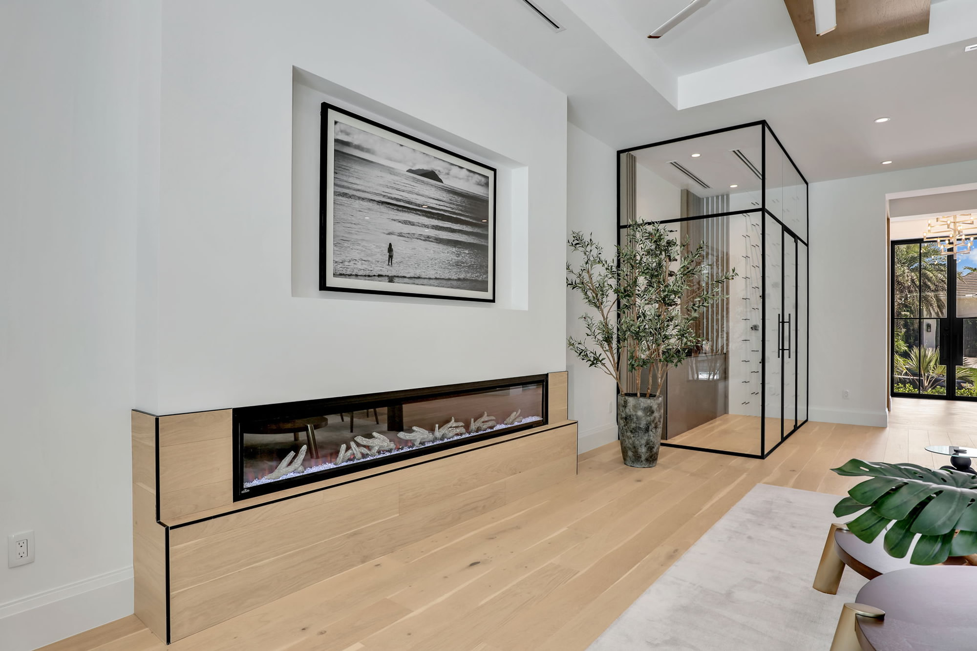 The fireplace was designed as a sculptural focal point, clad in precision-cut oak planks with black metal accents. The result is a warm yet bold centerpiece that ties together flooring, furnishings, and structural elements.