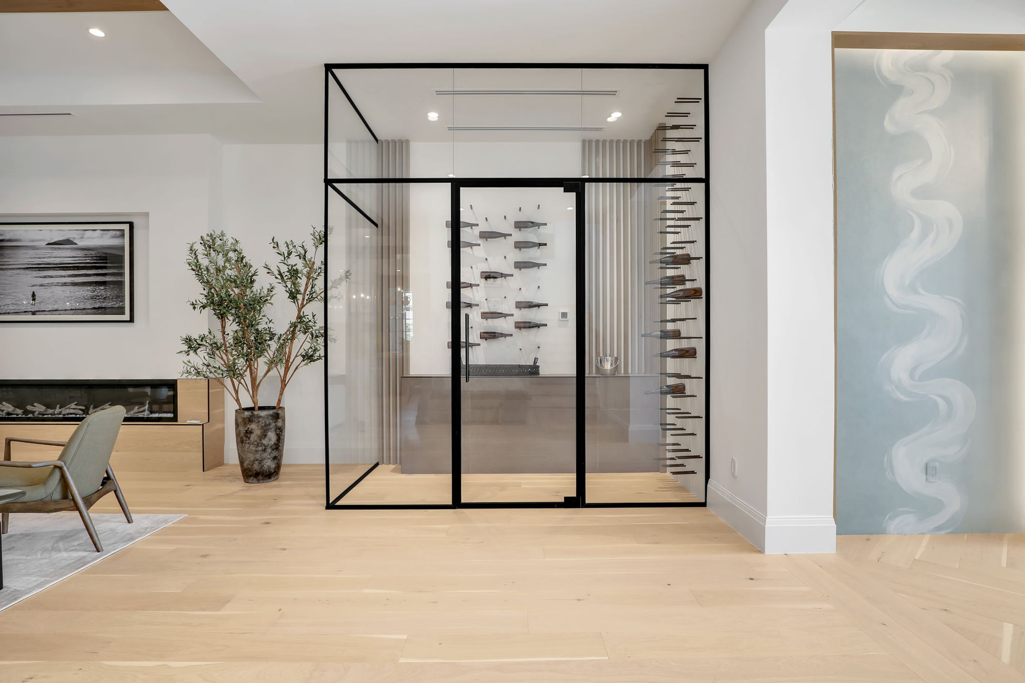 To ensure material continuity, the climate-controlled wine room was finished in matching oak. Every cut was tailored around glass walls, and environmental systems, preserving both aesthetics and function.